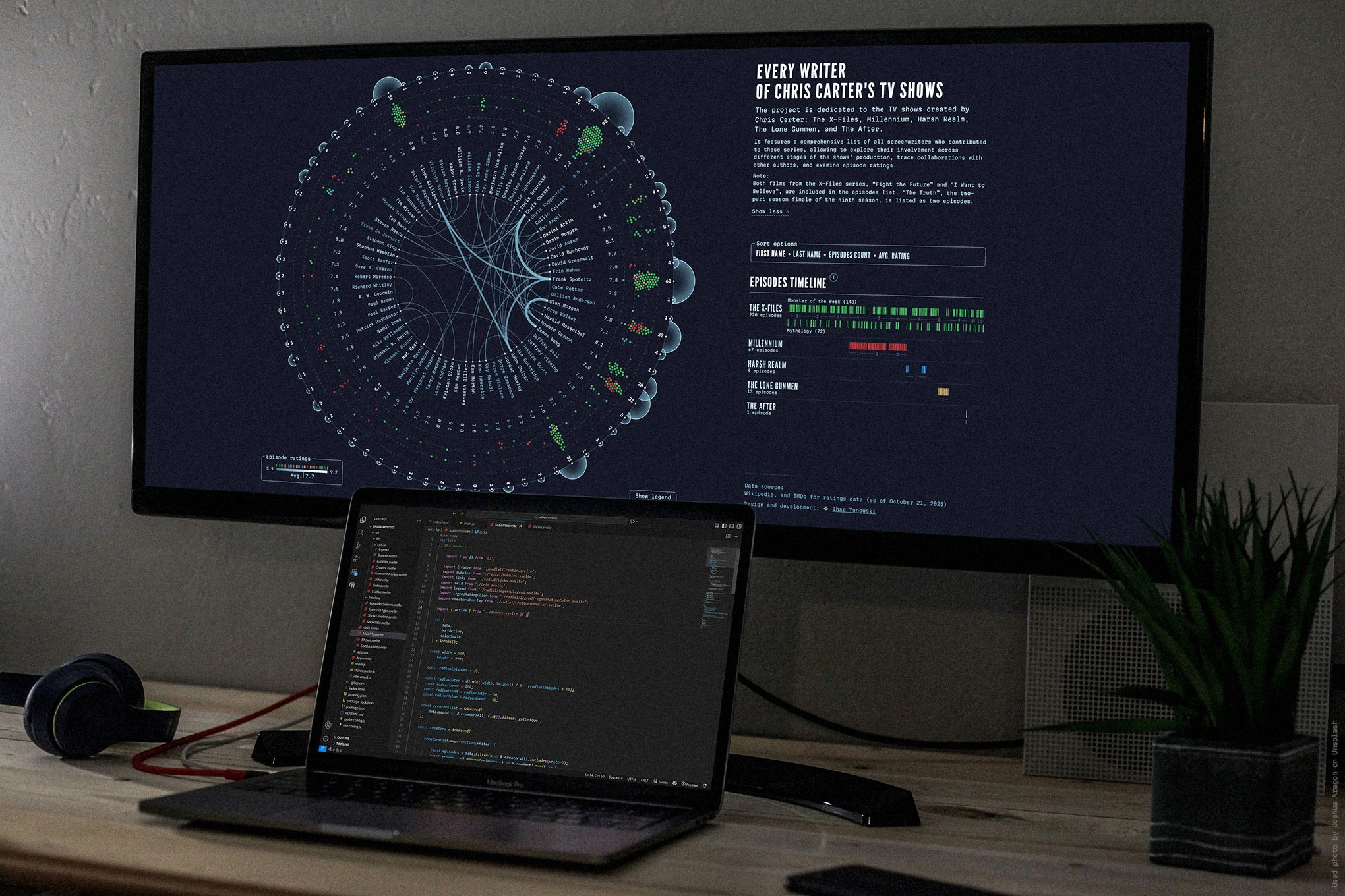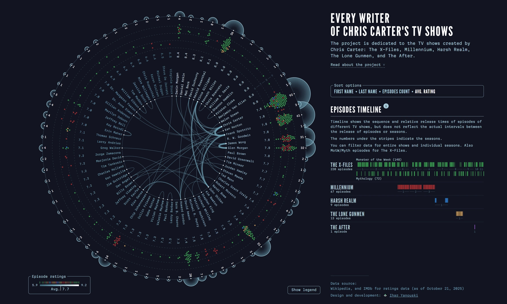 The interactive data visualization maps every writer who contributed to Chris Carter’s television universe. By connecting episodes to their authors across four major series, the project reveals patterns of collaboration, frequency of contribution, and cross-series involvement.