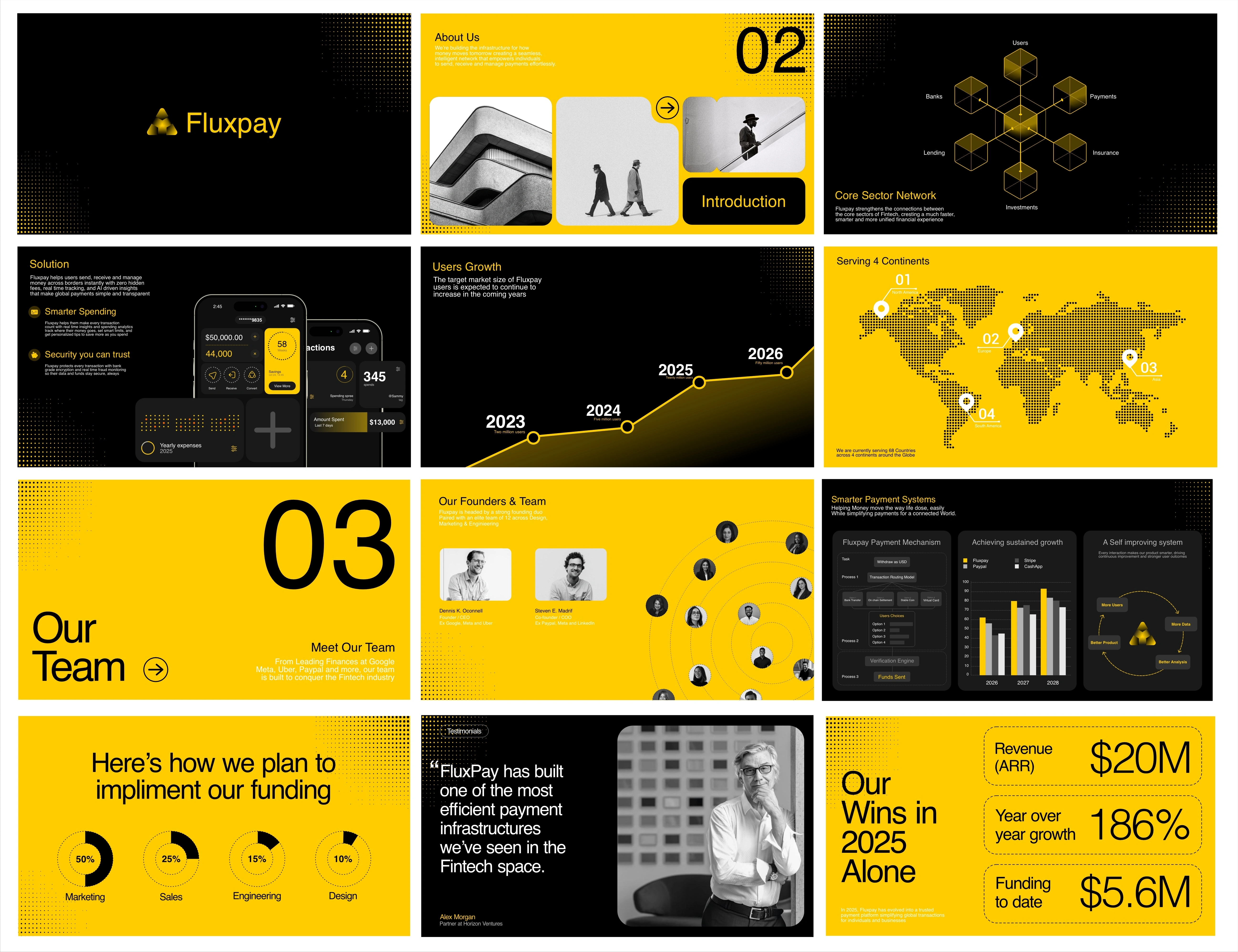 FluxPay, a fintech company simplifying global payments through intelligent, API-driven infrastructure, needed an investor-ready pitch deck to support their Series A fundraising and showcase their product’s scalability, traction, and market opportunity.
