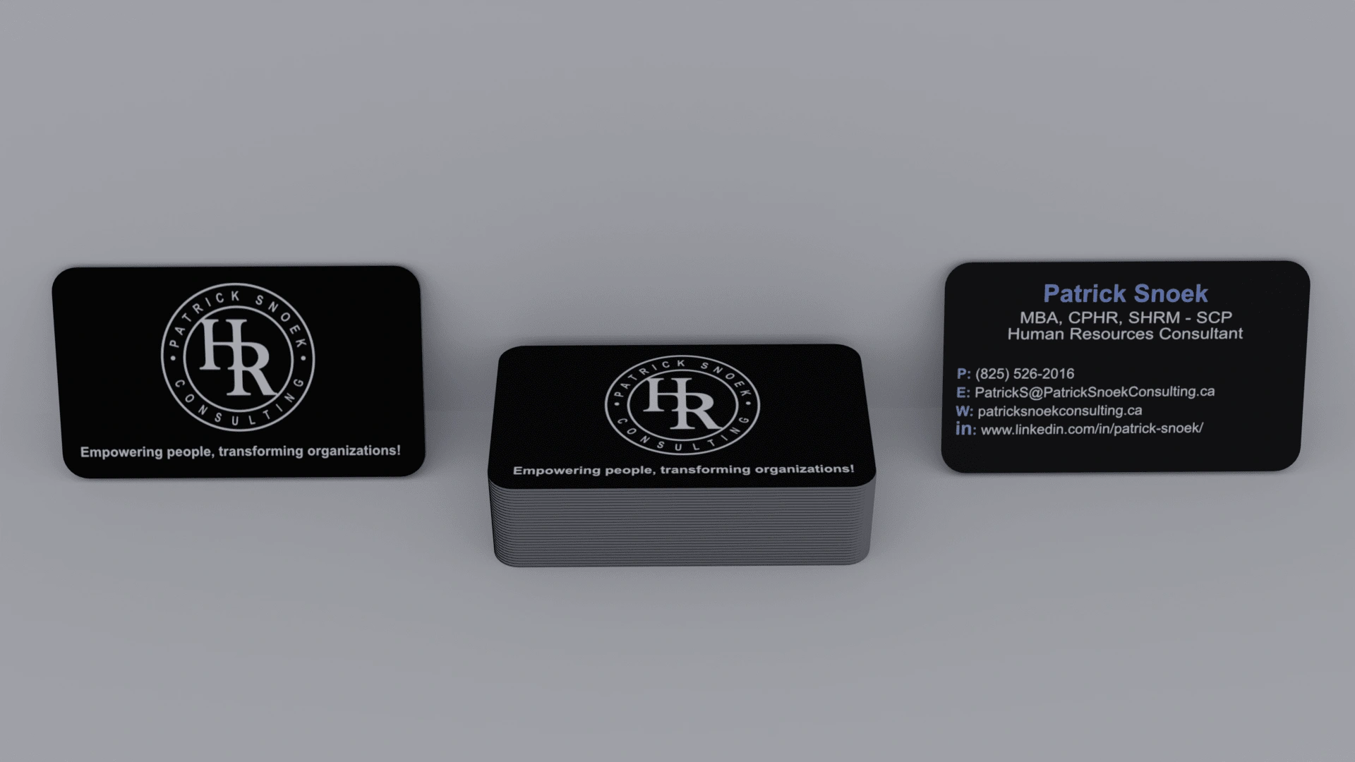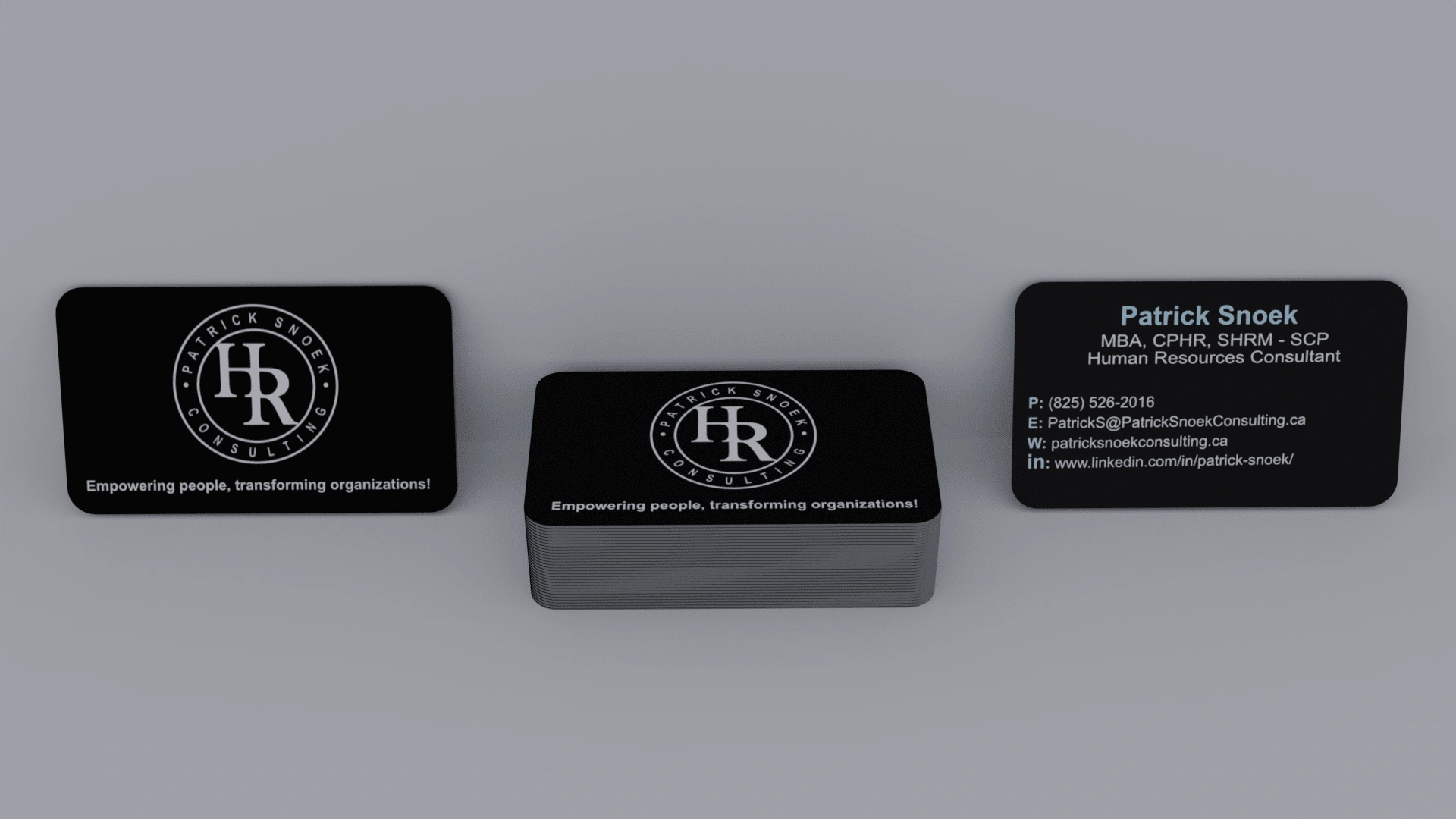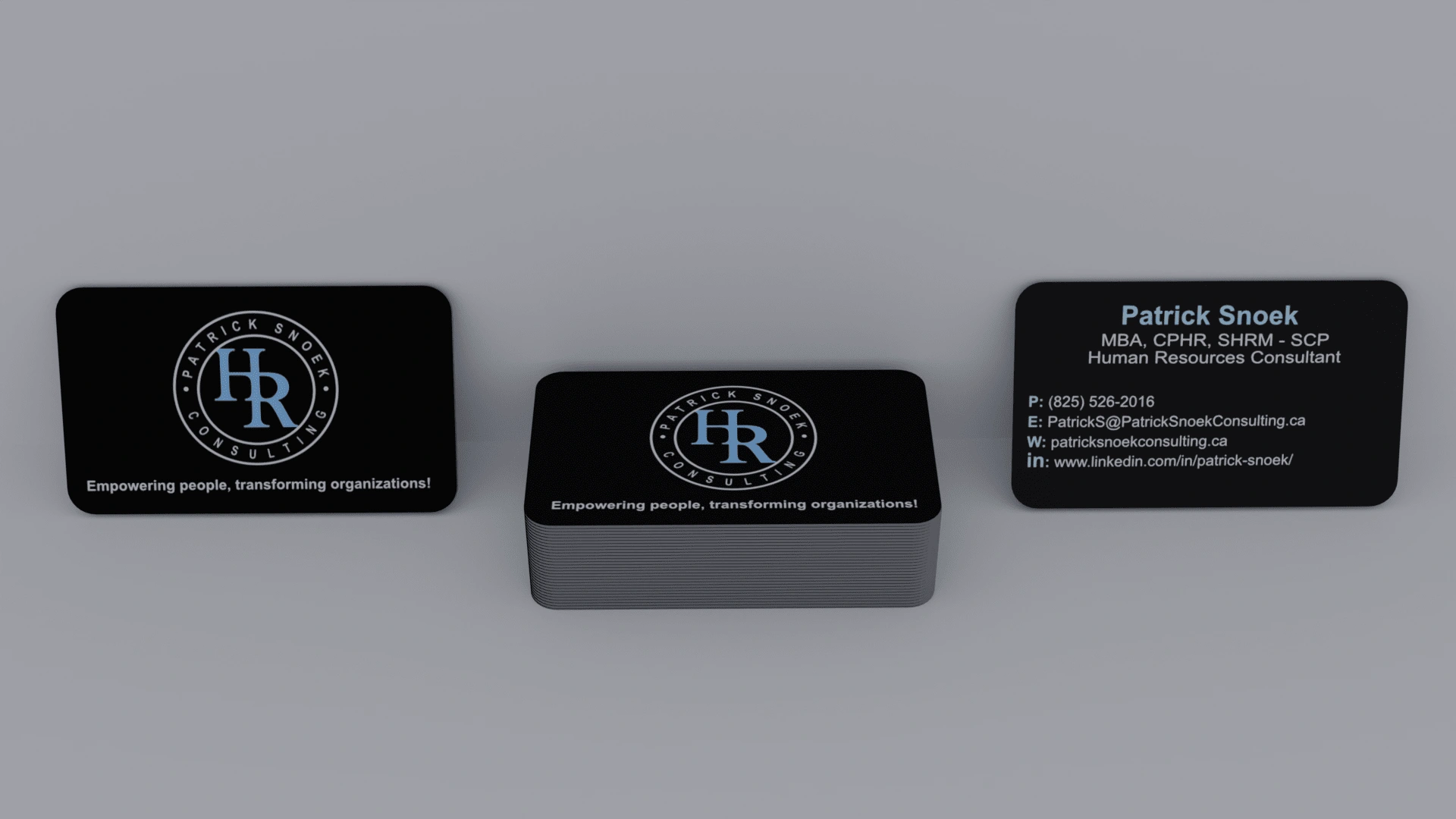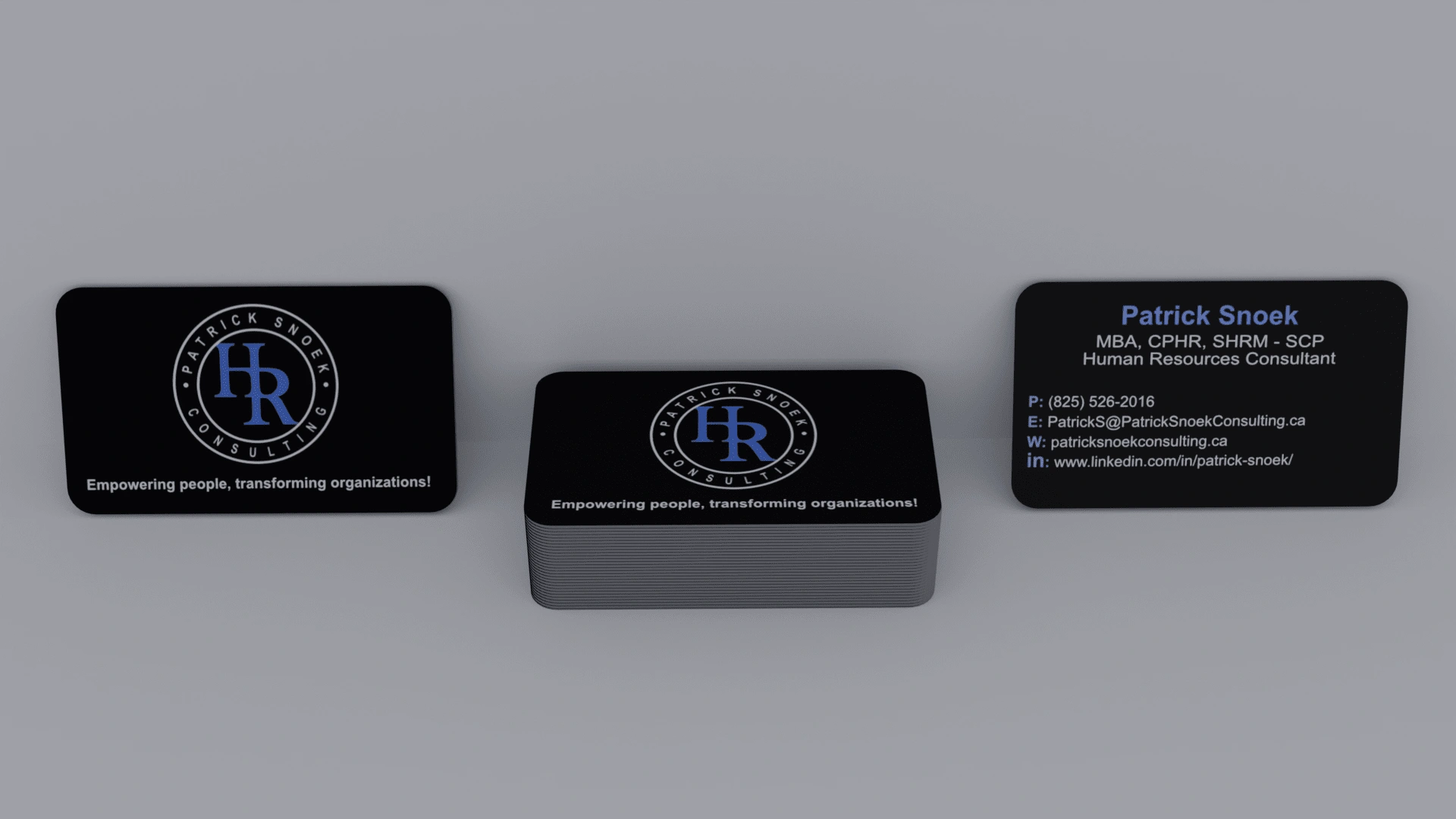 Business card designs for Patrick Snoek Consulting. Involved an updated logo, a company tag line, and legibility for Vista Print. (3d modelling not required)