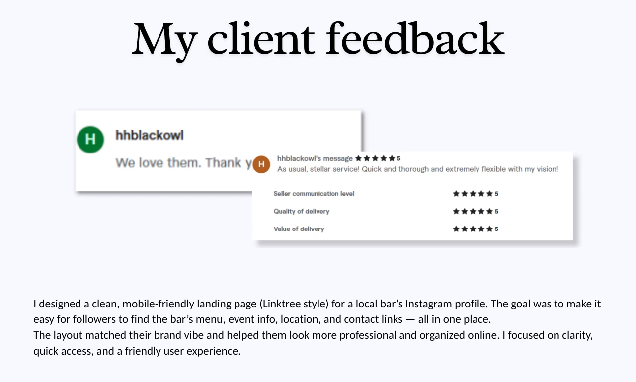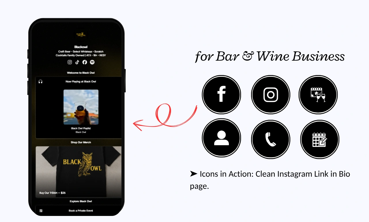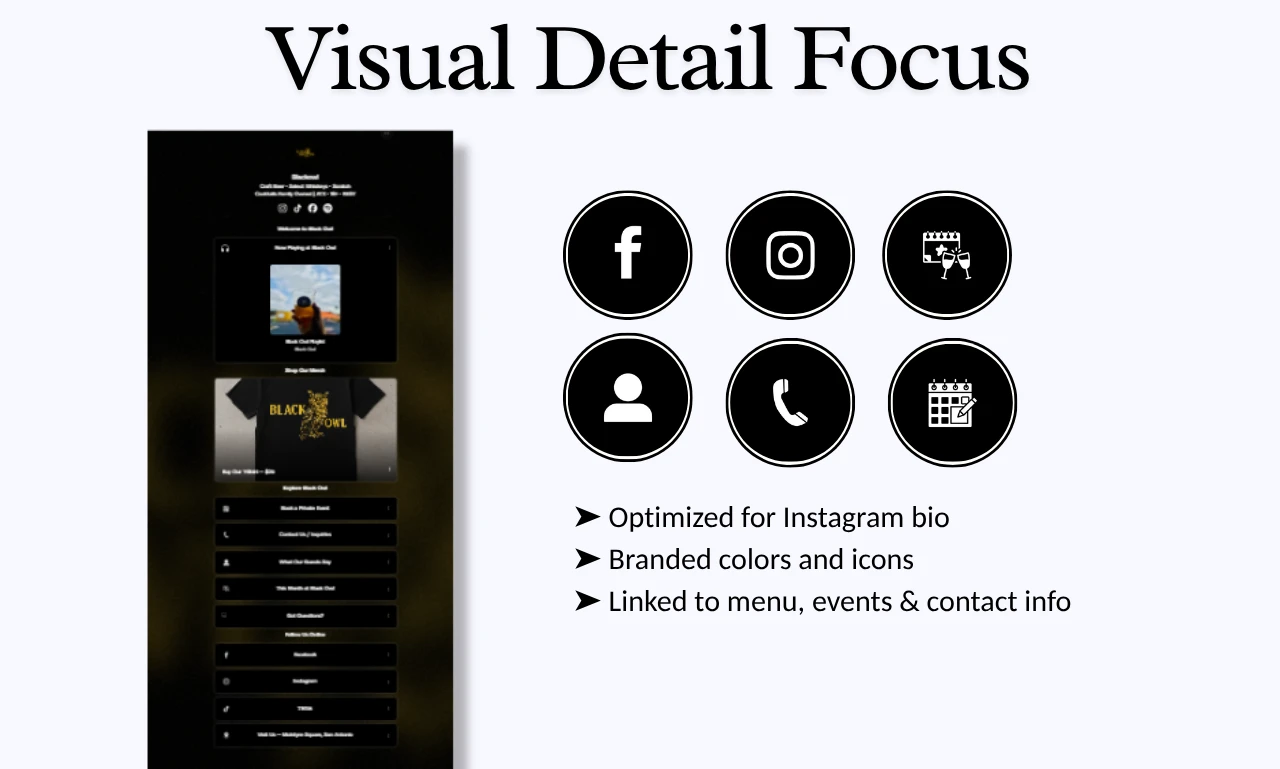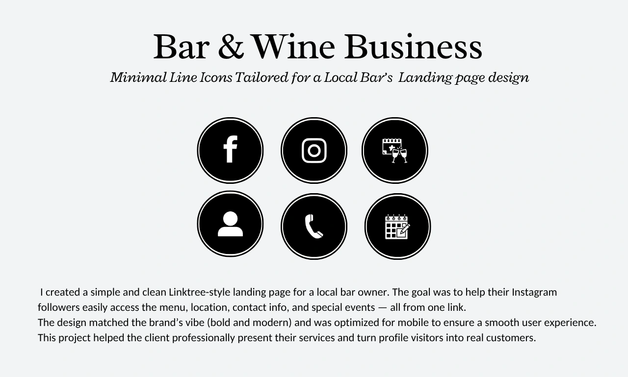 Designed a clean, mobile-friendly landing page for a bar’s IG bio—linking to menu, events & contact. Matched their brand vibe and improved visibility.