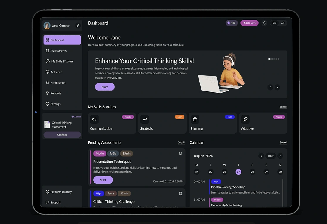 Elegant dark-themed learning platform dashboard designed for tablets. Features personalized skill tracking, assessment scheduling, and an intuitive interface.