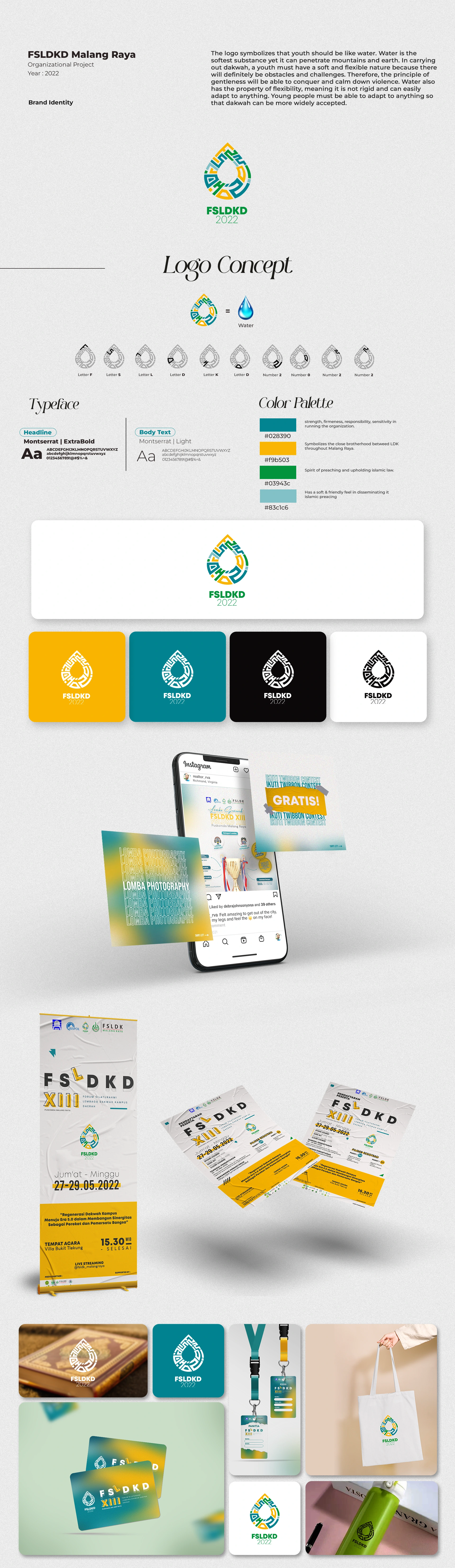 This project is a visual identity development for FSLDKD (Forum Silaturahmi Lembaga Dakwah Kampus Daerah) in 2022. The main logo takes the form of a water droplet that abstractly and symbolically incorporates the initials "FSLDKD 2022," representing unity and the refreshing spirit of da’wah among university students. All branding elements are designed to strengthen the organization’s identity while supporting consistent visual communication across various media.