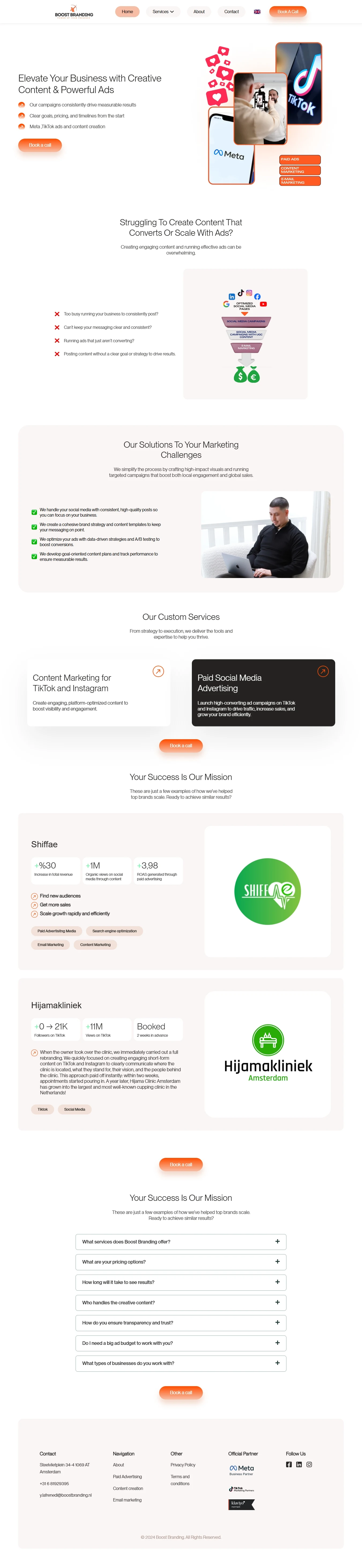 Solution: We designed a clean, conversion-oriented homepage in Figma that clearly communicated Boost Branding’s core services: paid advertising, organic growth, and brand promotion. The layout included clear CTAs, service breakdowns, testimonials, and a strong local identity.