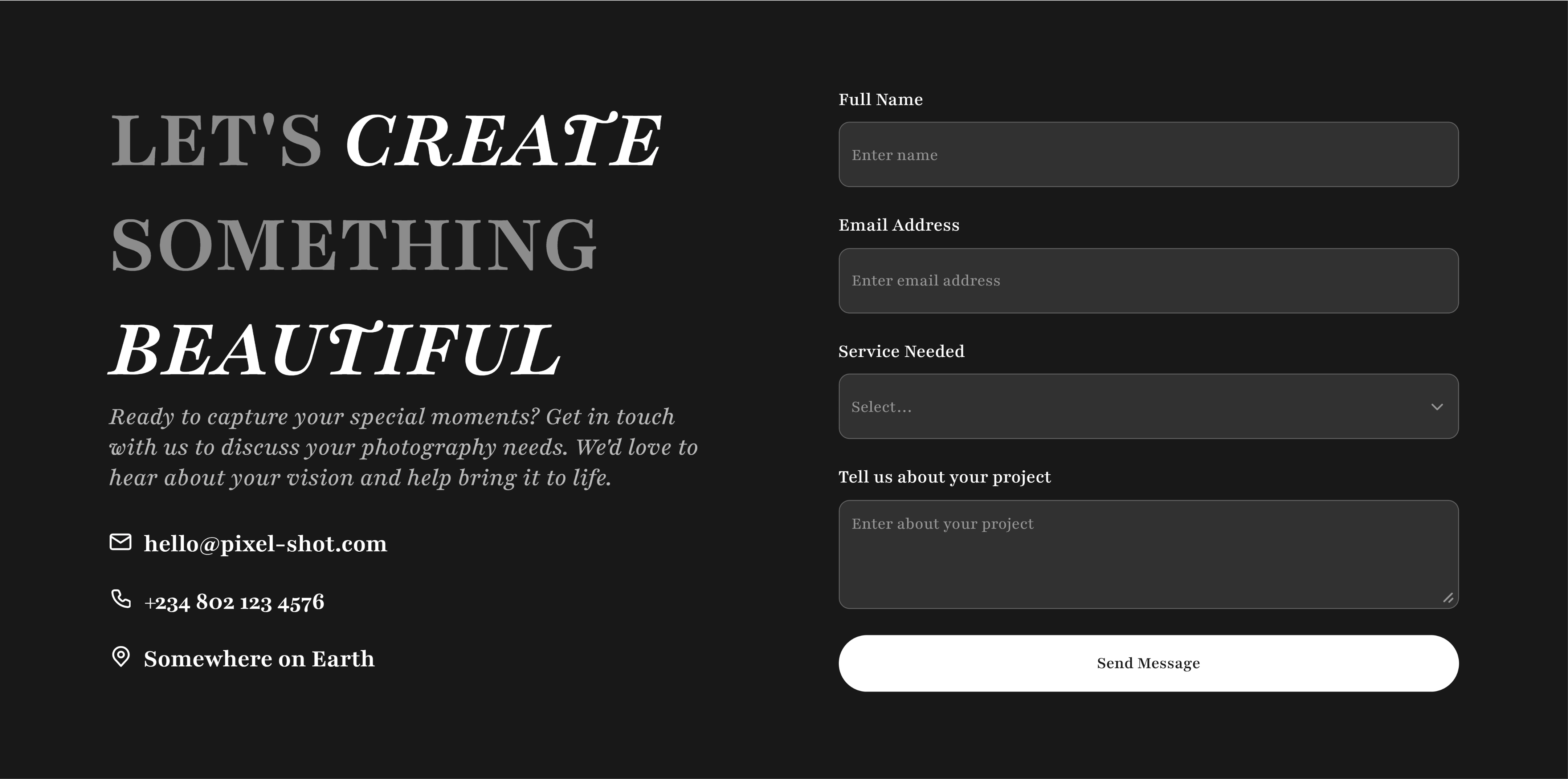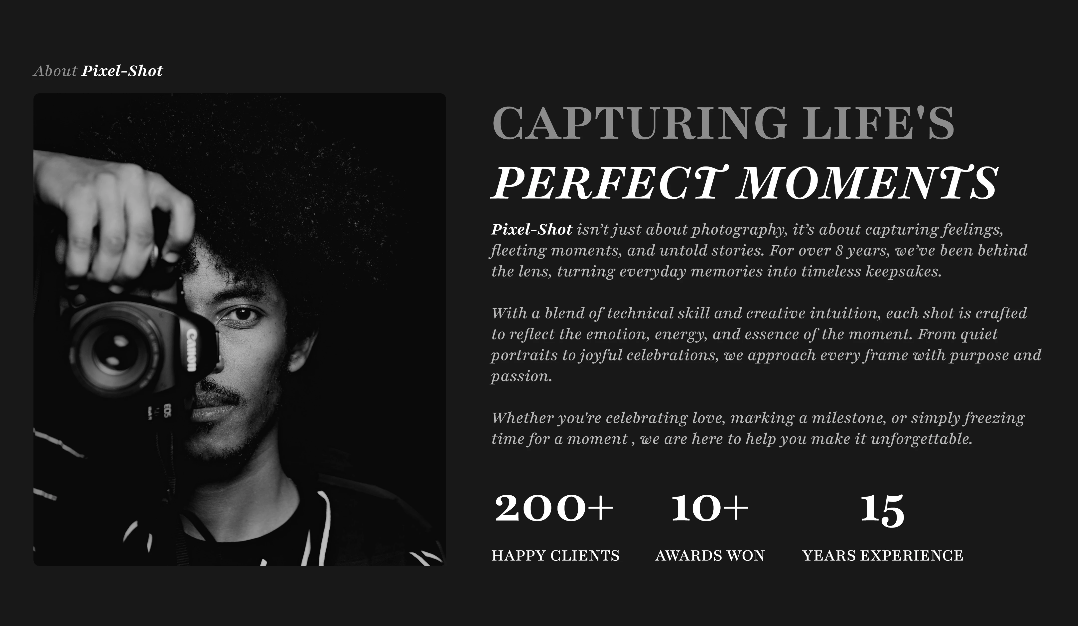 I designed a visually driven layout that balances strong imagery with clear narrative sections, allowing Pixel-Shot’s work to speak while guiding users through the brand story. Thoughtful spacing, typography, and hierarchy were
