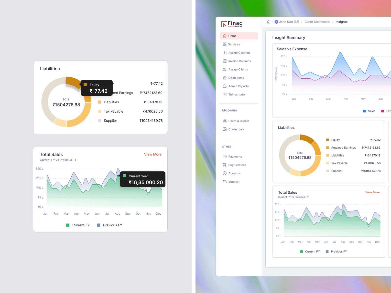 Users struggled to understand their financial position due to scattered data, dense tables, and lack of visual clarity. The challenge was to consolidate sales, expenses, assets, and liabilities into a single, digestible view without overwhelming the user.