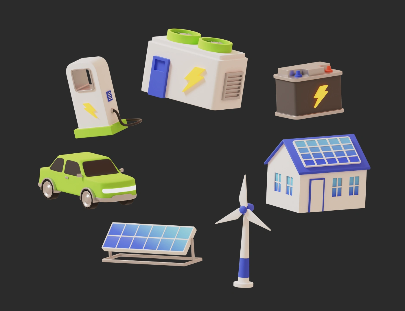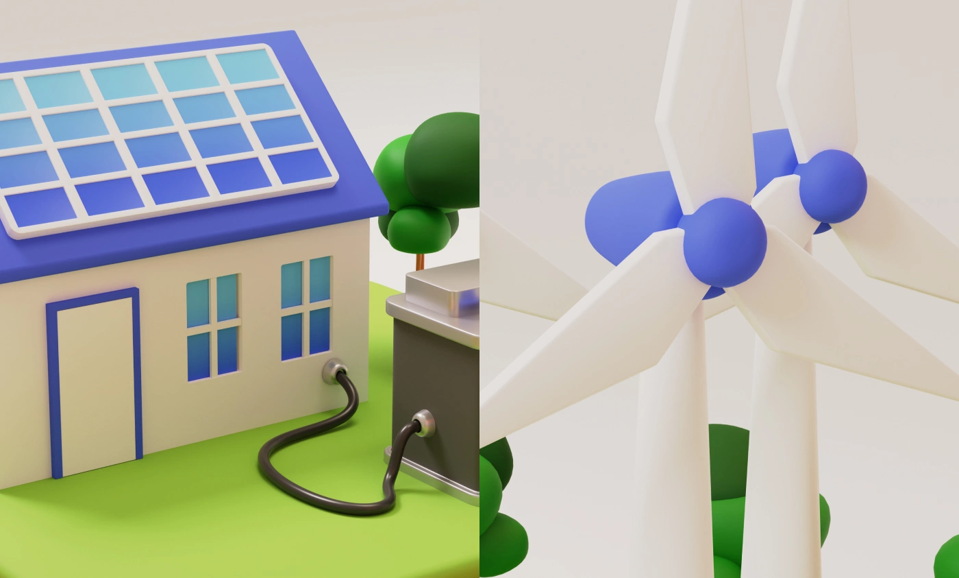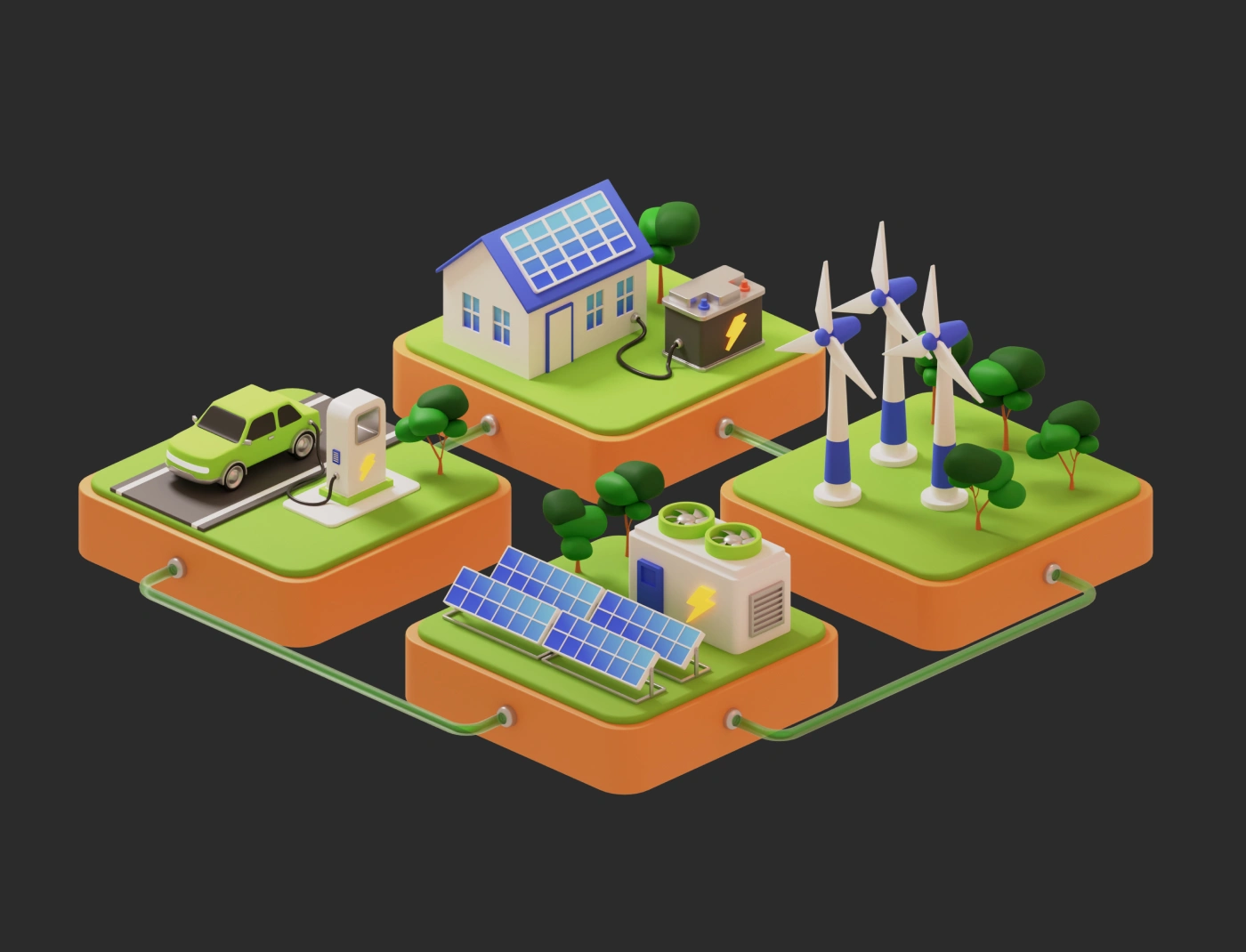 This 3D isometric illustration visualizes a modern, sustainable energy system where homes, vehicles, infrastructure are all powered by clean renewable sources.