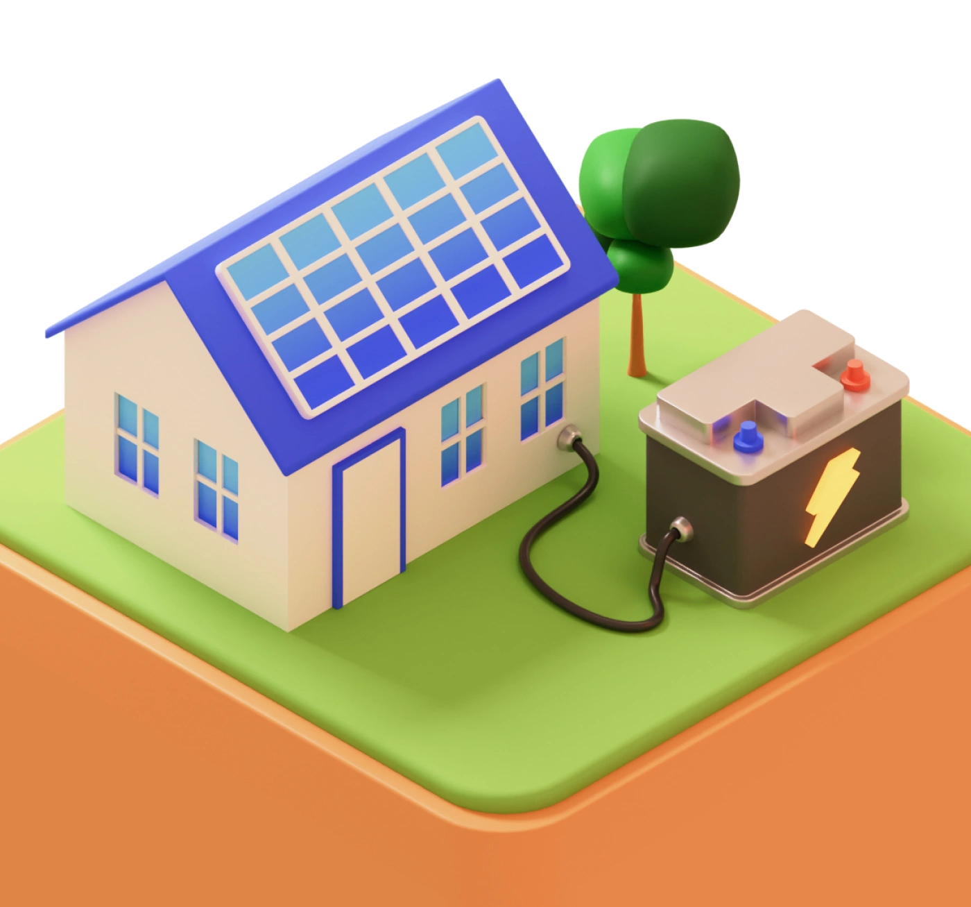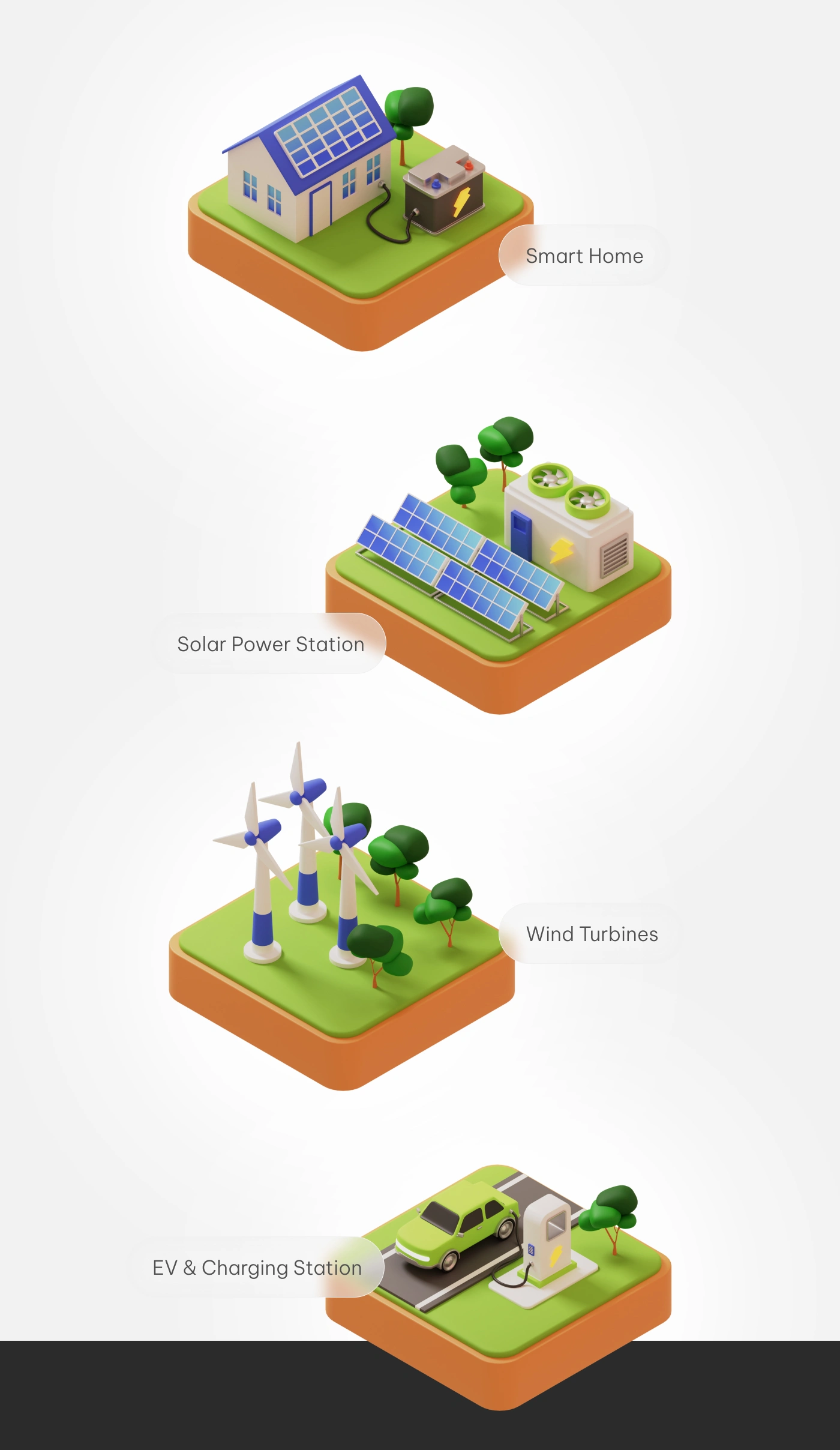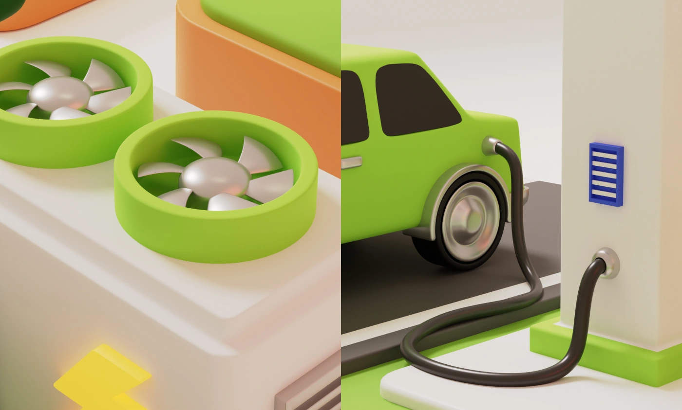 This 3D isometric illustration visualizes a modern, sustainable energy system where homes, vehicles, infrastructure are all powered by clean renewable sources.