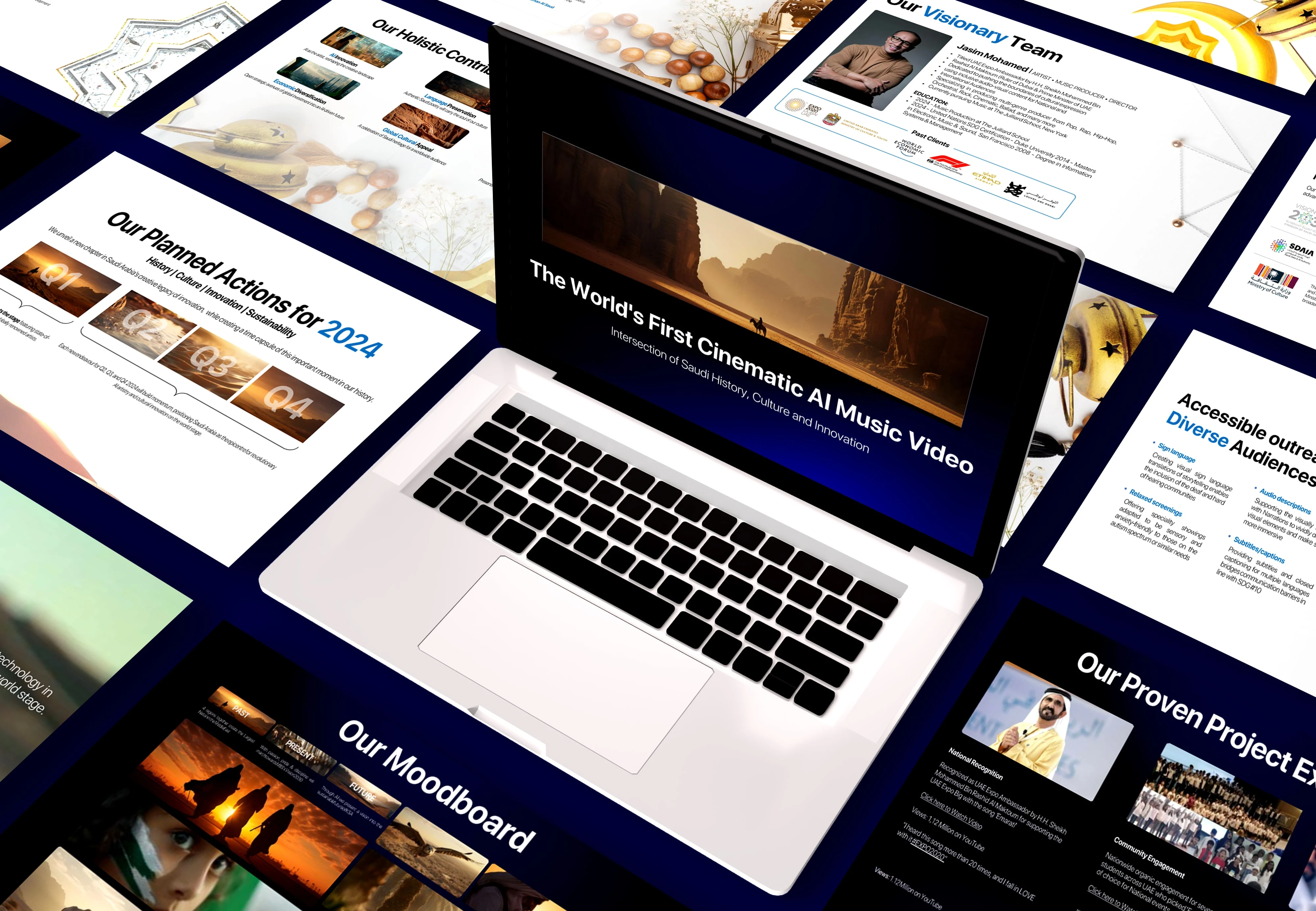 Successful pitch deck showcasing the world’s first cinematic AI music video, blending culture, history, & innovation with a polished, professional visual story.