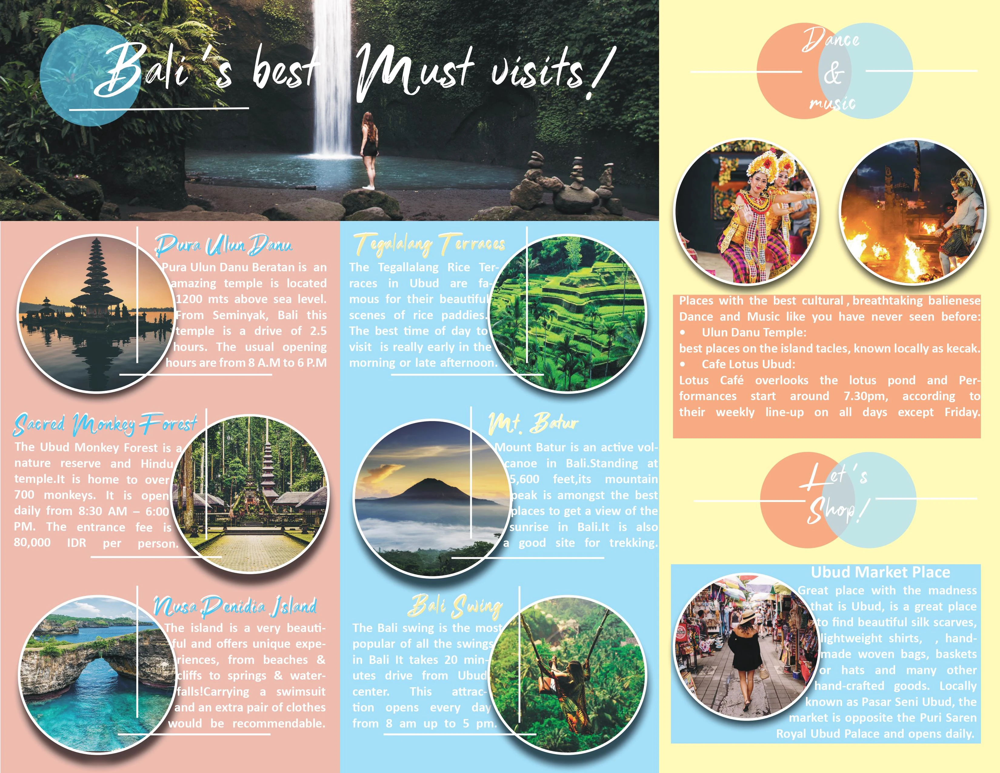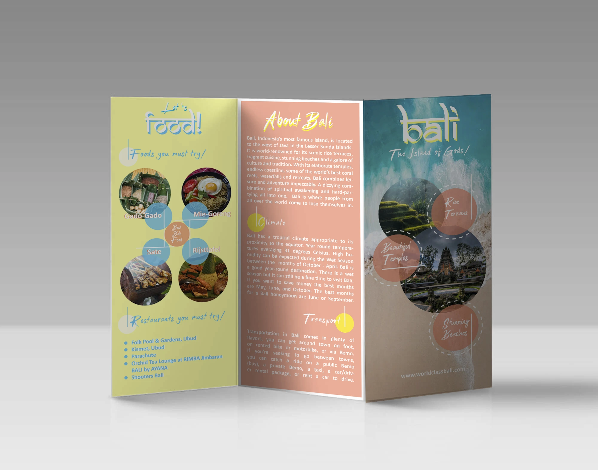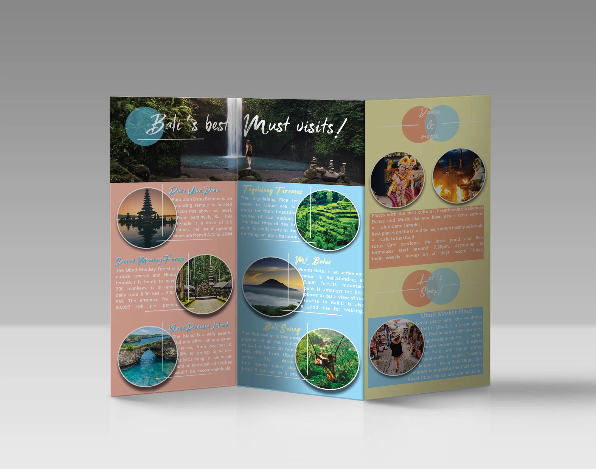 A travel brochure designed around Bali, combining vibrant visuals, curated content, and layout design to capture the island’s culture, charm, and experiences.