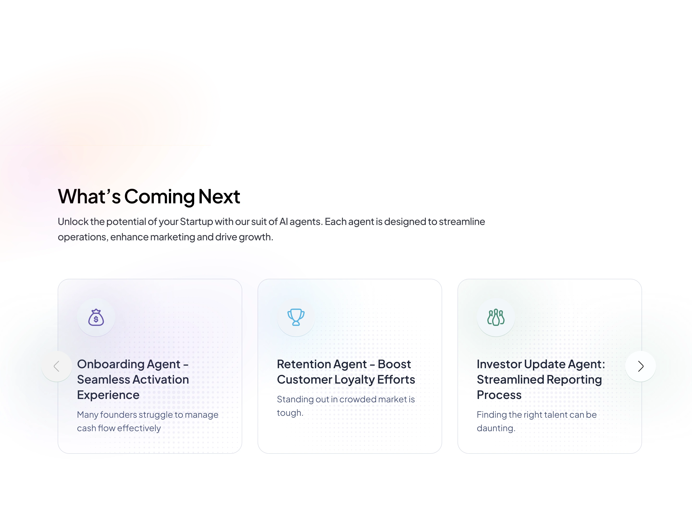 The final design delivers a clear story—AI Agents that help founders move faster without hiring overhead—presented through bold gradients, structured content blocks, and a narrative that moves users from curiosity to sign-up effortlessly.