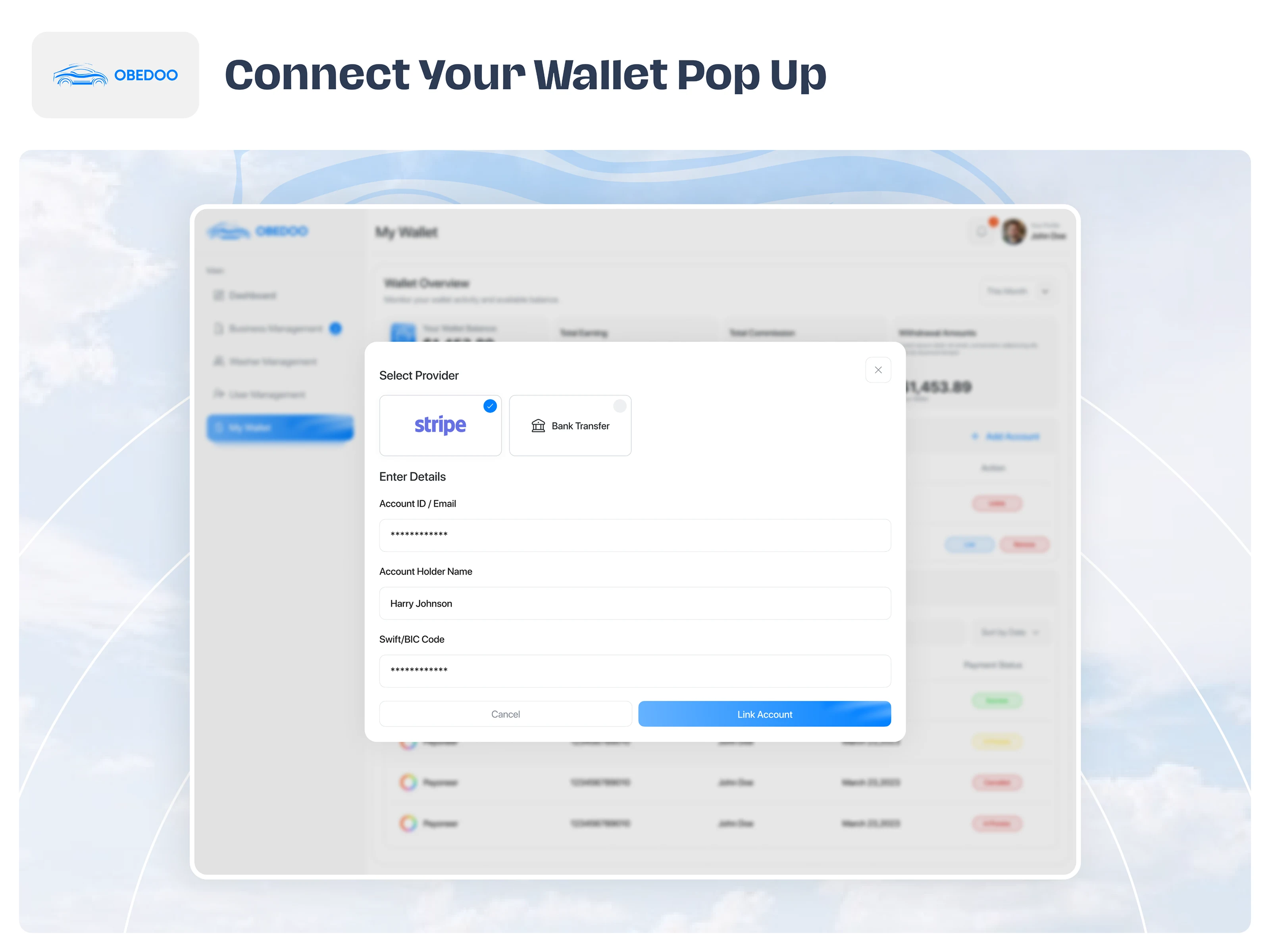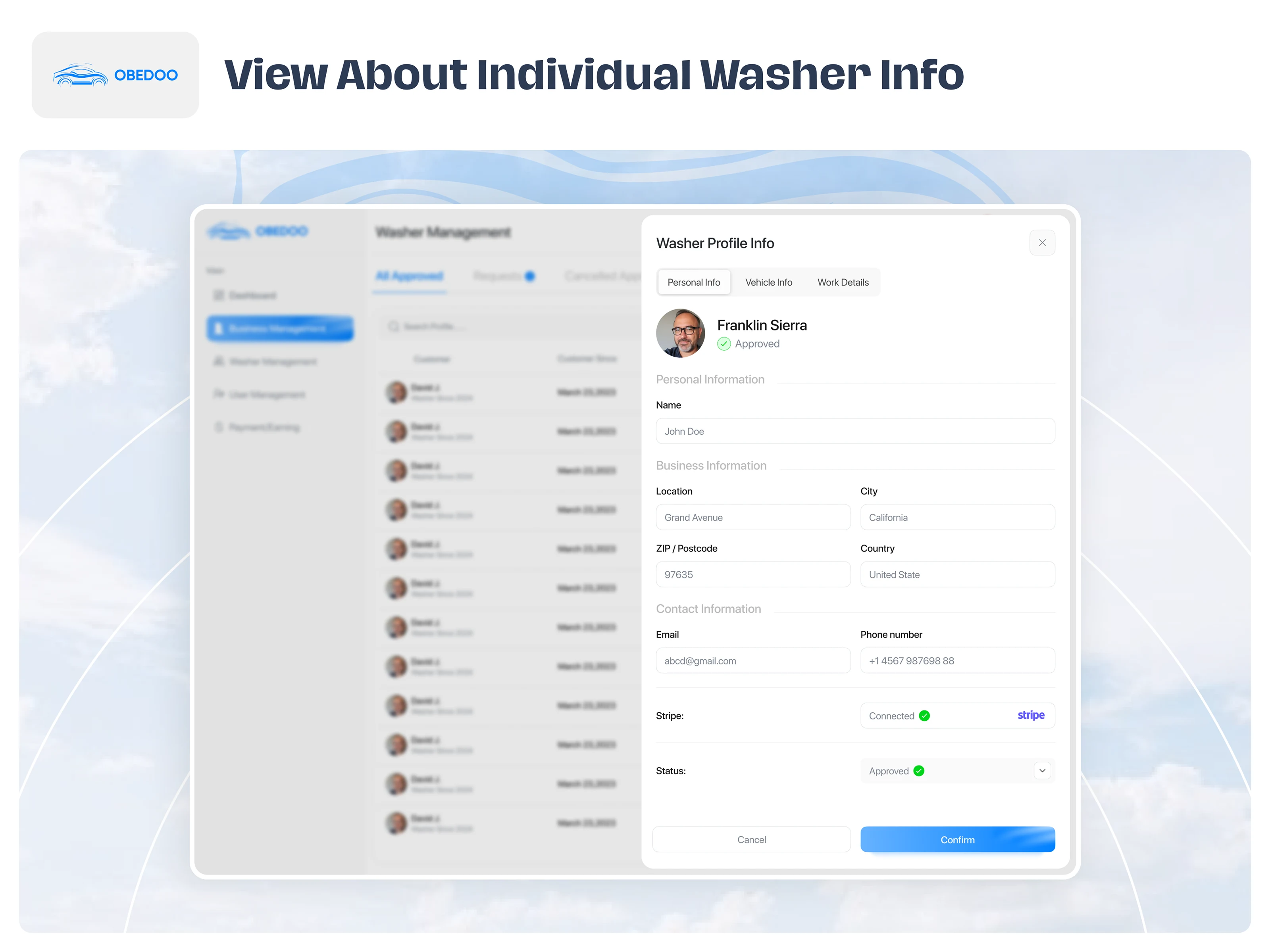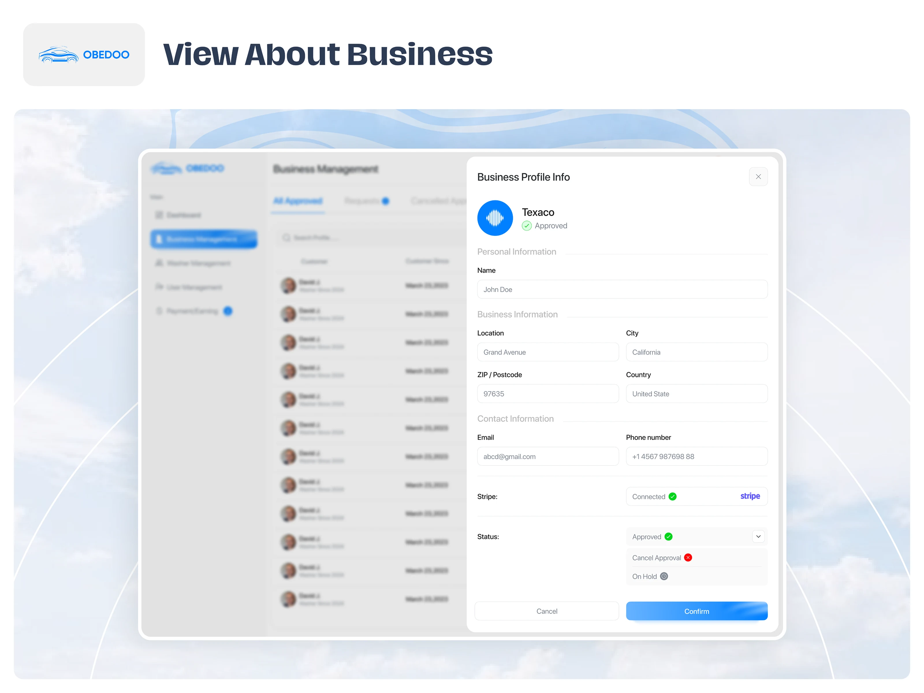 The View About Business screen for Obedoo provides a detailed modal interface for reviewing individual partner profiles and operational data. I designed this user interface to consolidate personal, business, and contact information into a single, high-clarity view for administrative verification.