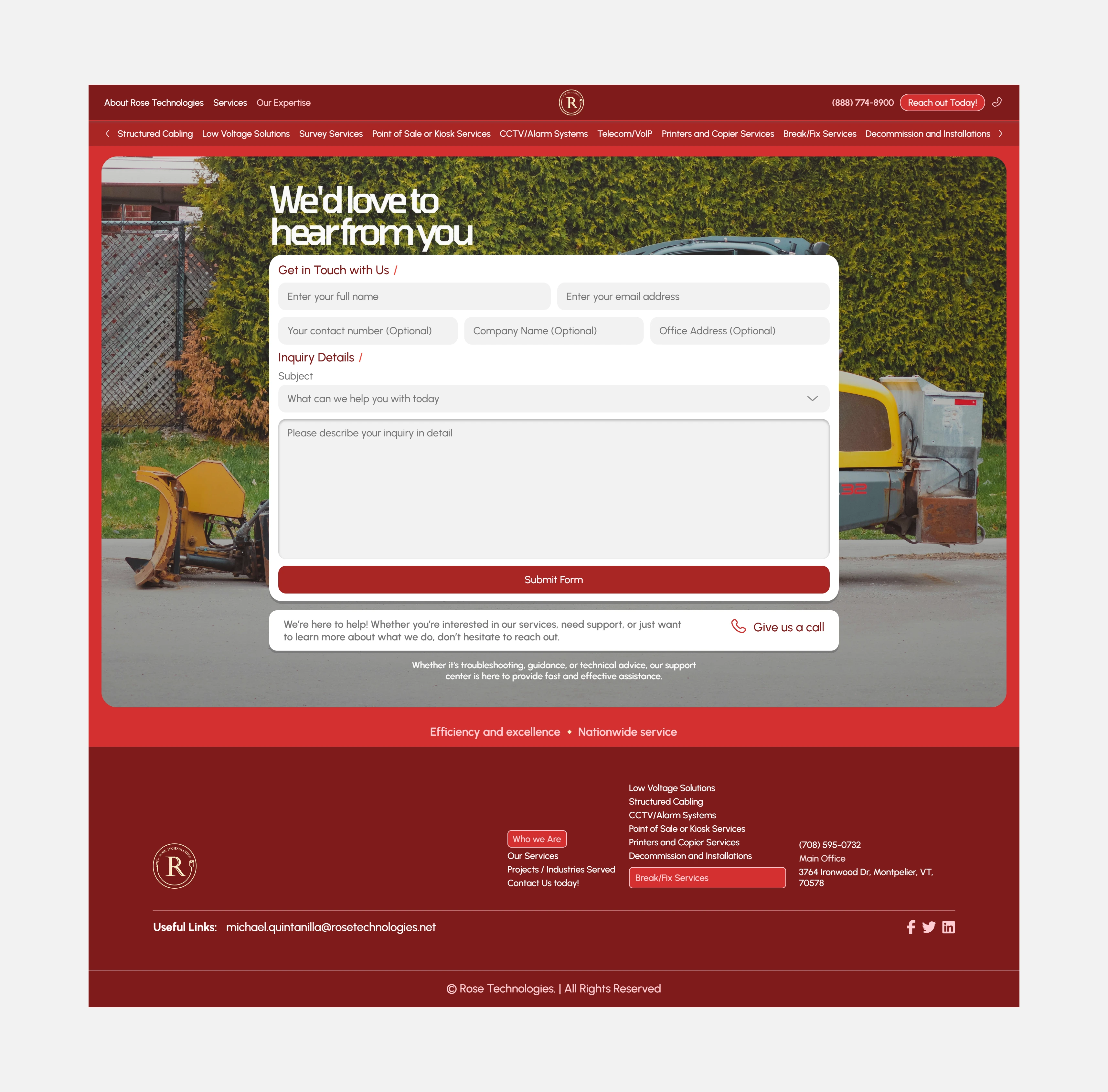 Based in Dyer, Indiana and founded in 2022, Rose Technologies is an IT services provider offering managed IT support, network infrastructure design, break/fix repair, structured cabling, CCTV and alarm installations, VoIP/telecom, printer/copier services, point-of-sale/kiosk setups, network refreshes, on-site surveying, and ICT decommissioning/installation services.