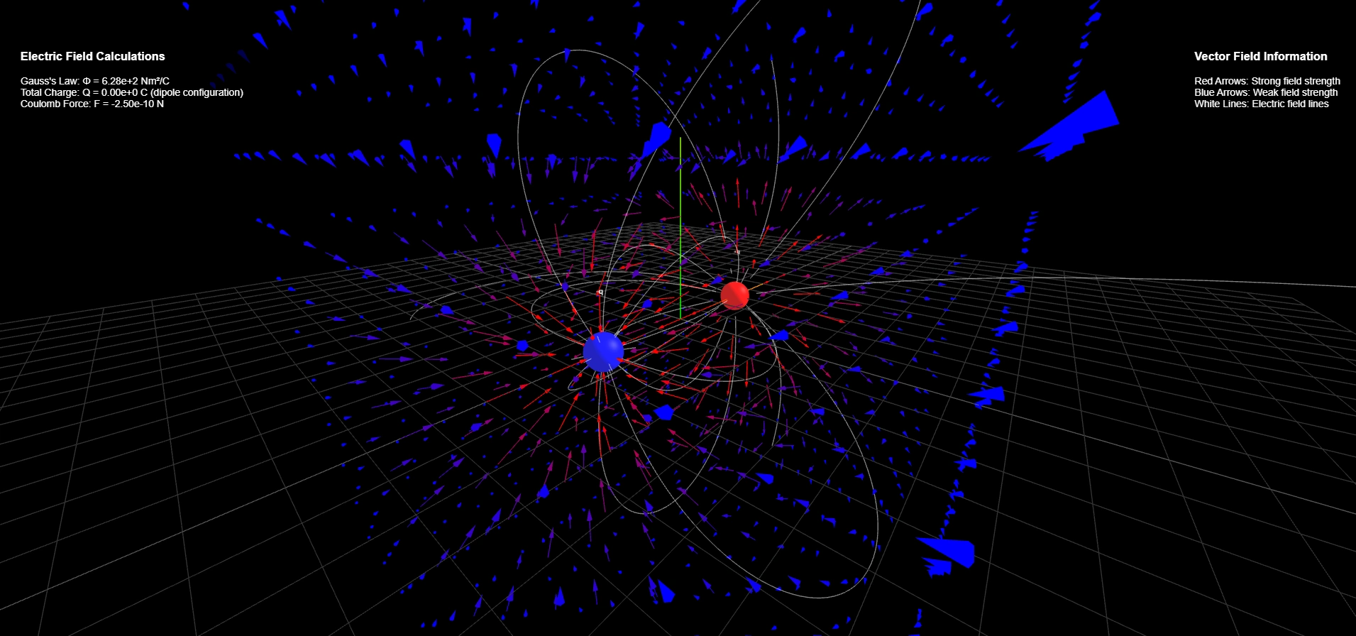 A web-based simulation that visualizes electric field lines, vectors, and related numeric values for a dipole charge configuration using Three.js.