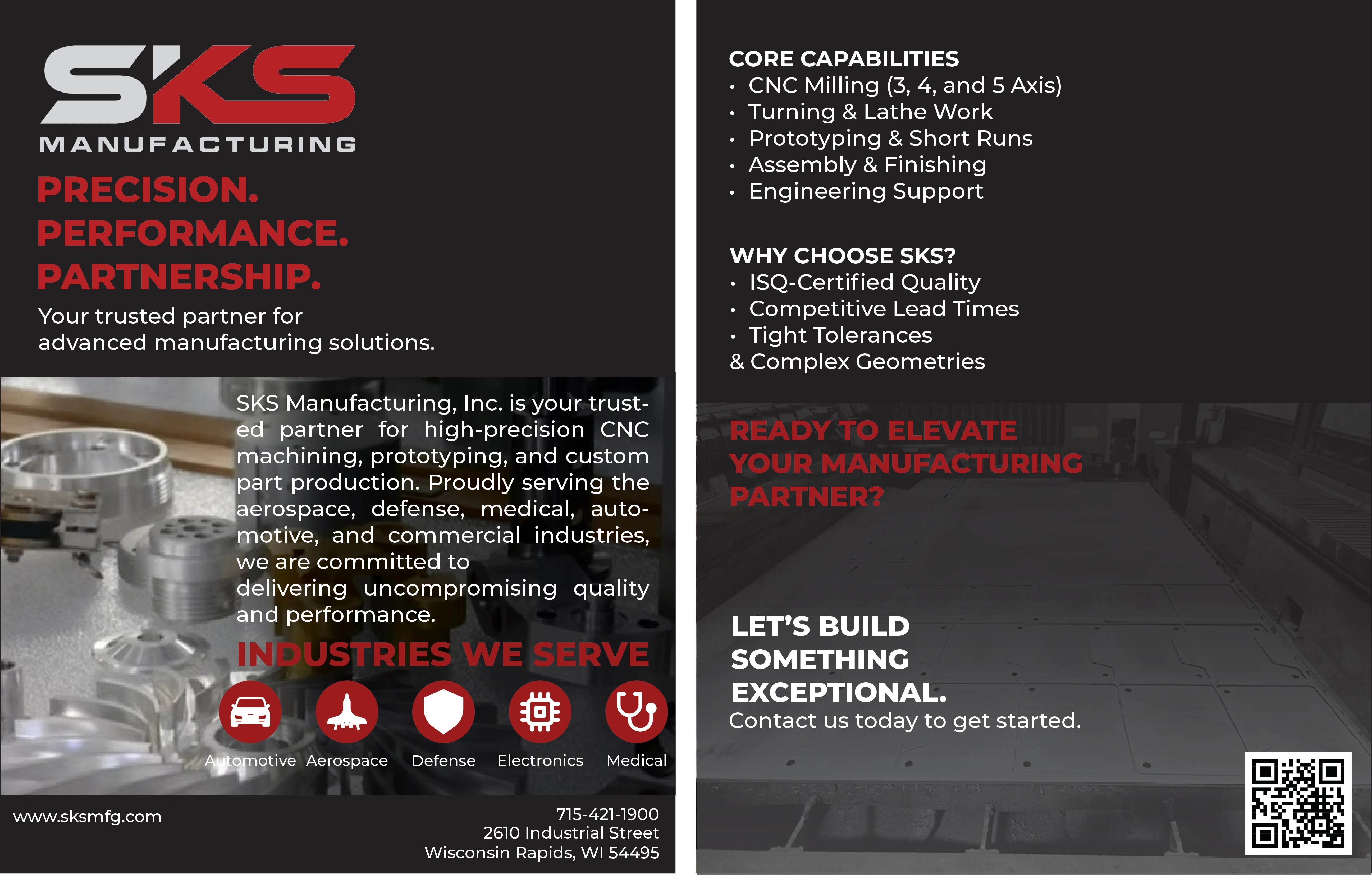 High-impact flyer design for SKS Manufacturing, highlighting CNC capabilities, core services, and industry expertise with bold visuals and clear messaging.