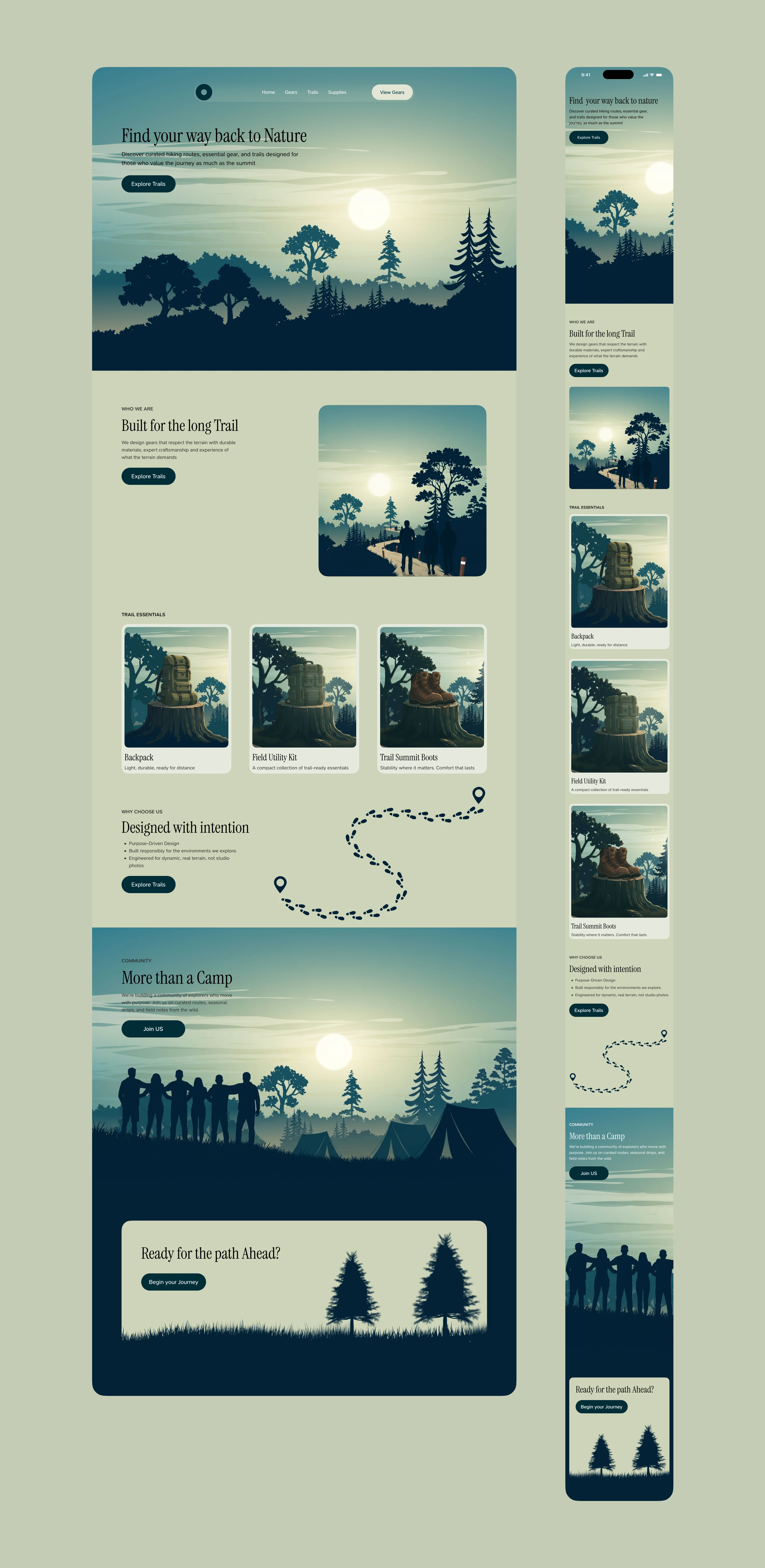 The goal was to design a landing experience that felt calm, curated, and emotionally grounded avoiding the aggressive, adrenaline-driven tone commonly seen in outdoor commerce.