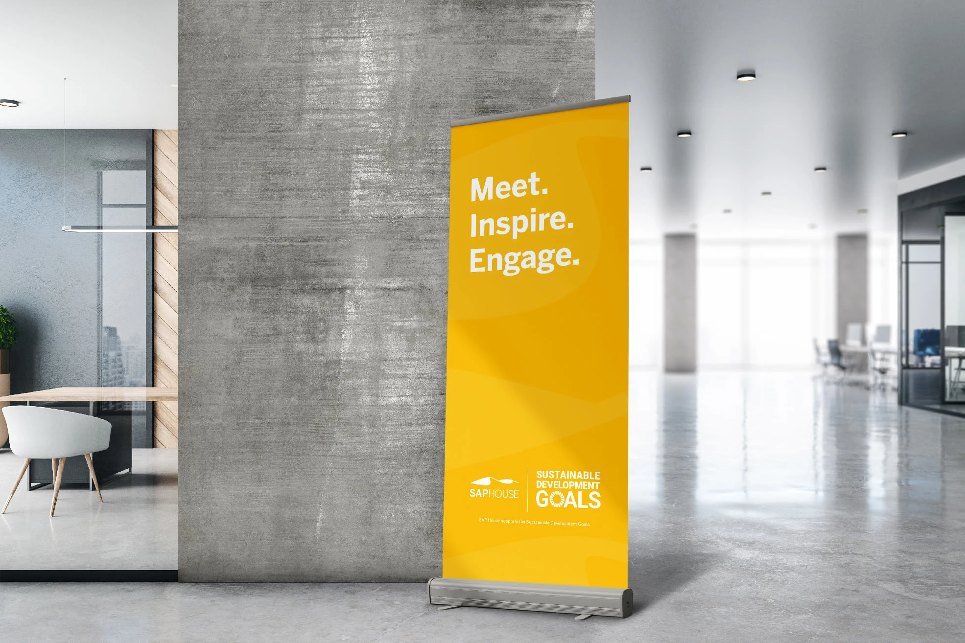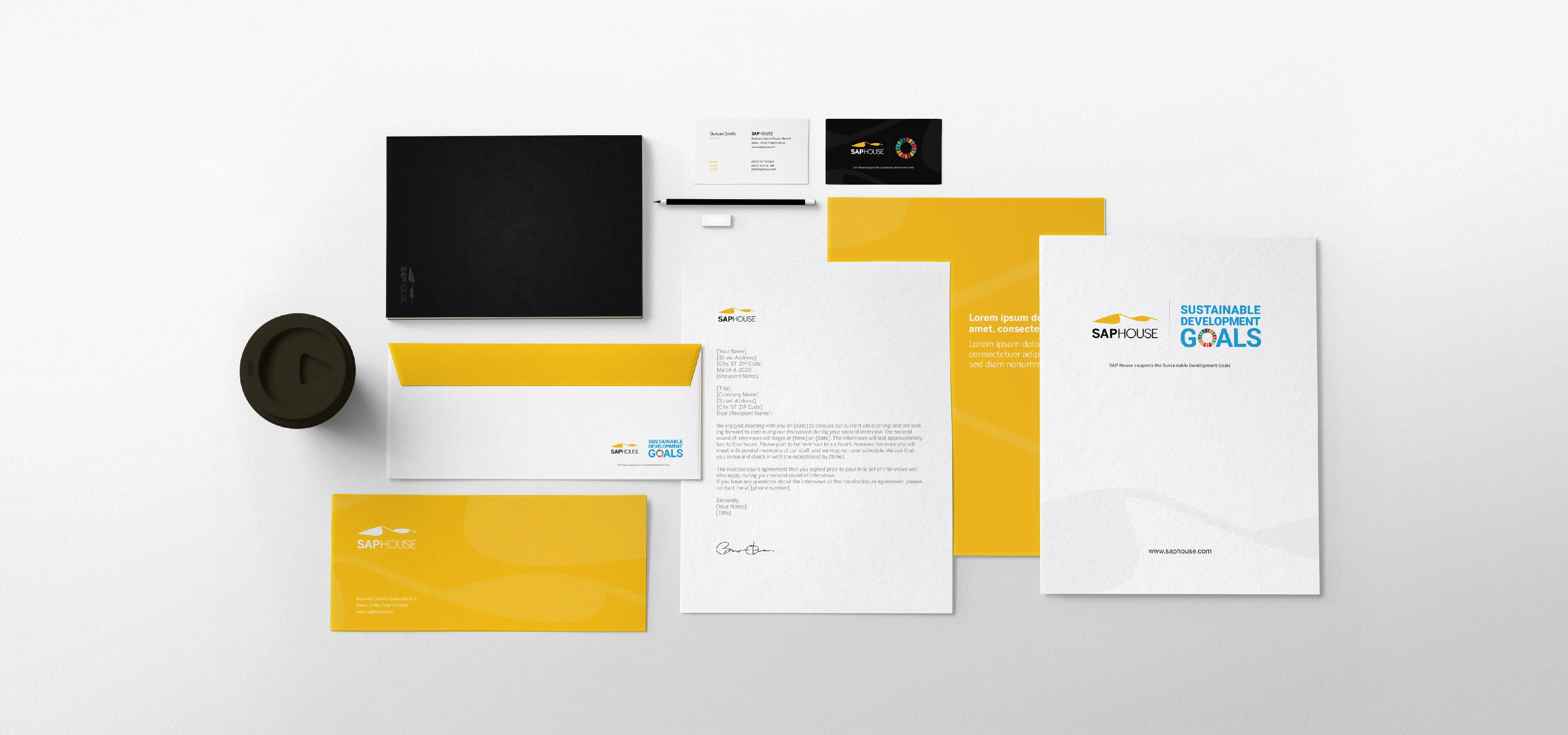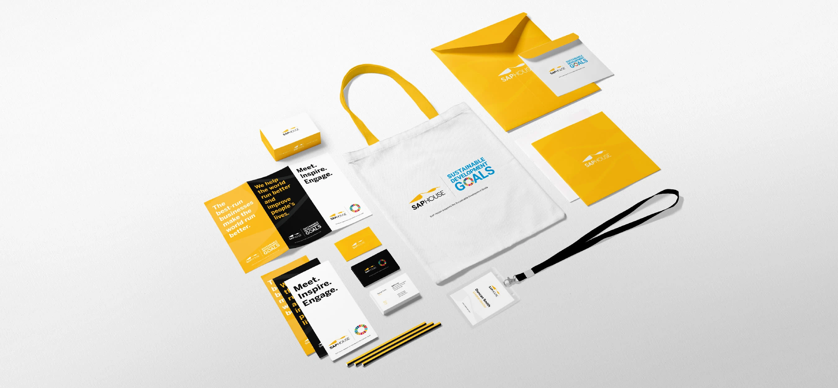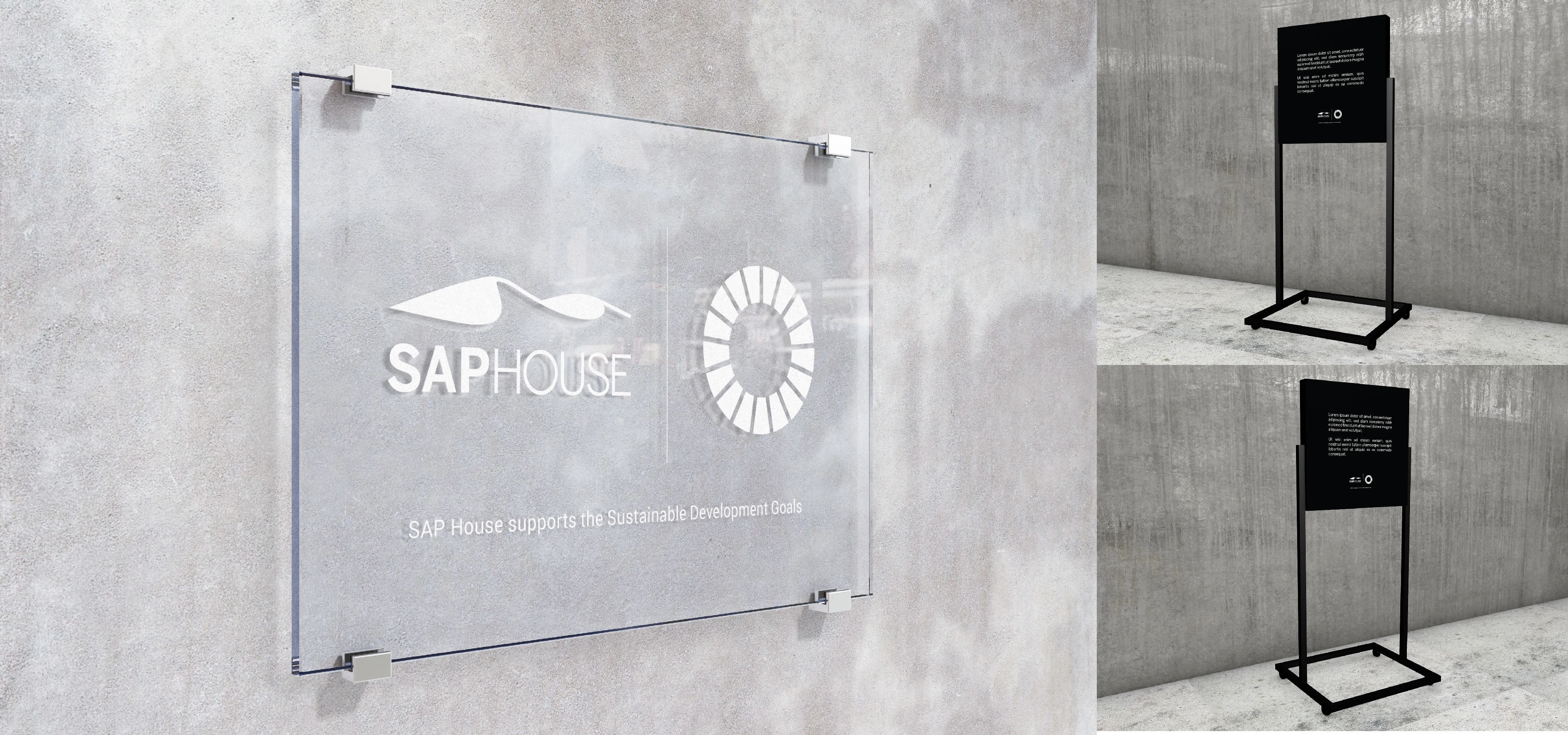 SAP House's branding and its support for the Sustainable Development Goals (SDGs). The visuals include stationery, business cards and signages.