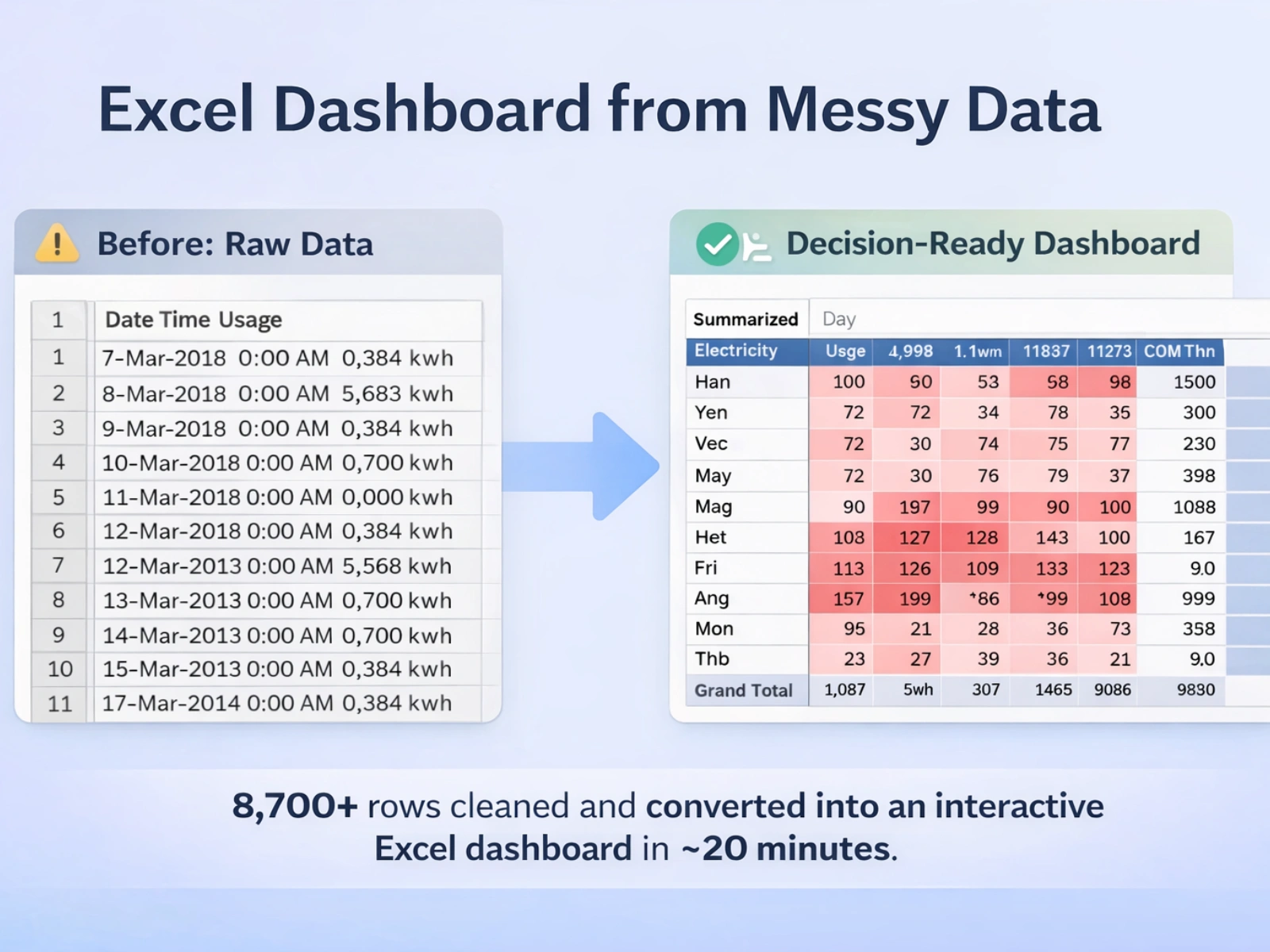 This case study showcases an end-to-end Excel workflow where raw, unstructured electricity consumption data was cleaned, structured, and transformed into an interactive, decision-ready report.