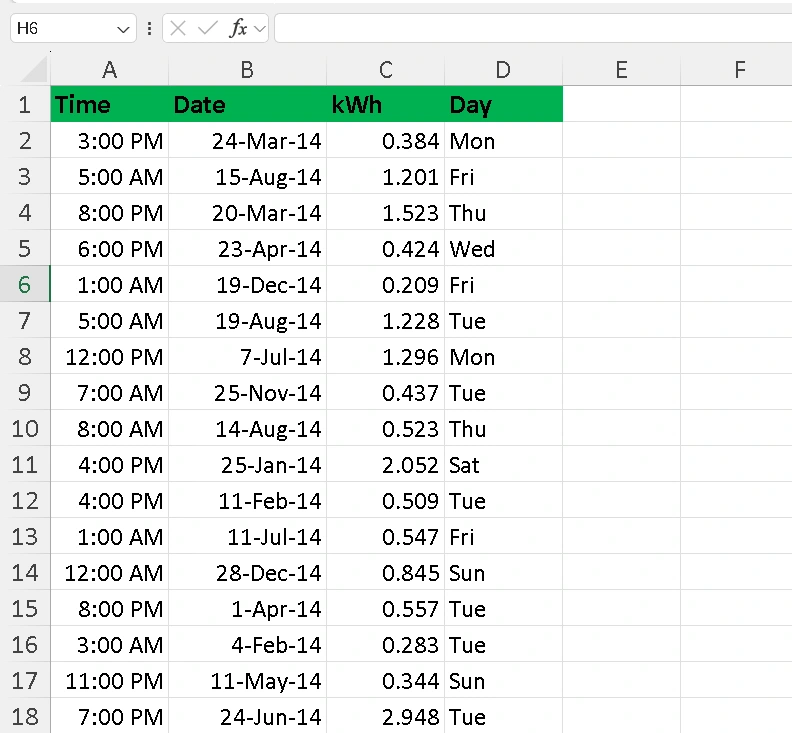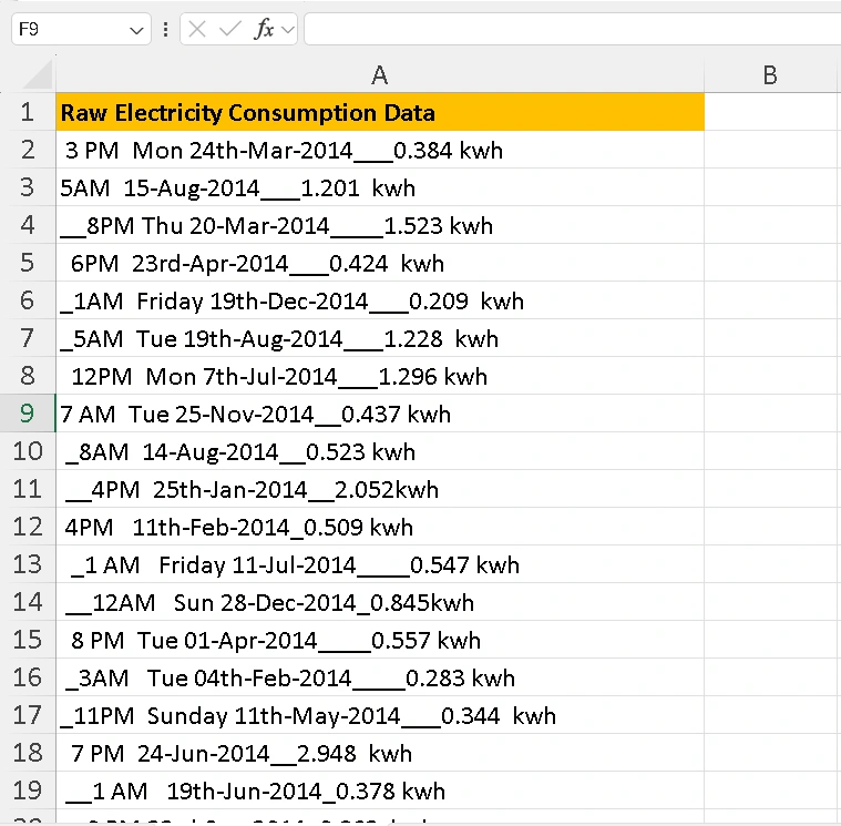 The dataset was provided in a highly unstructured format, with date, time, and electricity usage values combined into a single column.