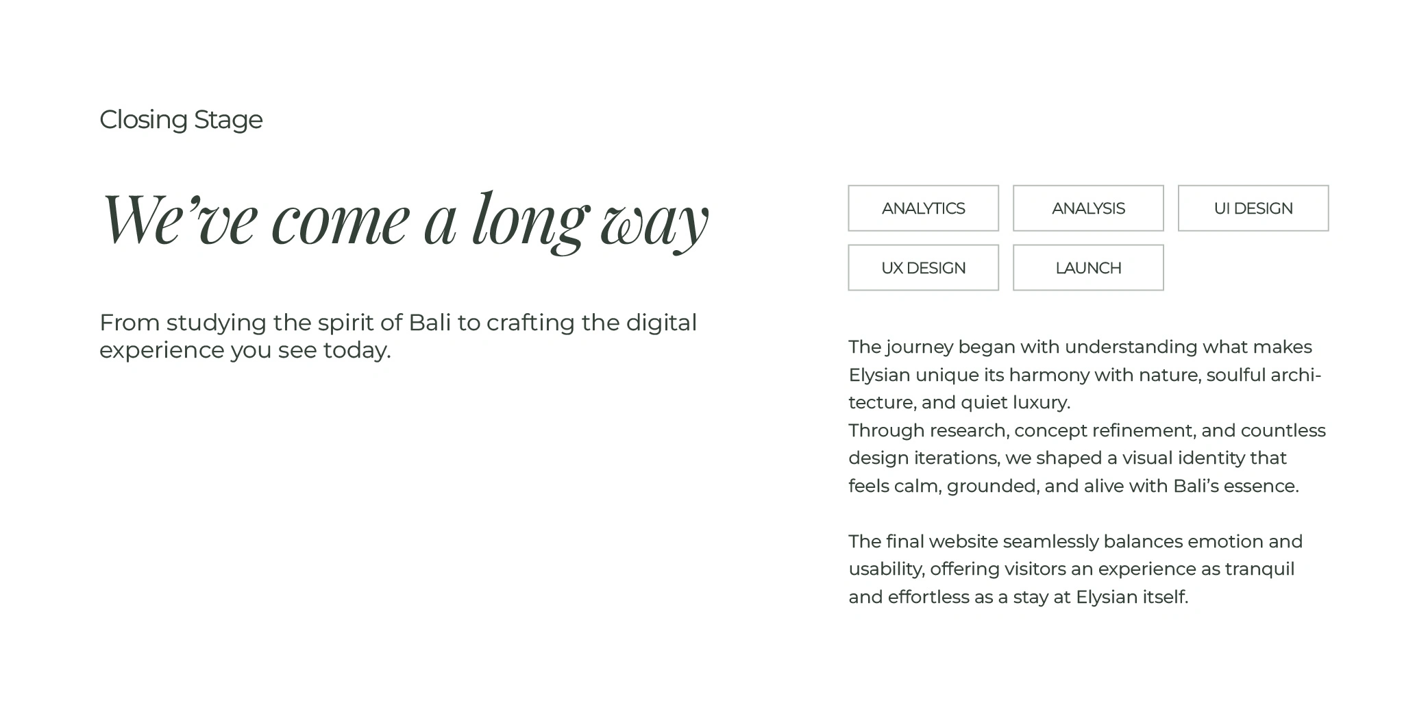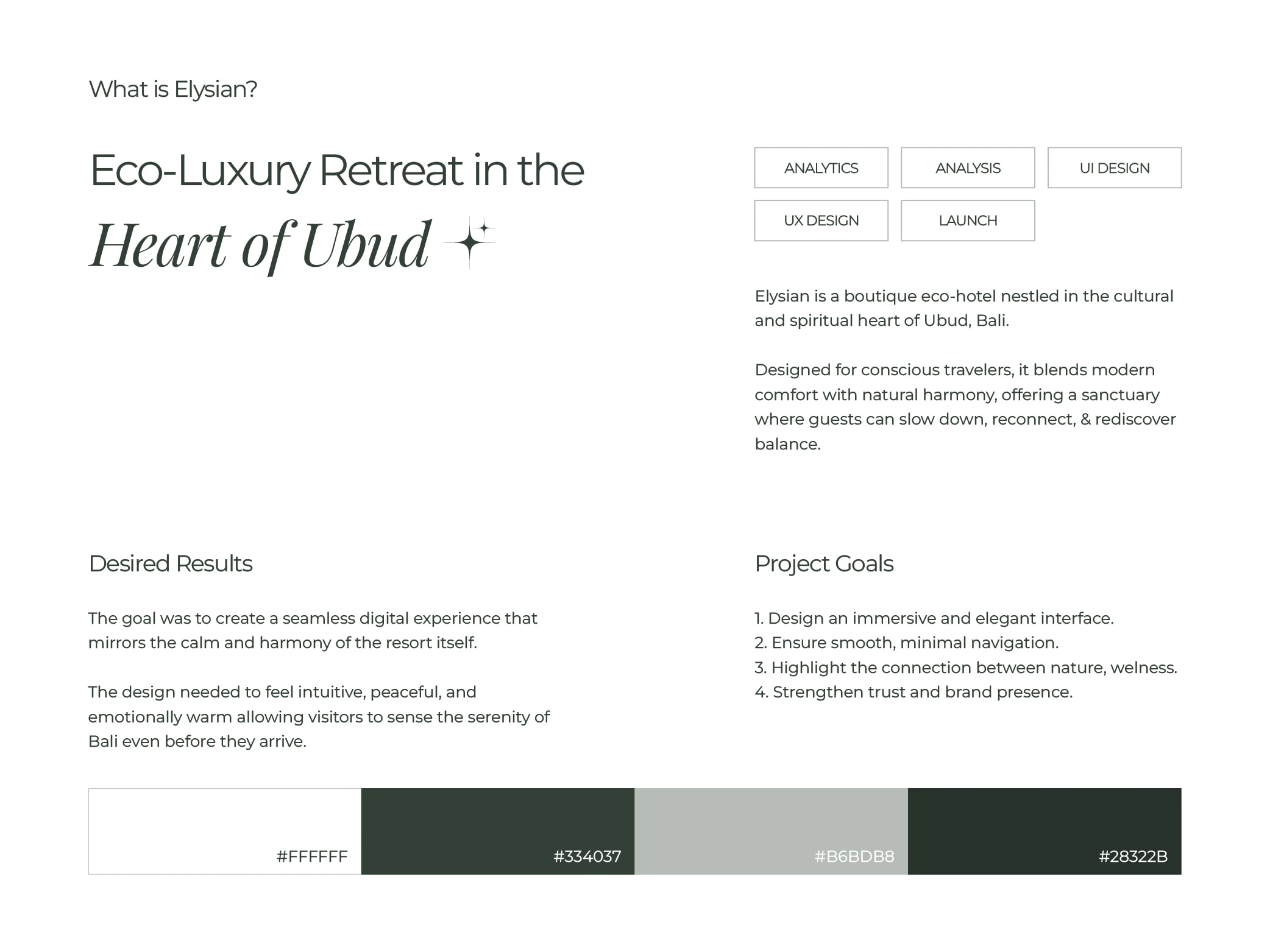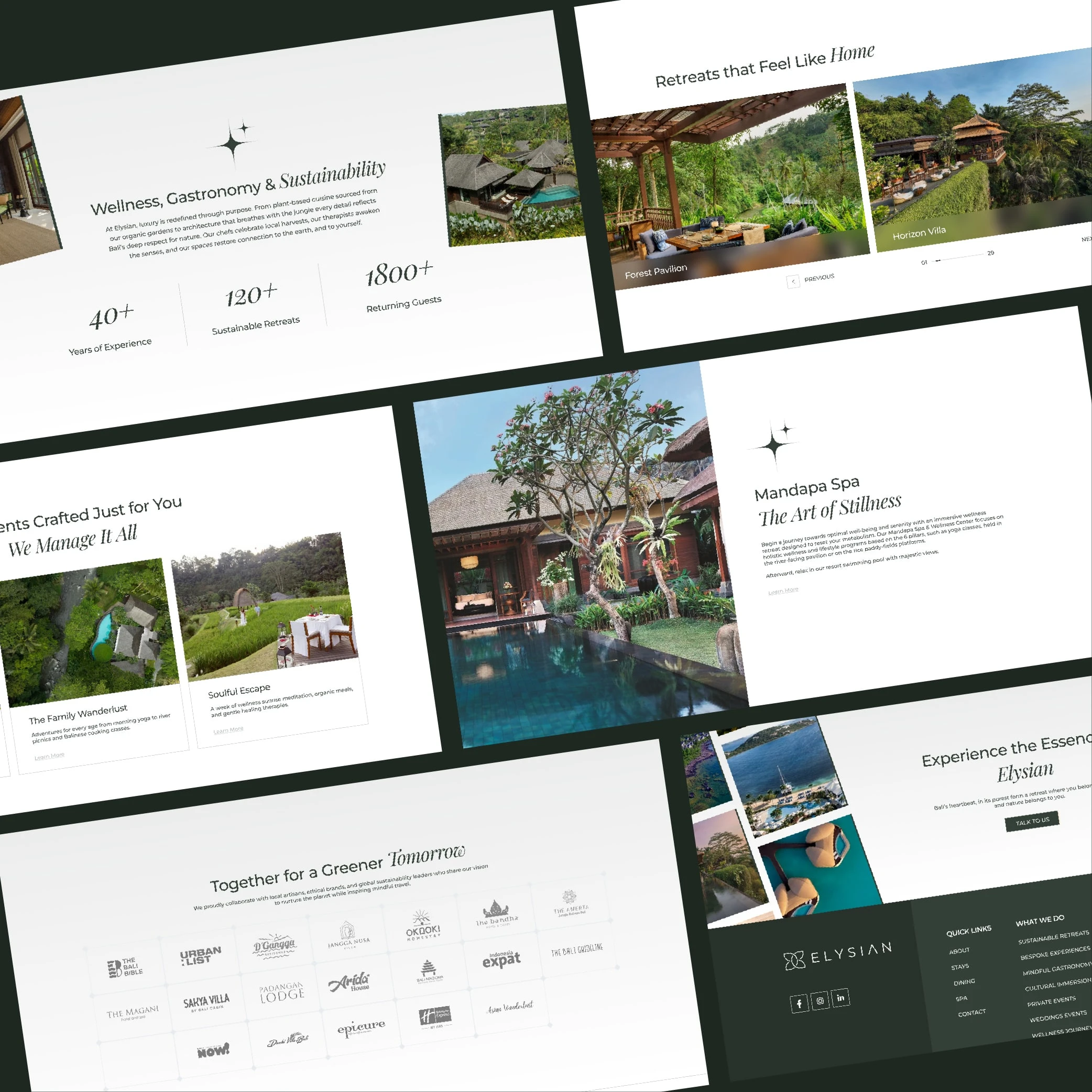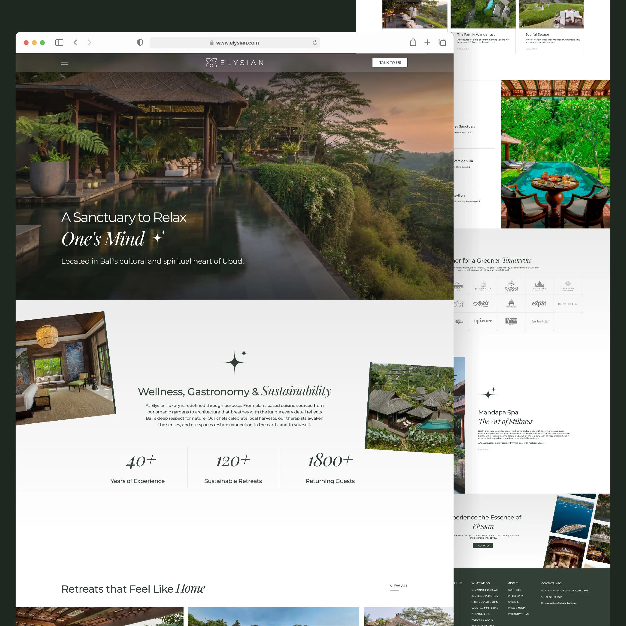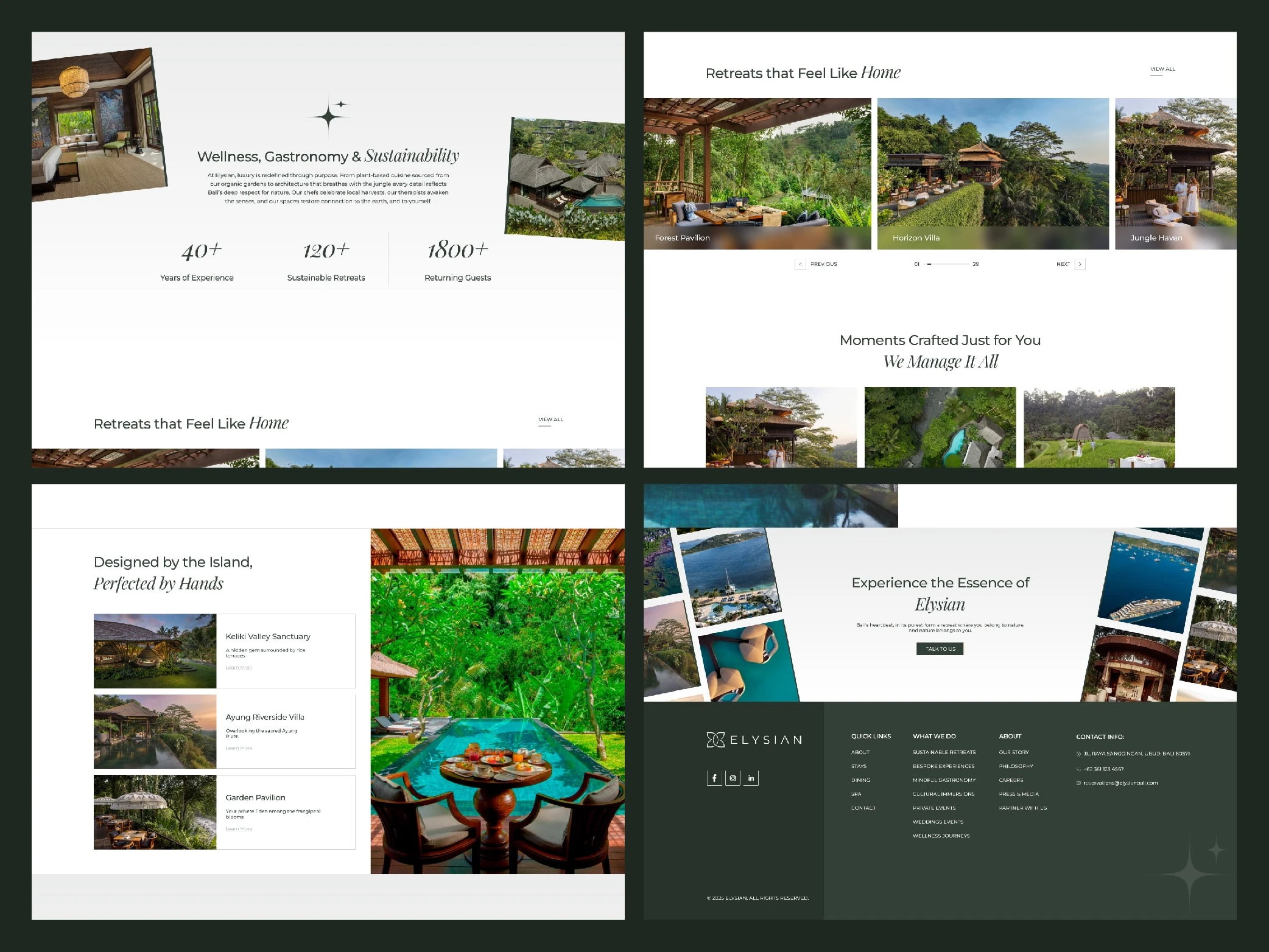 I created the UI/UX for Elysian, a small-town eco-hotel located in the cultural center of Ubud, Bali. The design aim was to make the site feel serene, organic, and inviting capturing the hotel's immersion in nature and local culture. I emphasized gentle layouts, warm imagery, and effortless navigation to make it easy to explore. Each part brings out the hotel's eco-friendly stay and serene ambiance of Bali. The final design is serene yet sophisticated, matching the charm of the hotel.