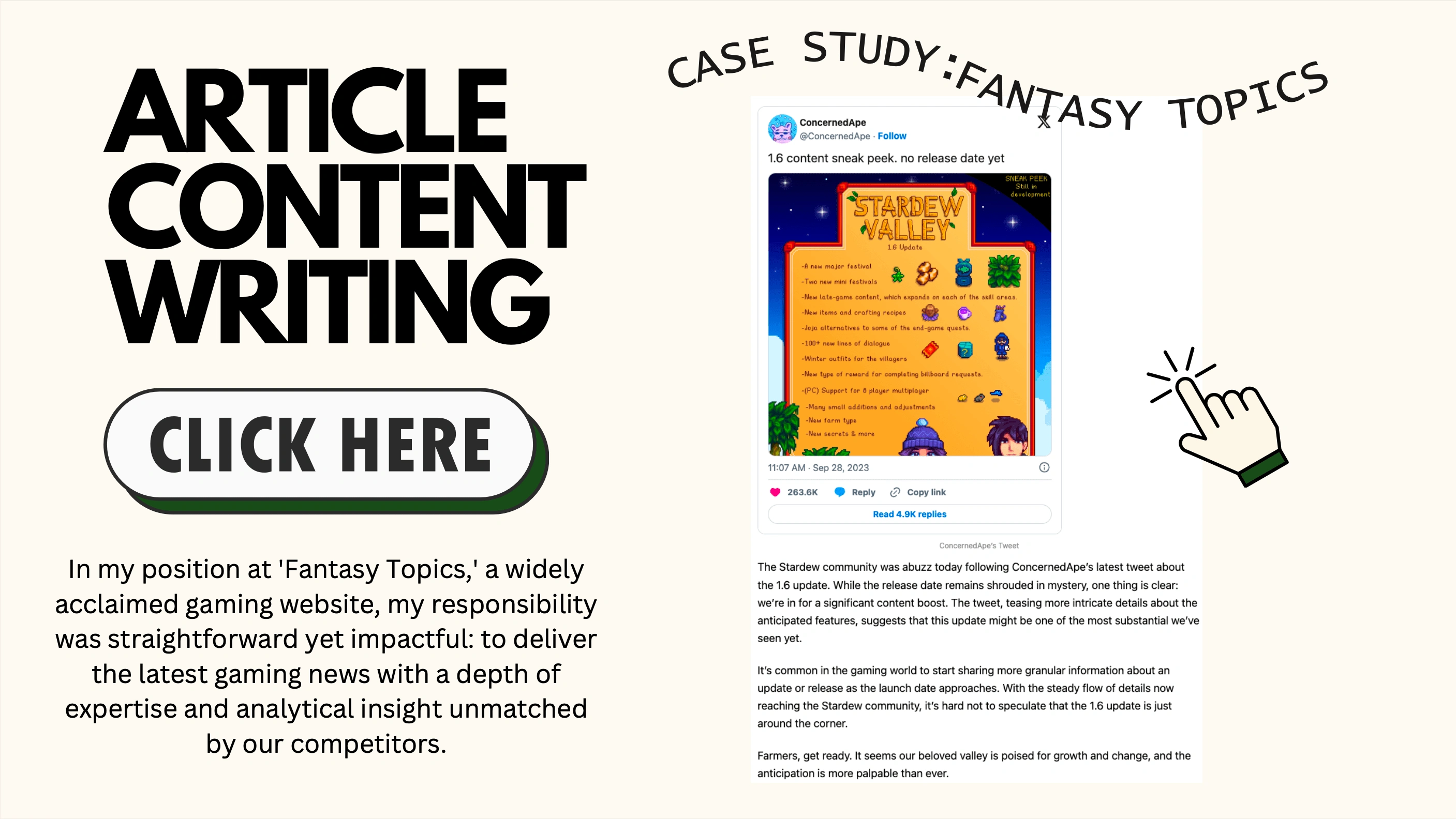 Check out the variety of articles I've written for pop culture website 'Fantasy Topics.' In this role, I generated engaging SEO-driven content on the latest gaming news. If the above 'Click Here' doesn't work, pleaseclick below.