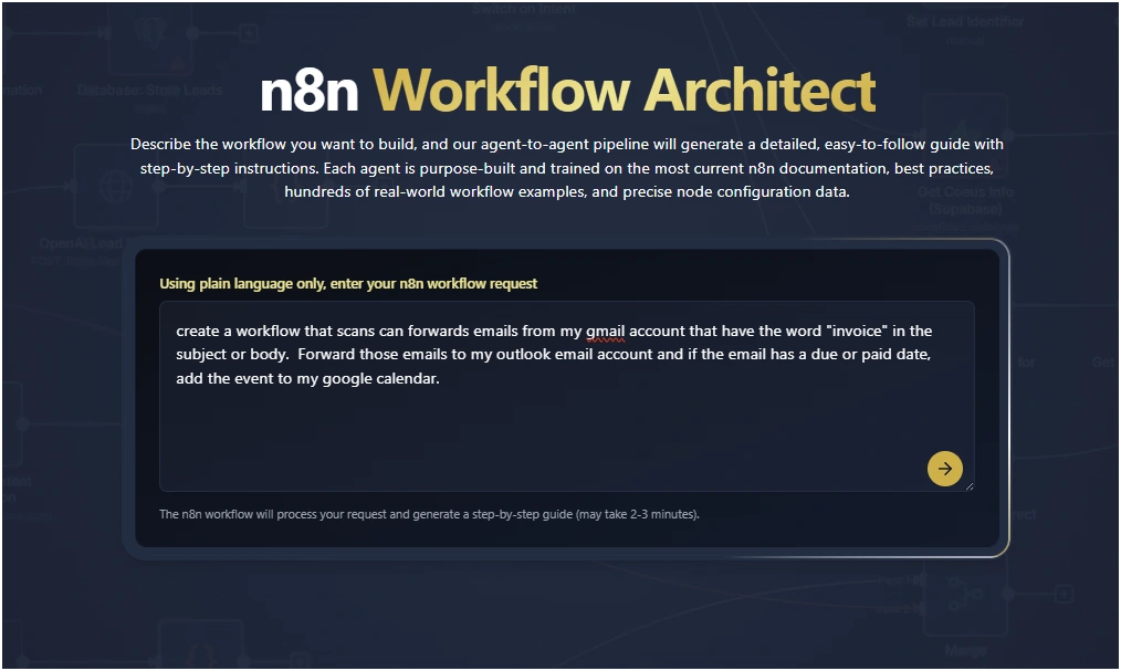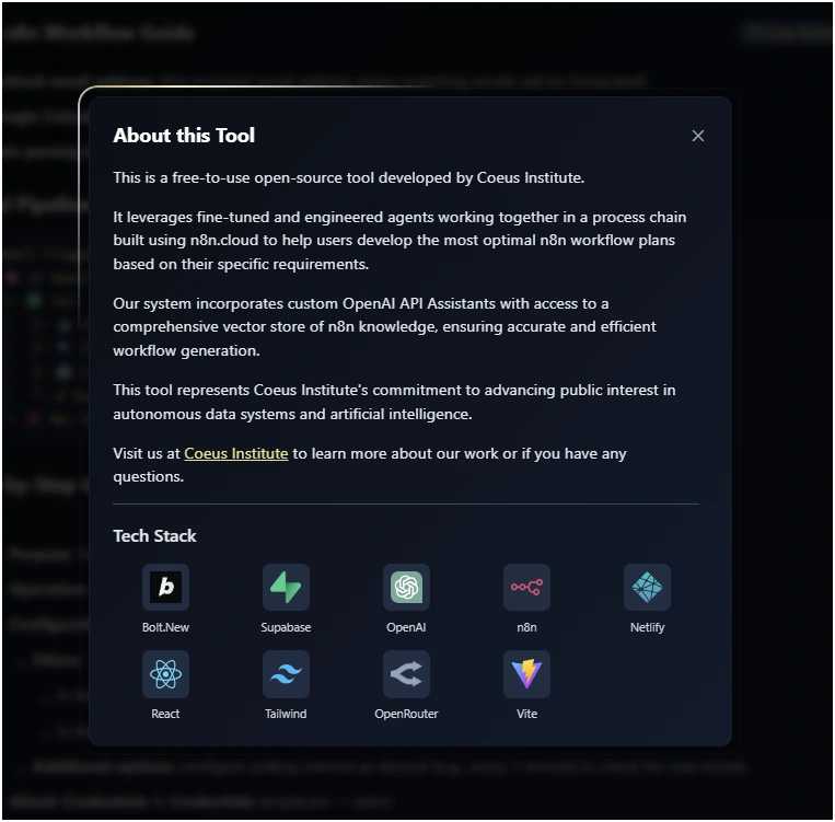 A free, open-source web tool developed by Coeus Institute that turns plain English workflow requirements into fully fleshed-out n8n automation plans.