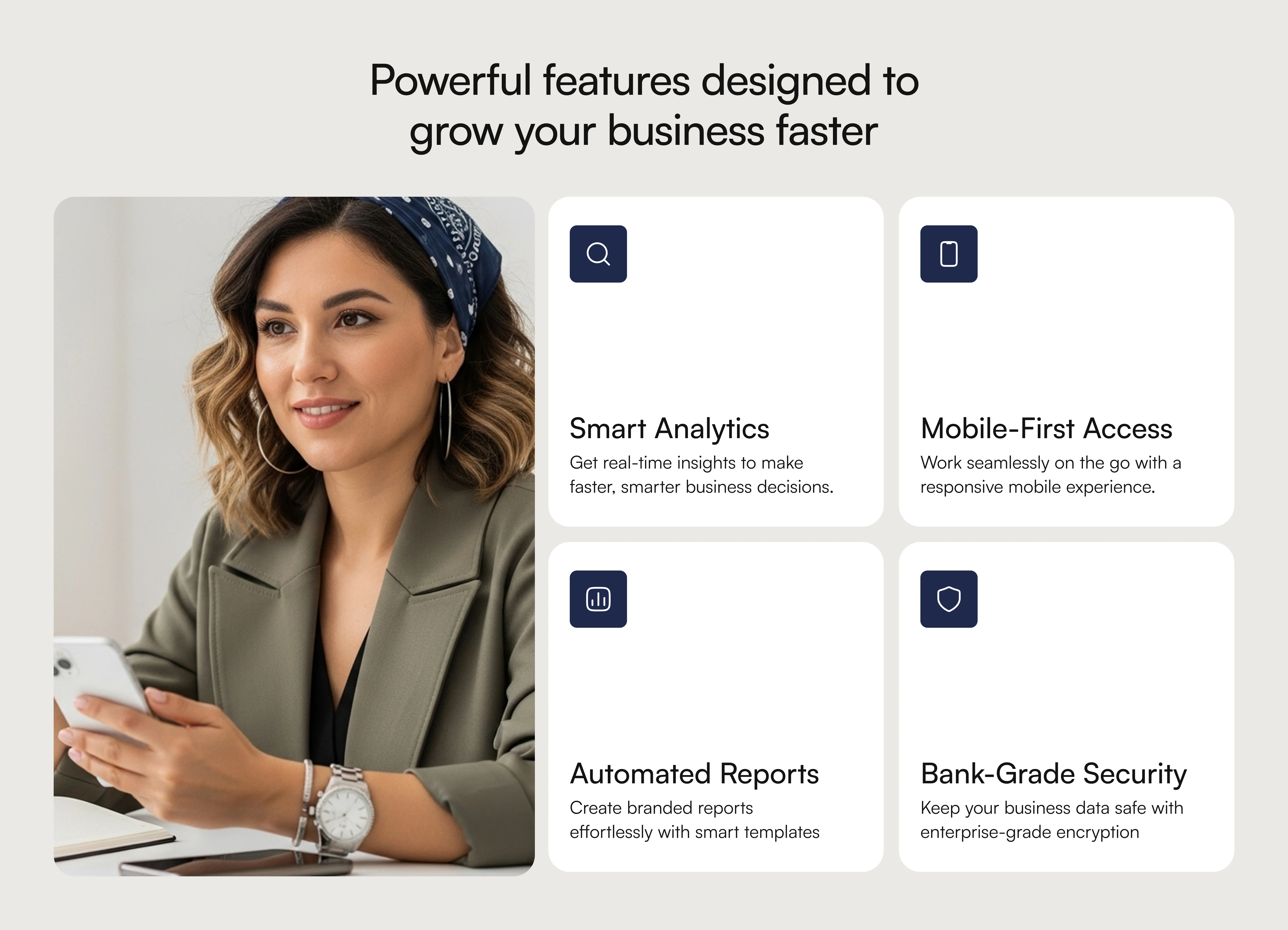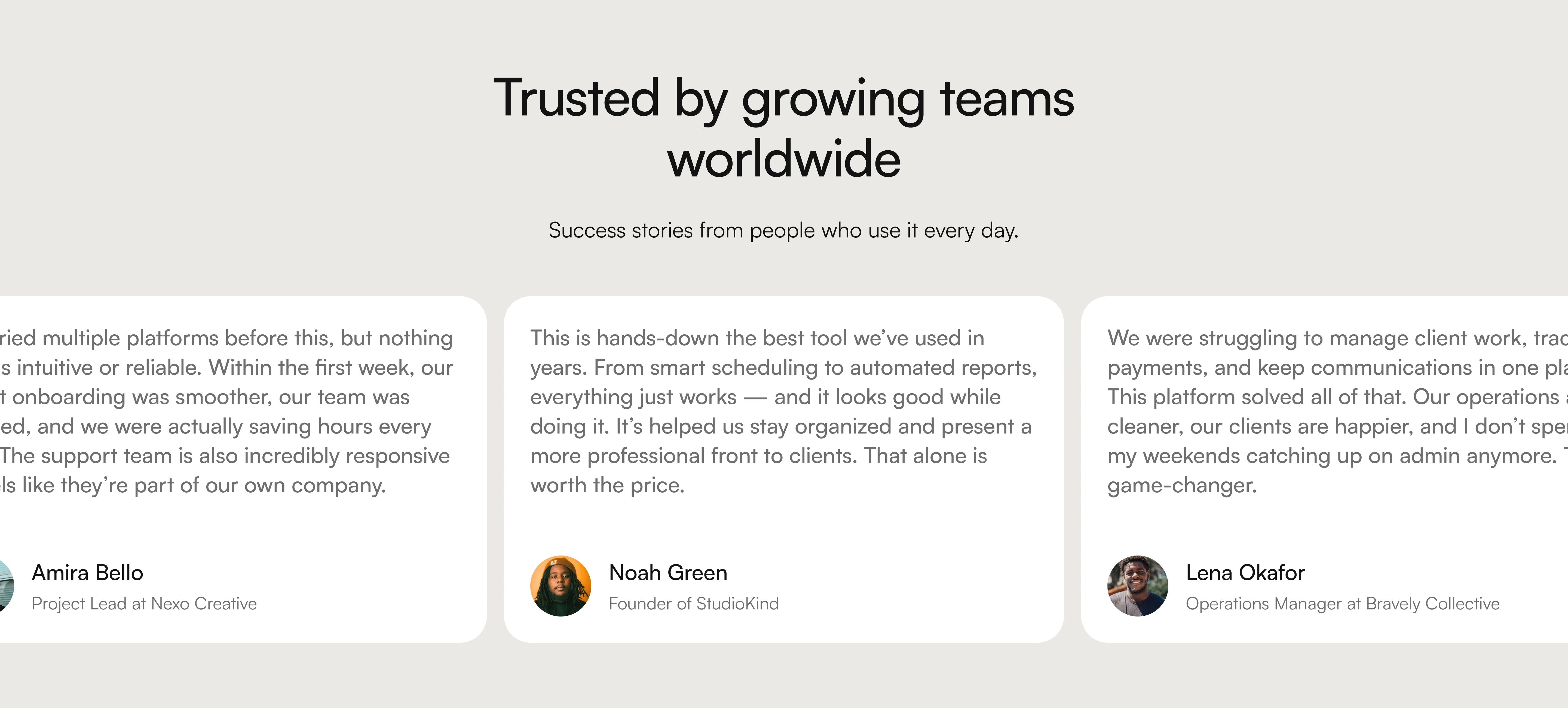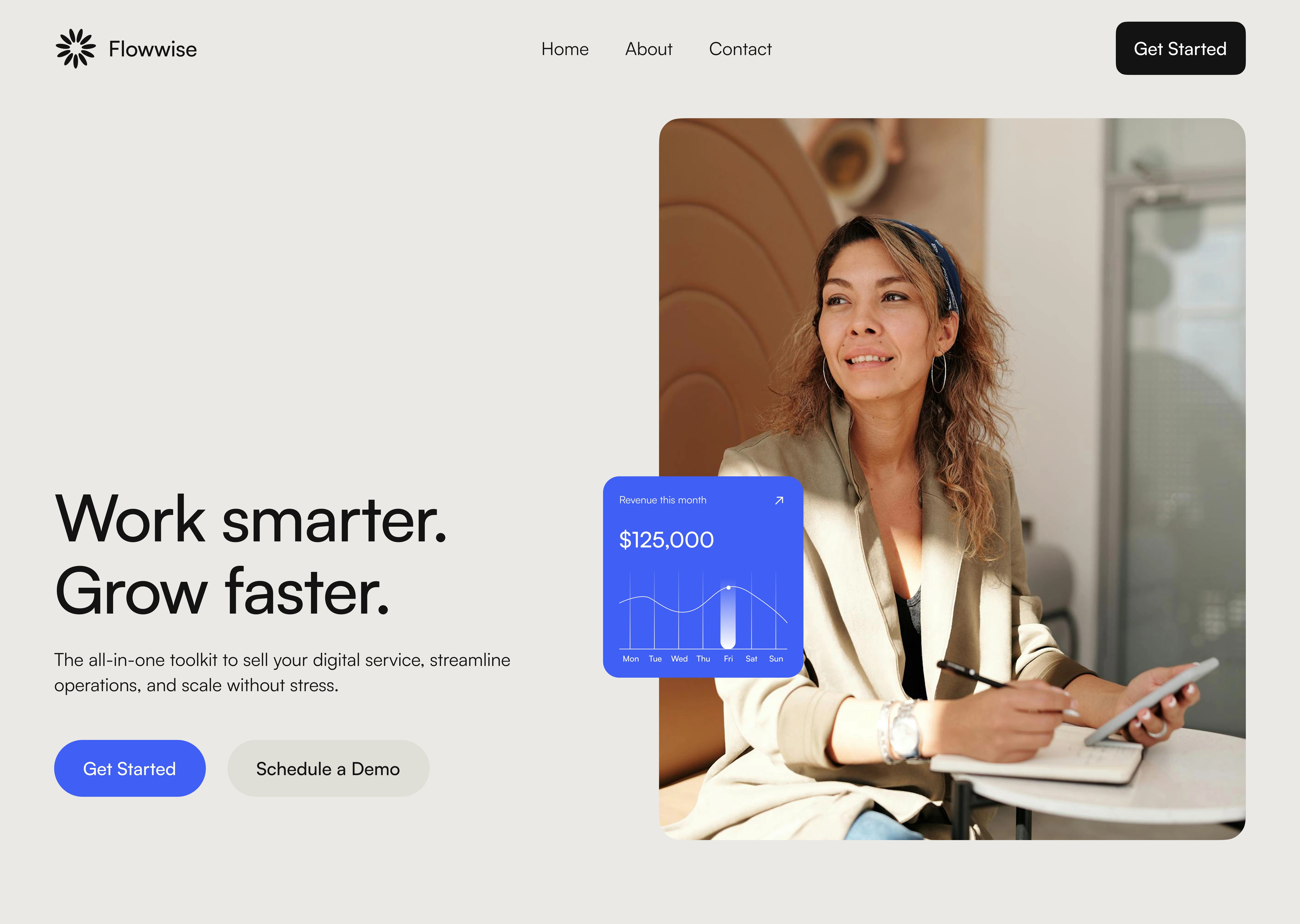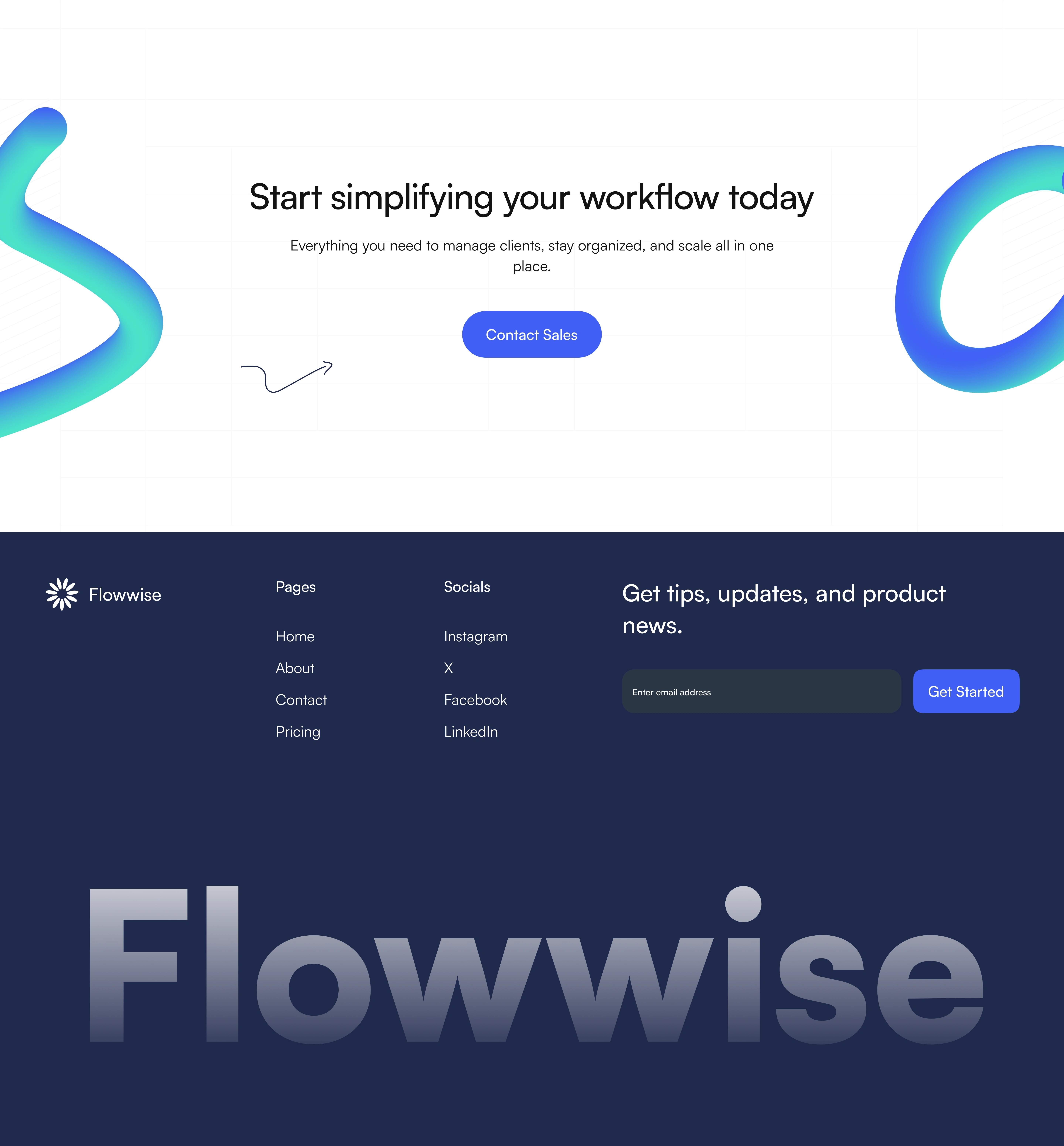 Flowwise is a modern, user-centric platform designed to help businesses manage, grow, and scale their operations with ease. The goal was to create a clean, conversion-optimized website experience that communicates trust, clarity, and product value. The design approach emphasized a balance between editorial clarity and marketing performance with strong copy, a clear value proposition, and a calming visual direction using portrait imagery, subtle color, and meaningful whitespace.