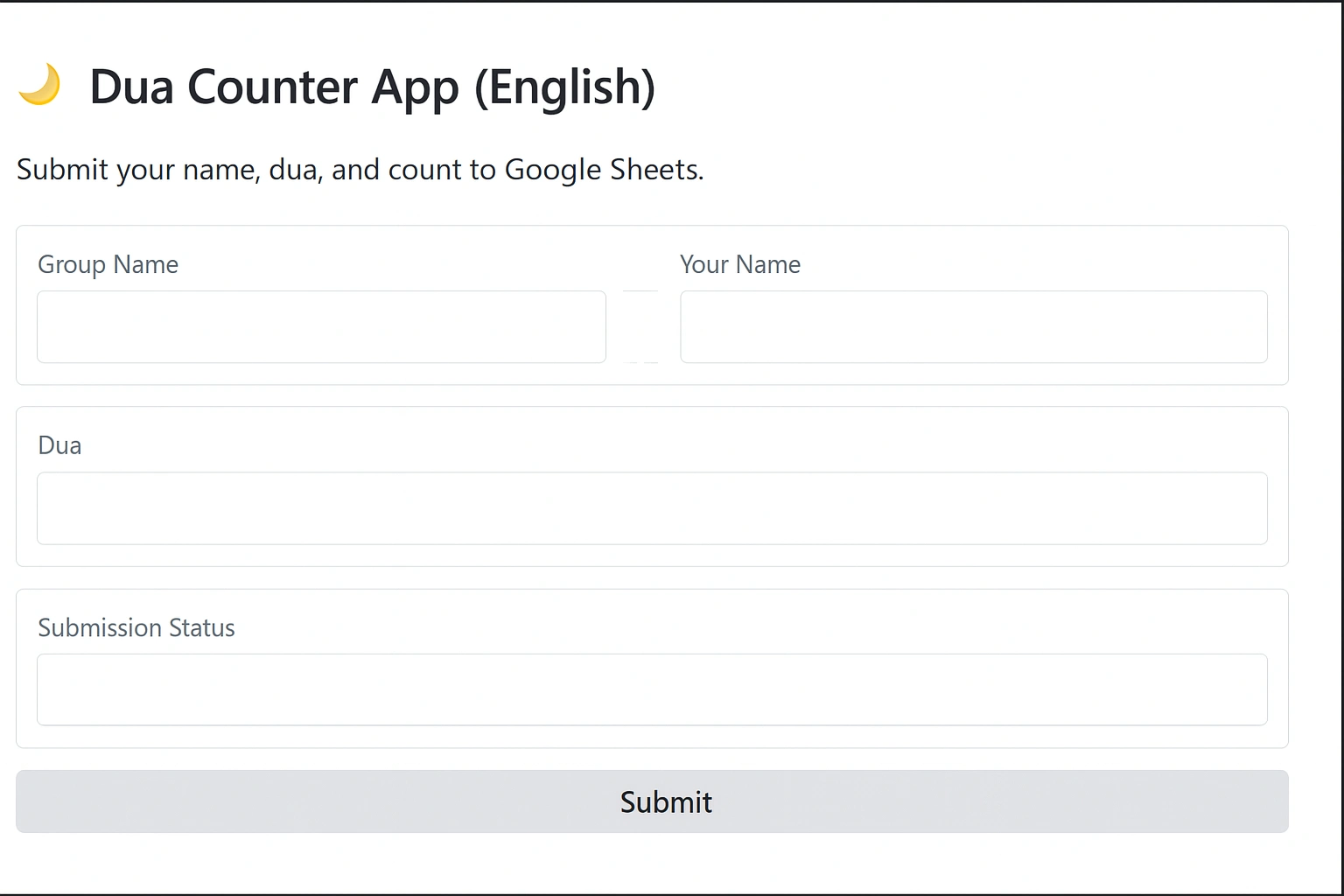 A community-based counter app where users can submit their daily dua counts. Integrated with Google Sheets for live updates, this app helps groups track and encourage daily spiritual habits.