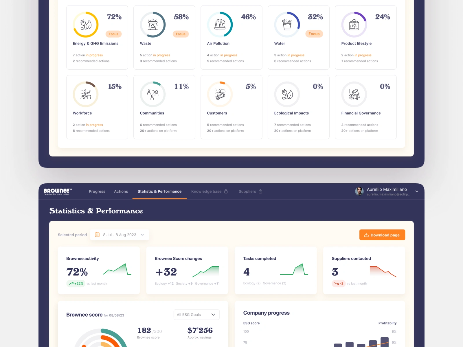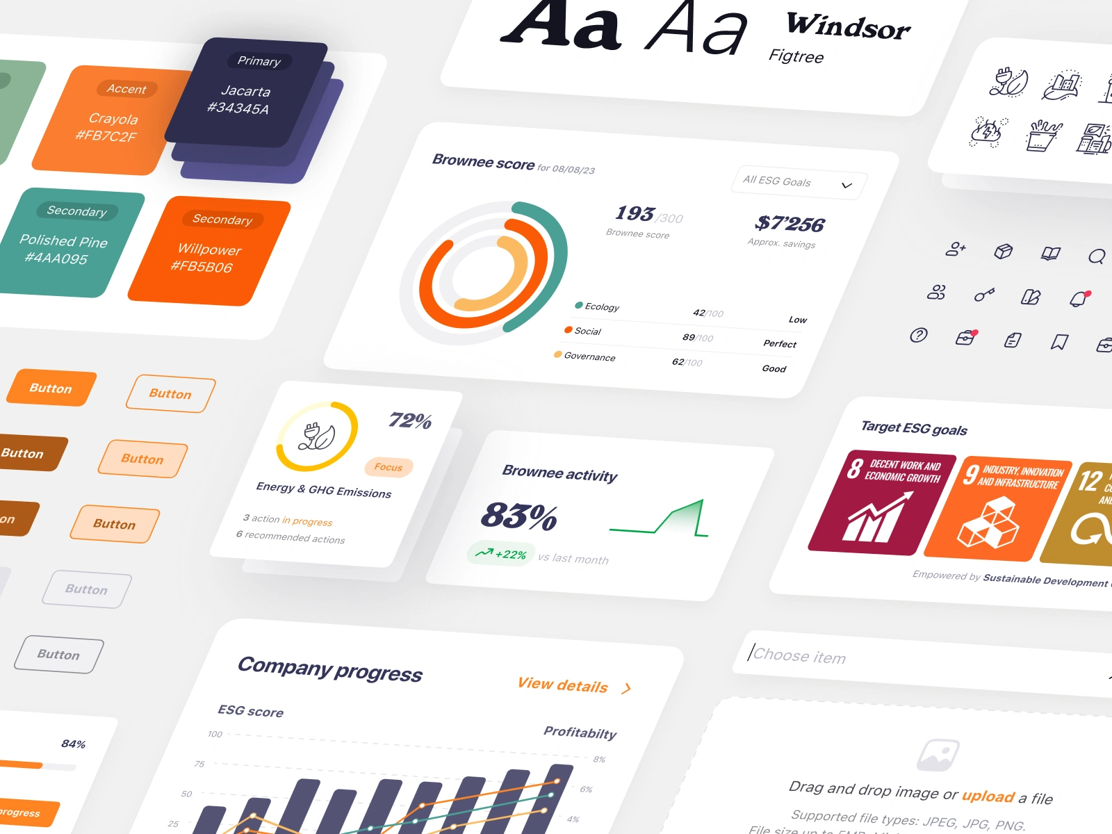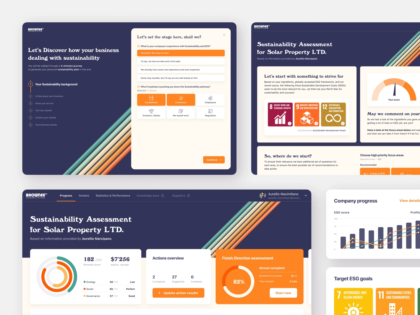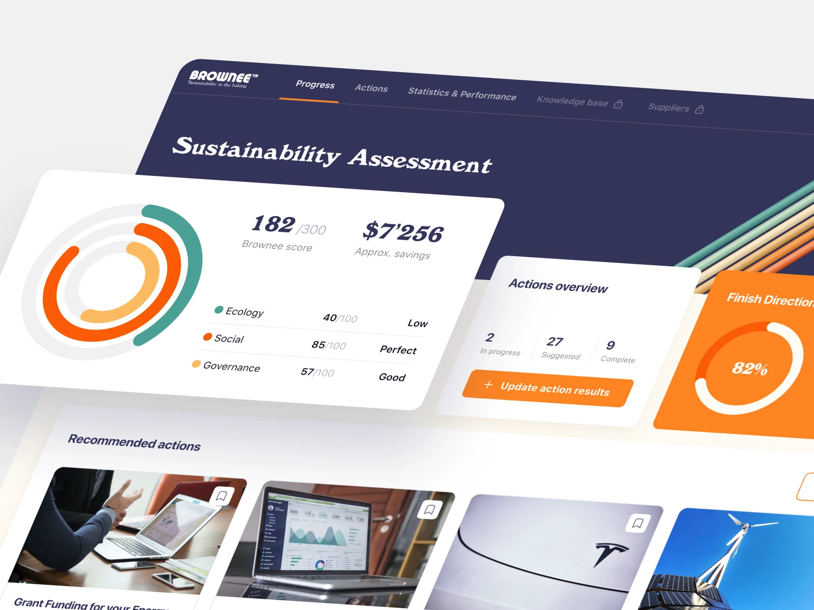 Brownee is a comprehensive B2B platform designed for companies committed to sustainable energy and global ESG (Environmental, Social, and Governance) standards. Many organizations struggle to translate vague sustainability goals into actionable strategies. Our task was to design an end-to-end digital ecosystem that assesses a company's current state, suggests high-impact tasks, and tracks real-time progress. We turned complex global objectives into a clear, gamified management tool where every business decision is reflected in a specialized "Brownee Score," providing stakeholders with absolute transparency regarding their ecological and social impact.