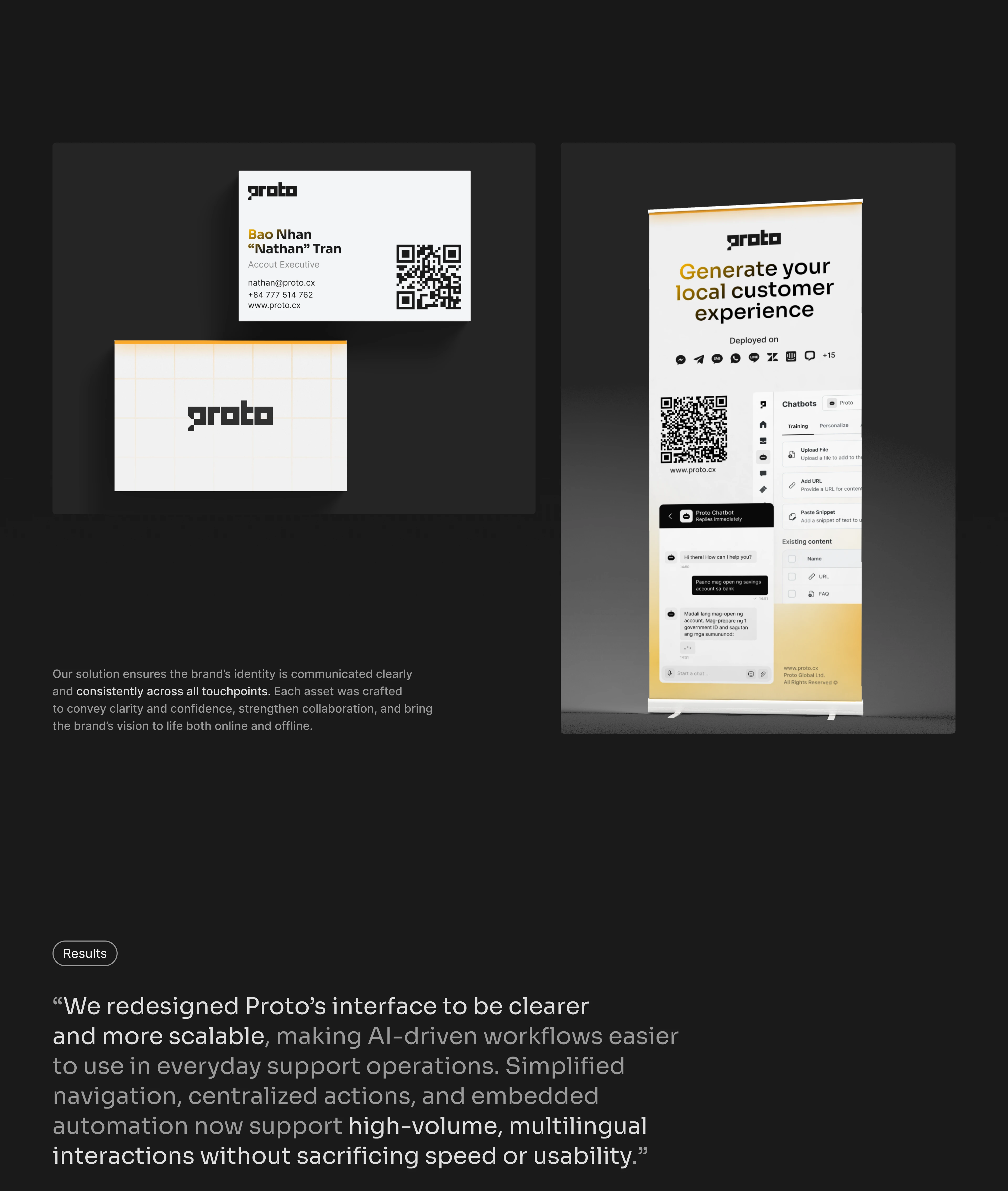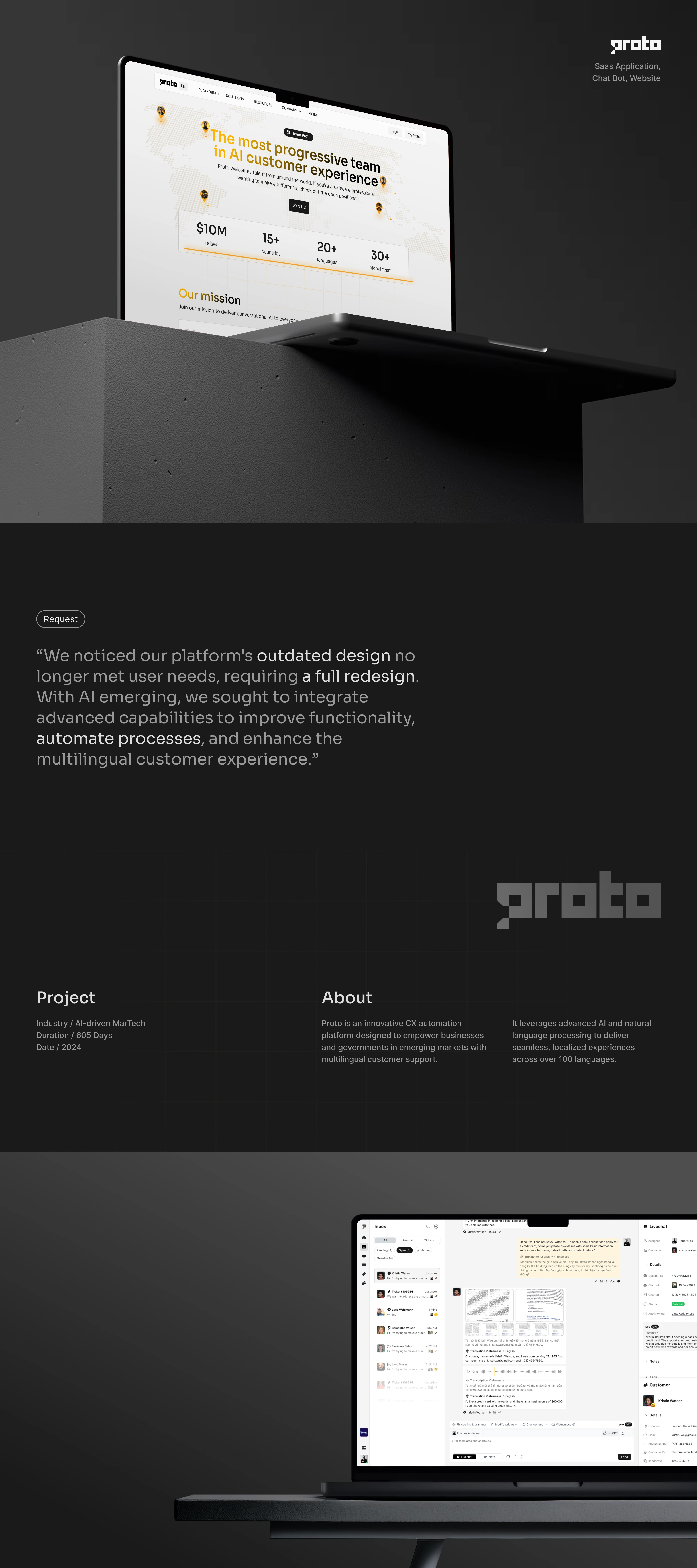 We designed the UI/UX for Proto, a SaaS platform, and created marketing materials to showcase the brand. Proto is an innovative CX automation platform that empowers businesses and governments in emerging markets with multilingual customer support. Using advanced AI and natural language processing, it delivers seamless, localized experiences in over 100 languages.