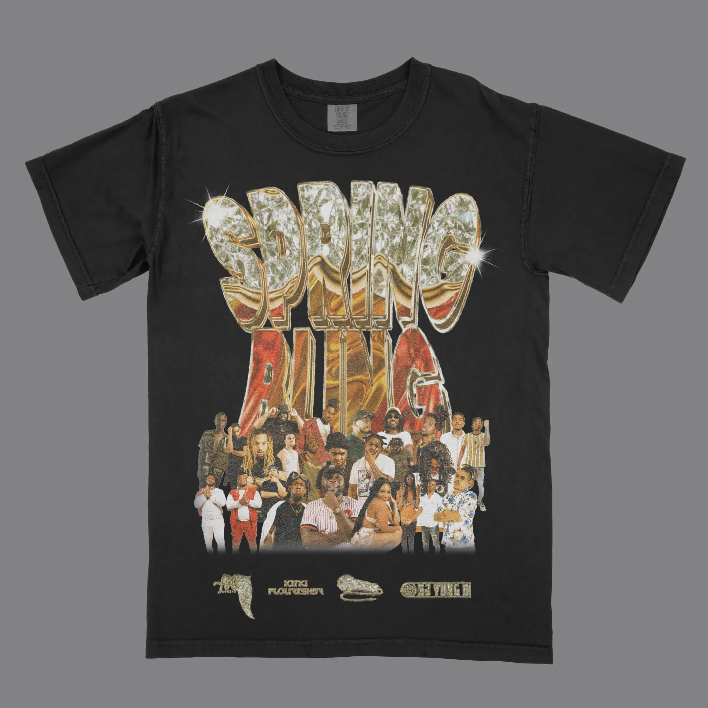 This shirt design has bold, reflective “SPRING BLING” text, a collage of artists below, and brand logos at the bottom, creating a vibrant, retro showcase look.