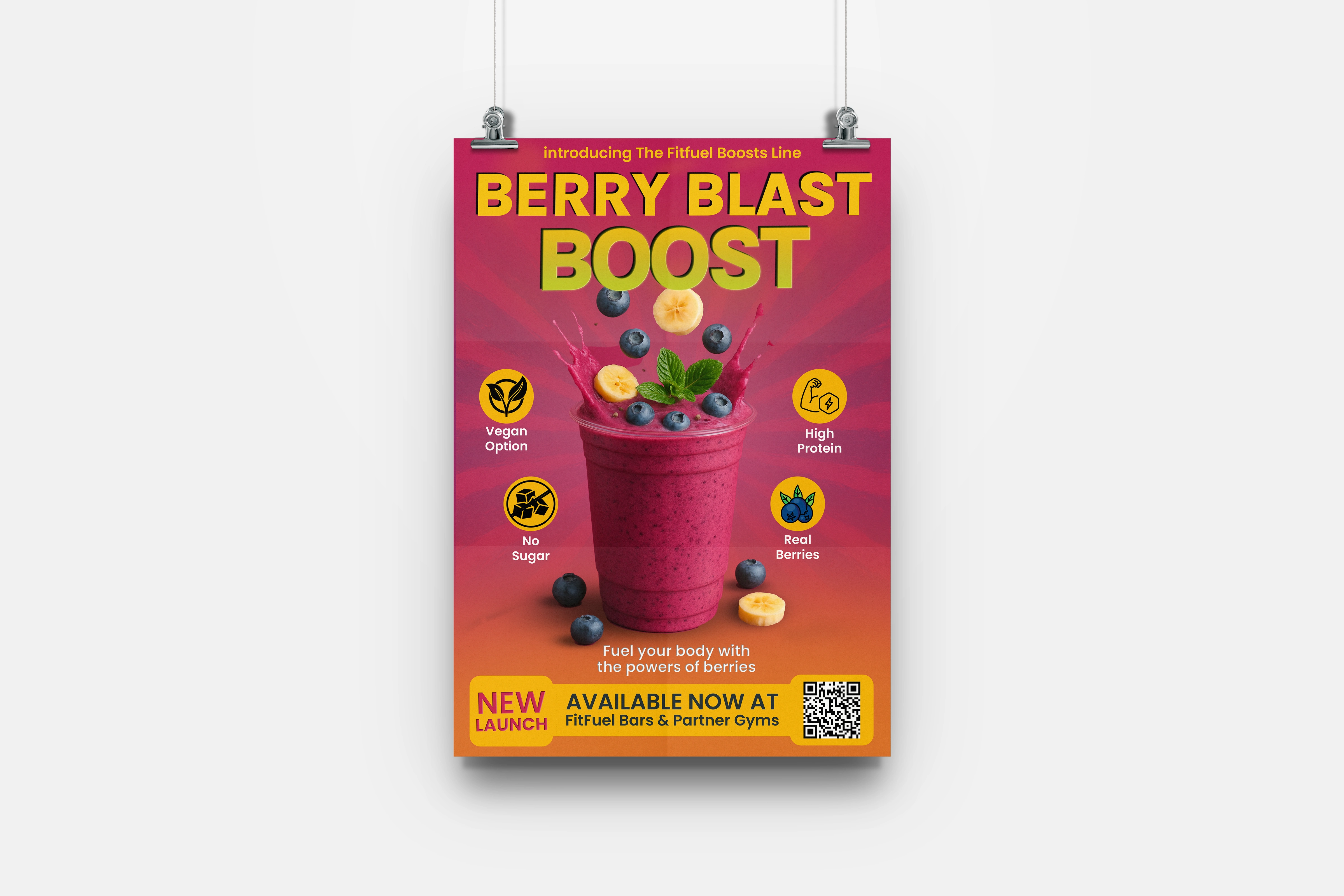 Crafted a vibrant and energetic poster for FitFuel’s new smoothie launch. Focused on bold typography, engaging colors, and clean iconography to highlight key benefits (vegan, no sugar, high protein). Designed to attract health-conscious customers in gym and bar environments.
