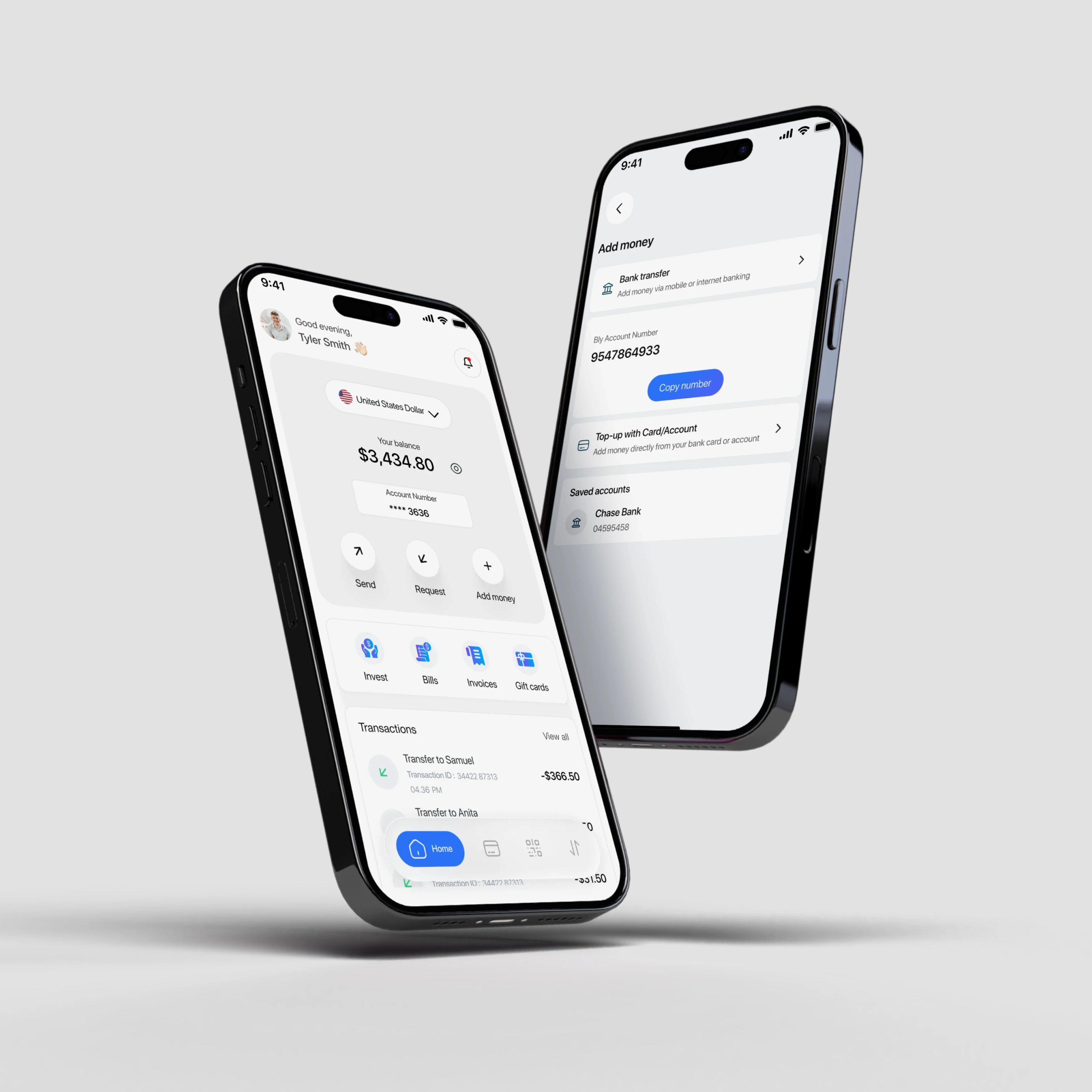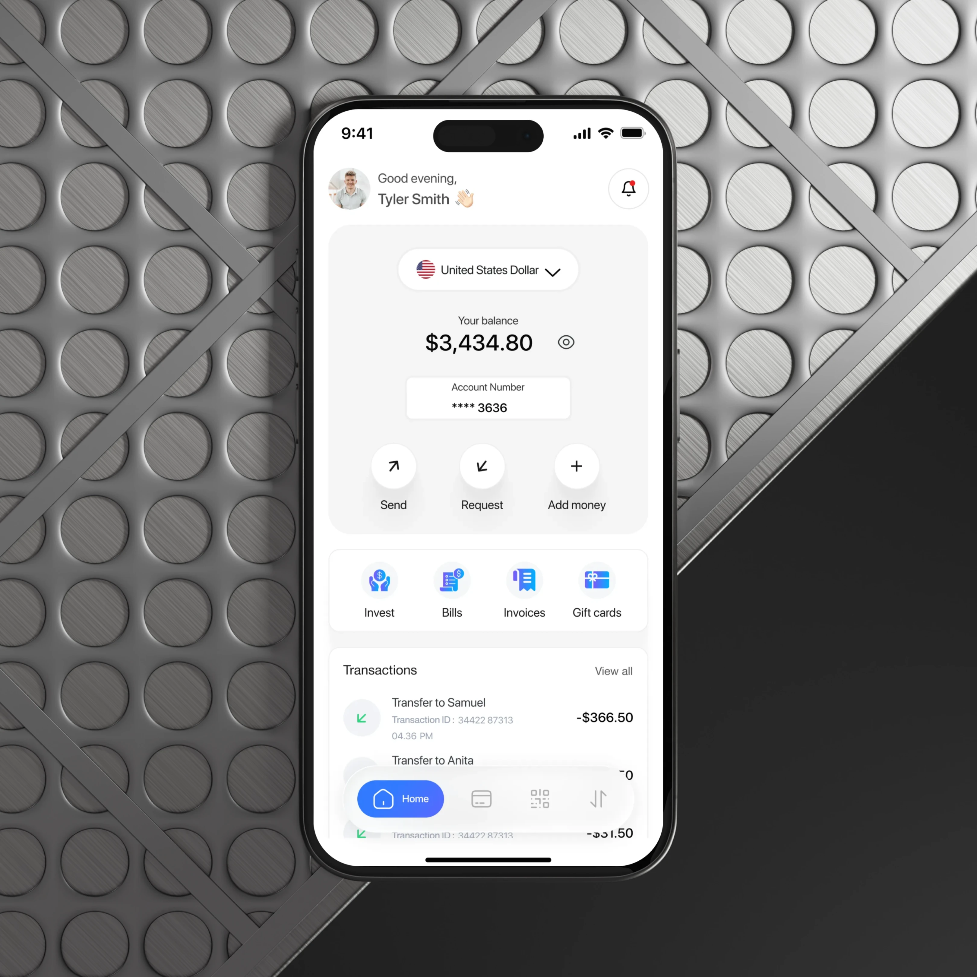 Dashboard: I prioritized balance visibility and quick actions (Send, Request, Add Money). The secondary functions like investing, paying bills, and invoices were neatly grouped to avoid clutter.