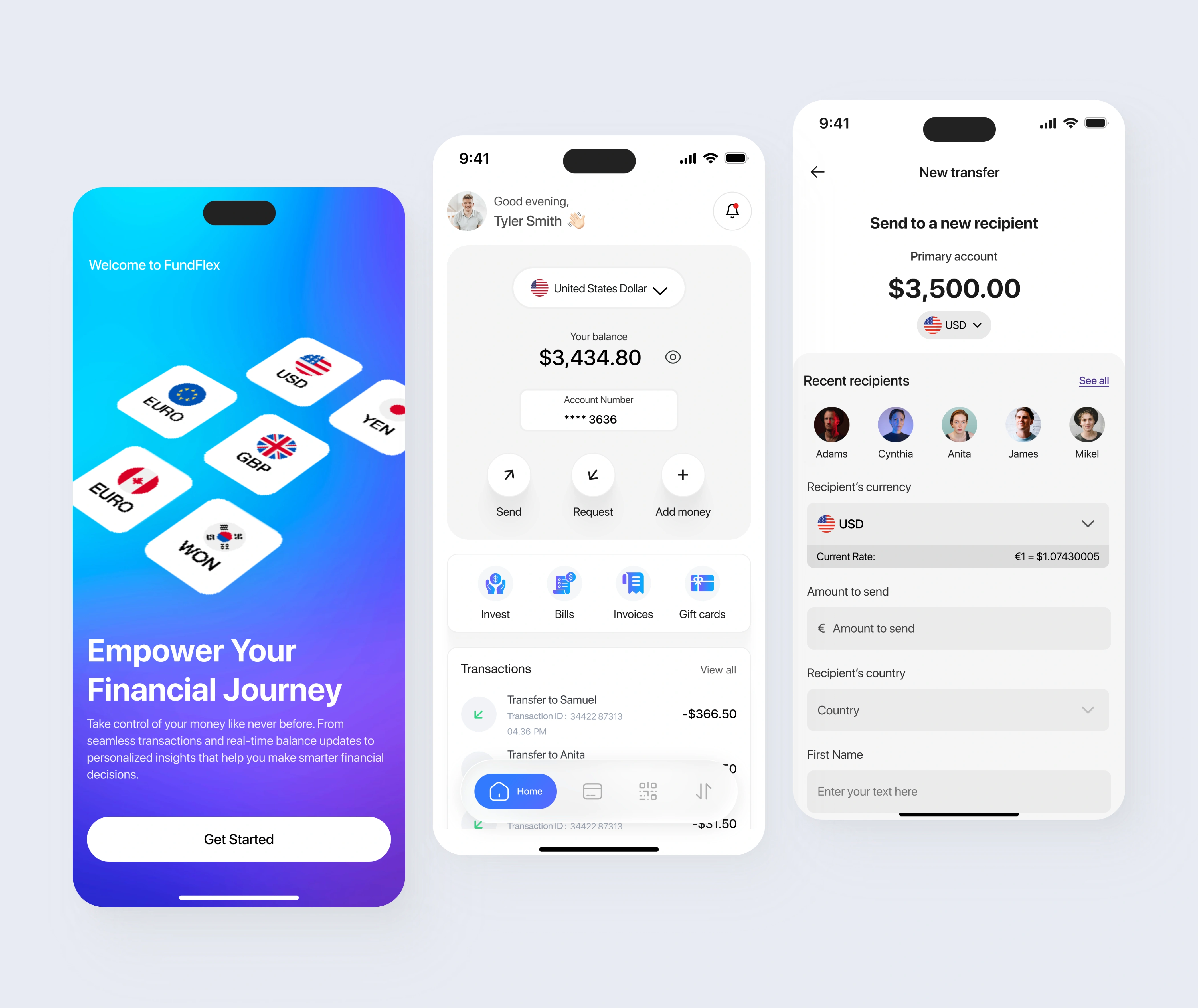 FundFlex is a modern fintech mobile app designed to simplify cross-border payments and personal finance management. The goal was to create a clean, intuitive experience that allows users to manage multiple currencies, track their balances in real time, and perform transactions effortlessly.