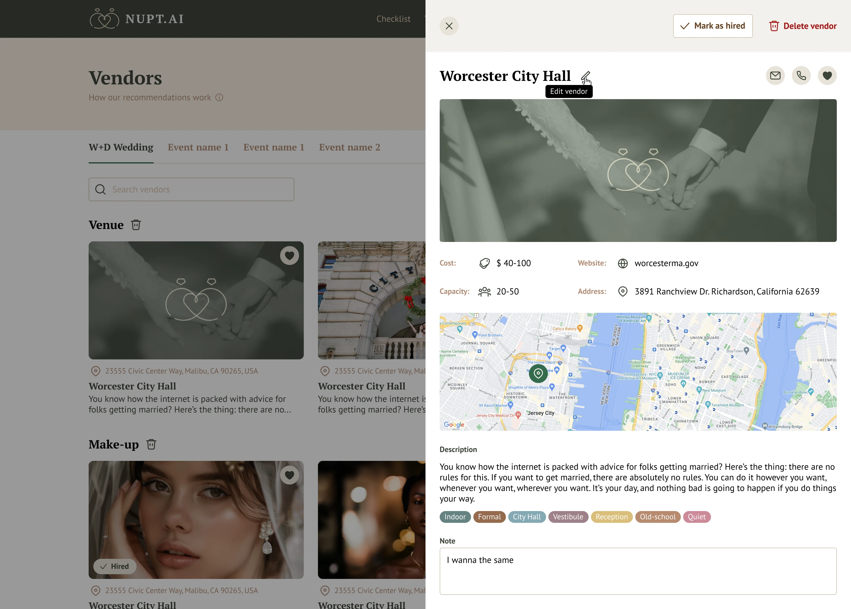 Developed an AI-powered wedding planning SaaS that streamlines the planning process through personalized, data-driven insights. Users input their preferences, location, and budget to receive tailored checklists, vendor recommendations, mood boards, and budget calculations generated by advanced AI models.