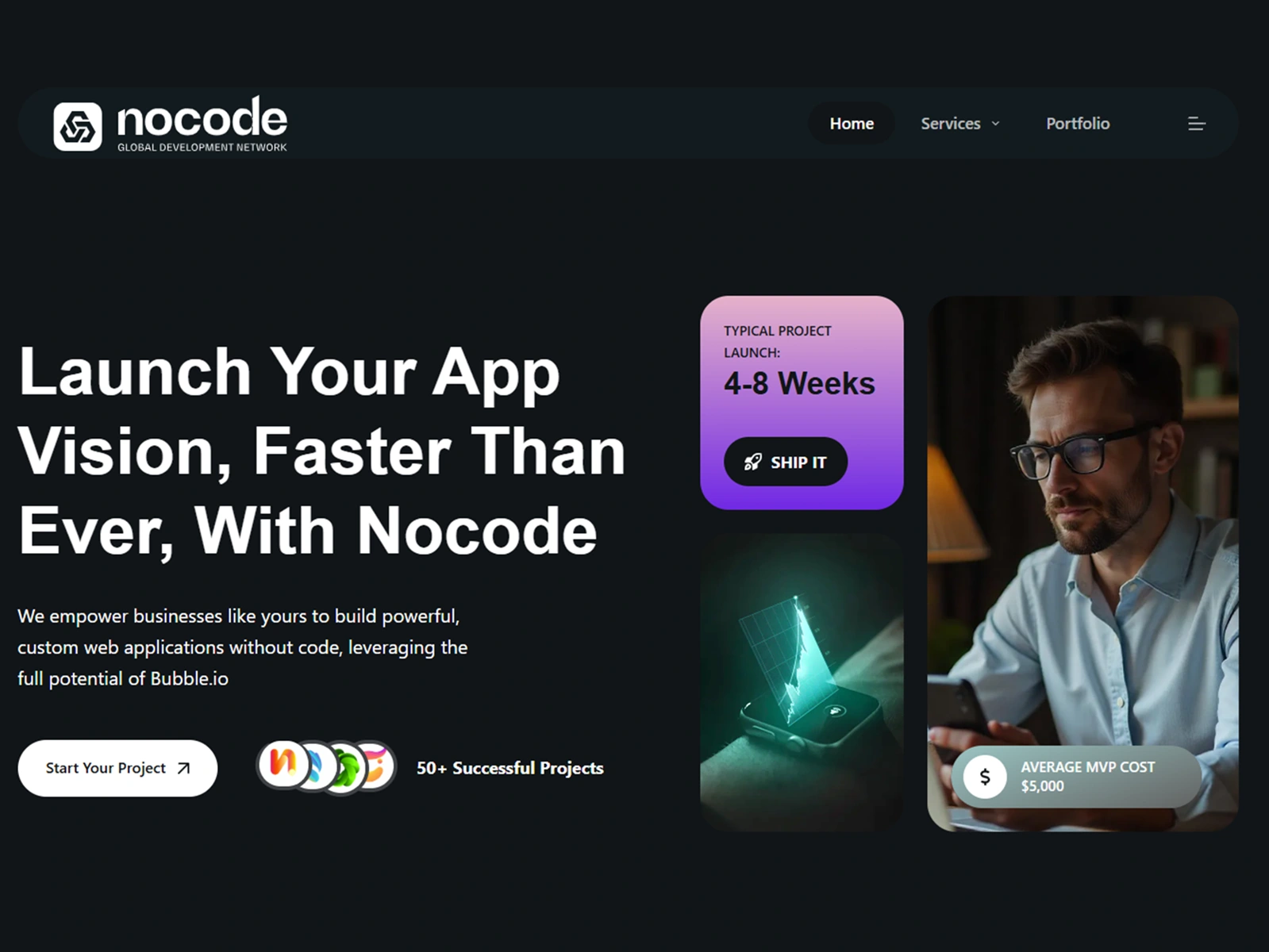 WordPress agency site, nocodegdn.com, showcases a portfolio of 12+ no-code apps, effectively driving lead generation for development projects.