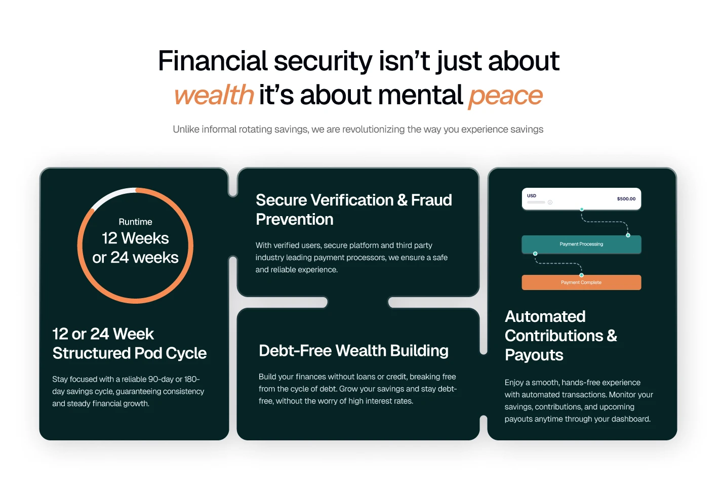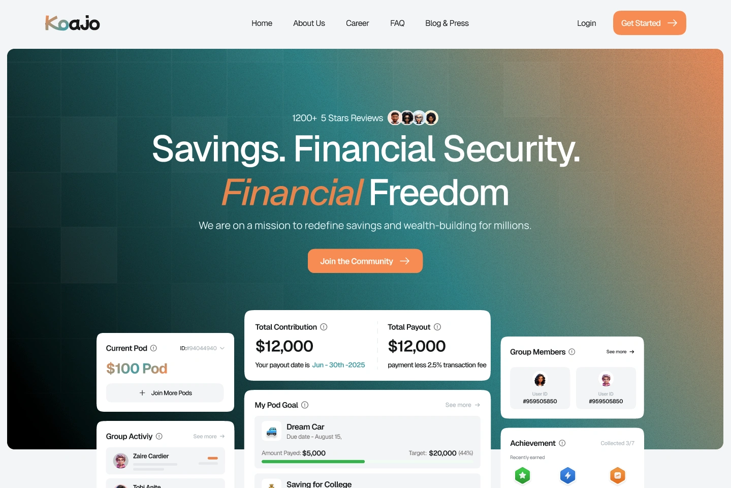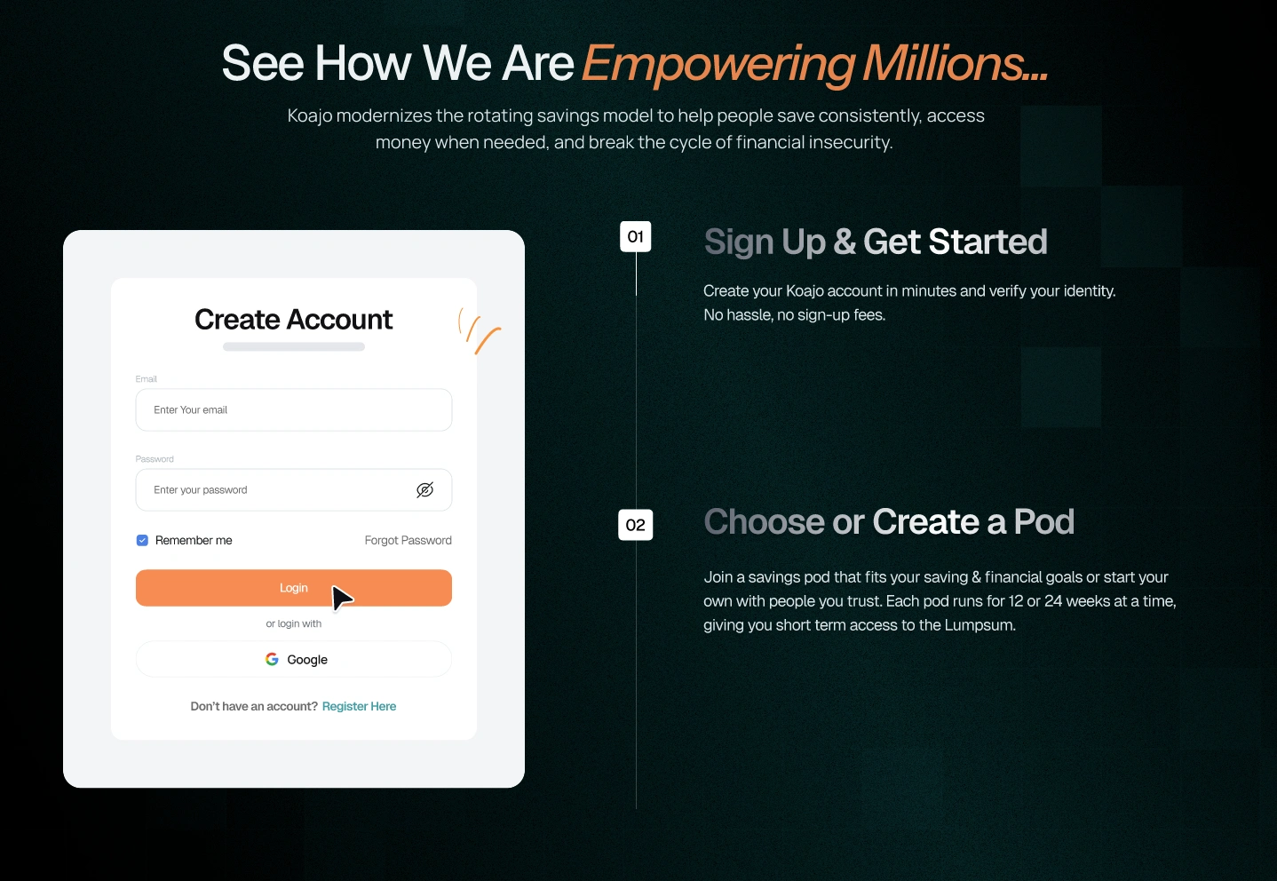 Koajo is a fintech platform that digitizes the traditional rotating savings model (Ajo), transforming a centuries-old community savings practice into a secure, automated, and transparent digital experience. The platform empowers users to build wealth, avoid debt, and achieve financial goals through structured savings pods.