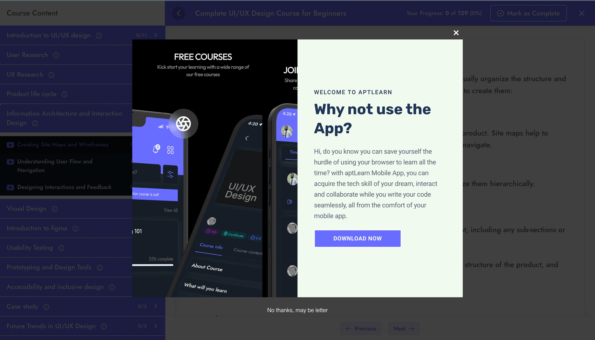 Therefore to keep the overall experience coherent, the next steps (when a user chooses to download the app) must involve providing the learner with more information on how exactly the features we sold to them work. That is, how to learn offline, set learning reminders, etc with the aptLearn mobile app.