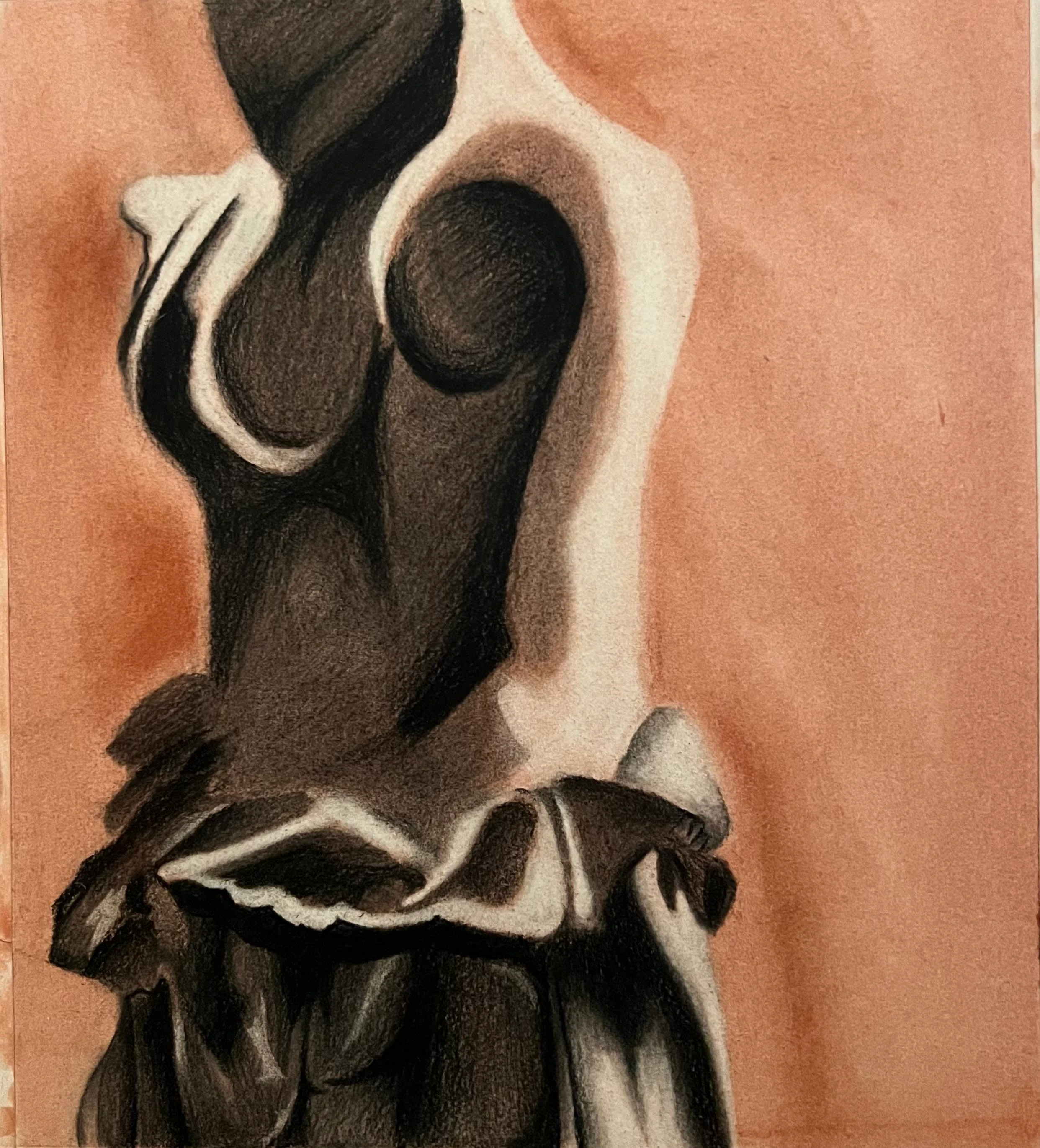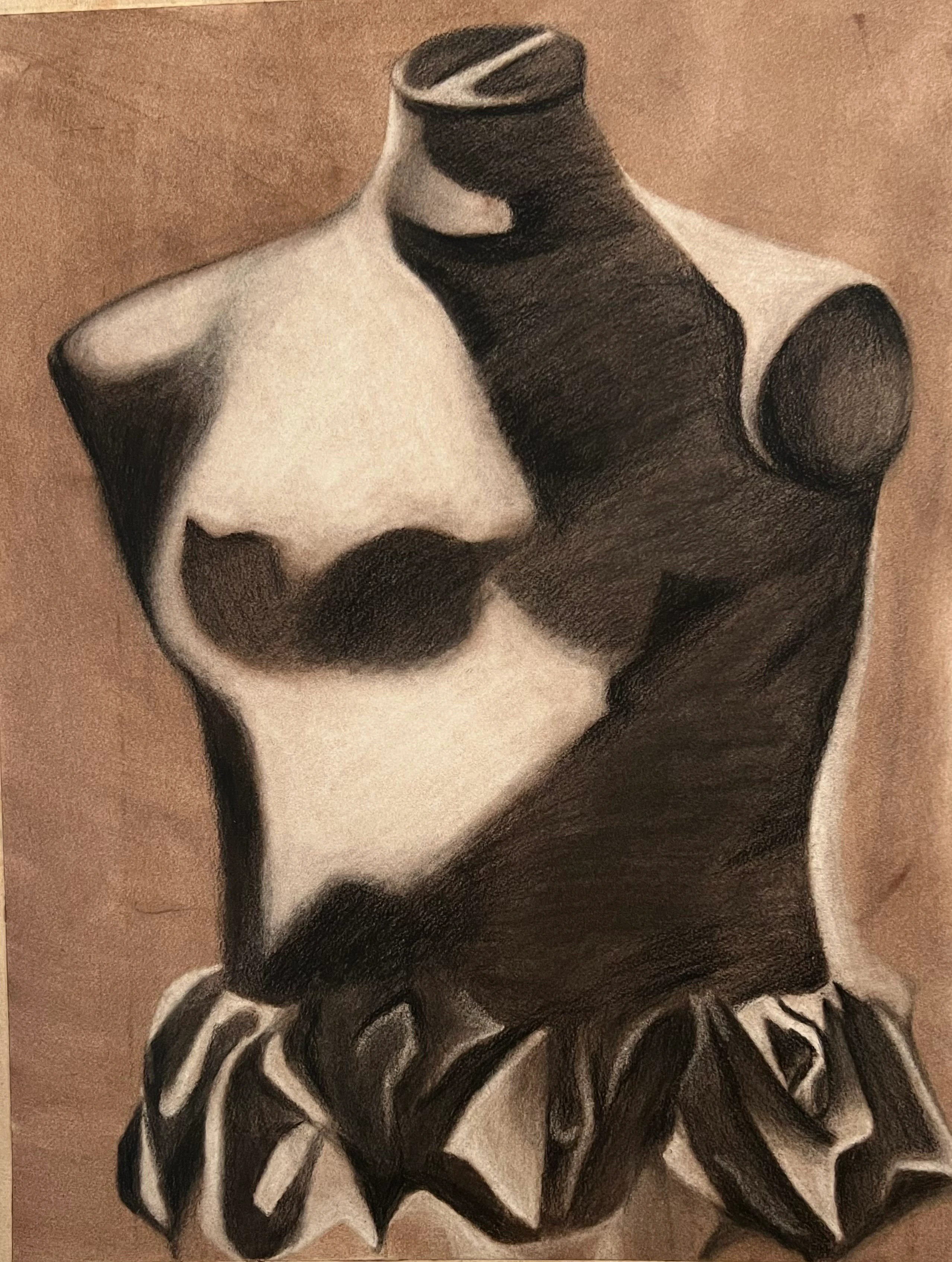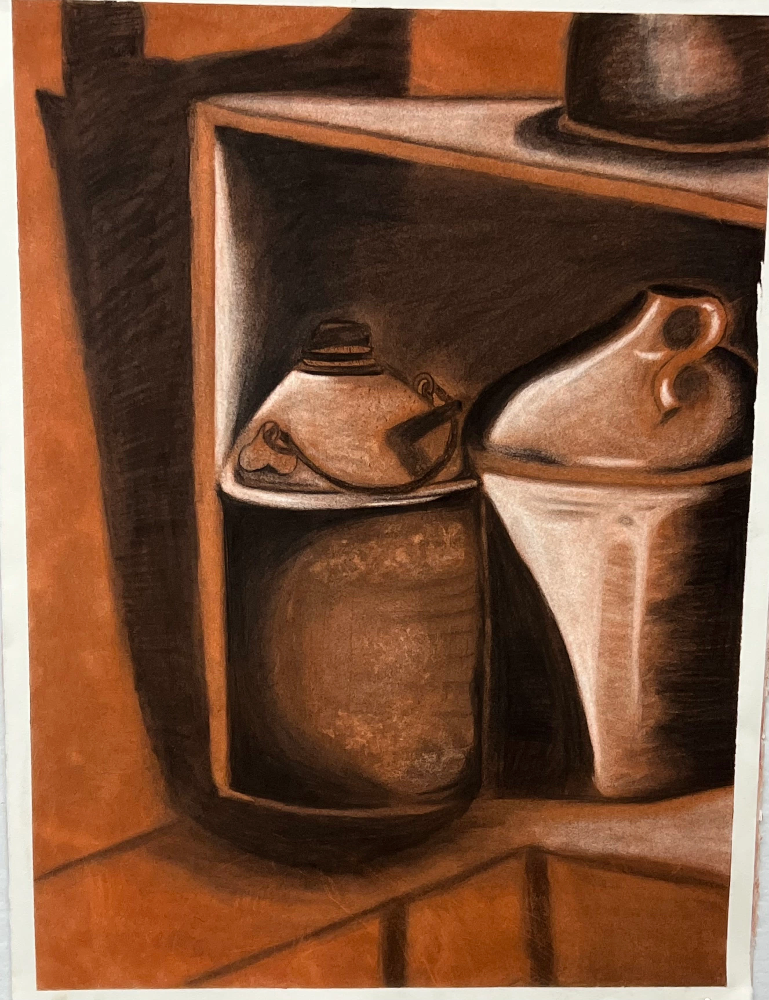 Using only a singular material to create shadows, texture, highlights, and perception. For these pieces, I used solely charcoal and conté for the background and then used erasers and a chamois cloth to show my texture and highlights. These works were done in my DRAW 100 and DRAW 101 classes.