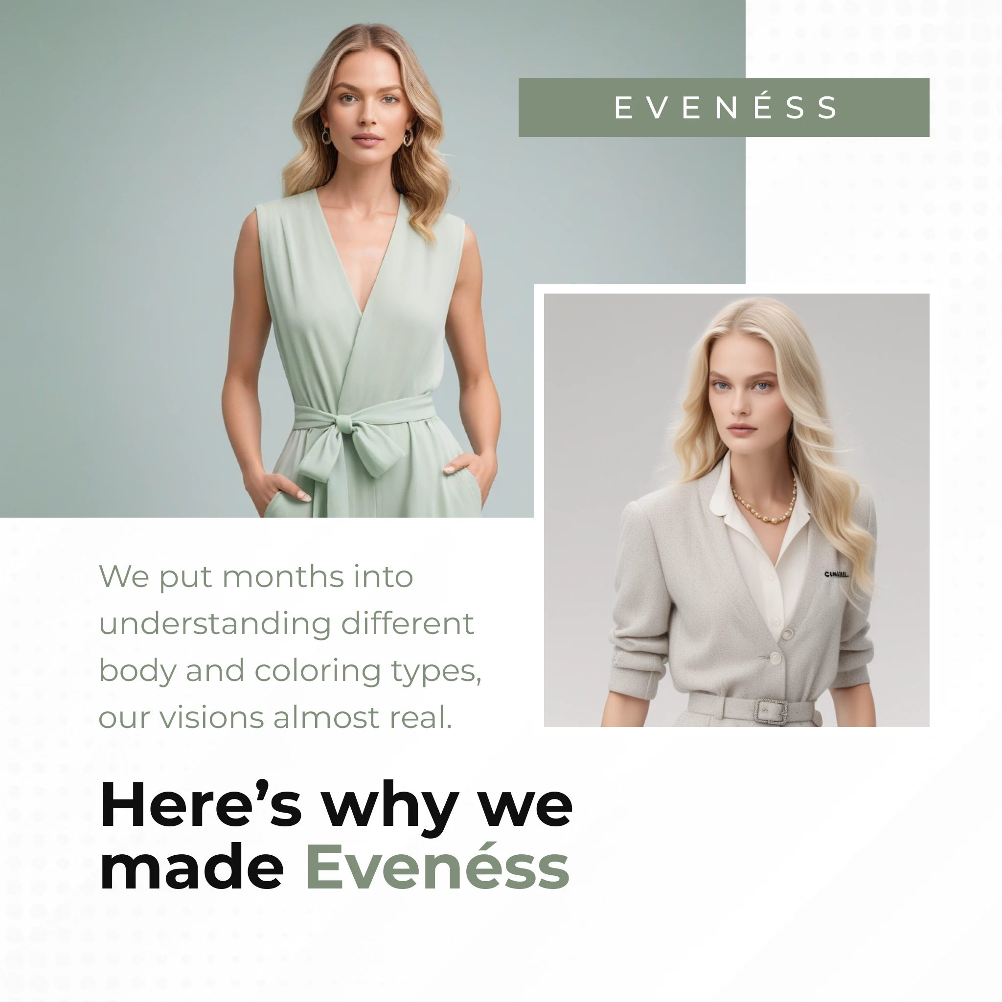 Eveness is an artificial intelligence ecommerce website that help users choose the best outfits for body shape, facial construct, and different weathers.