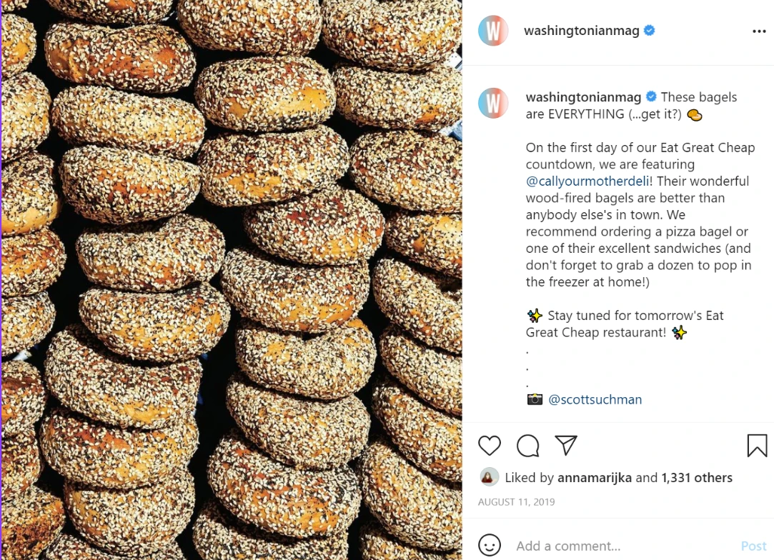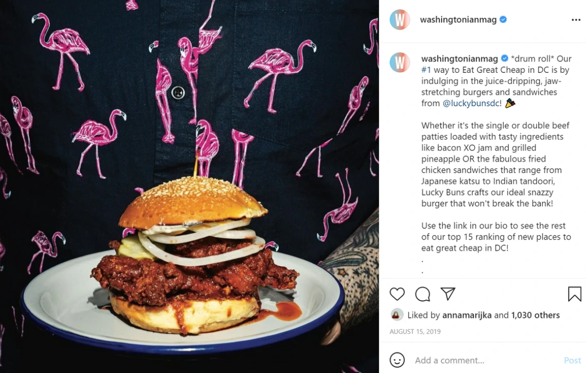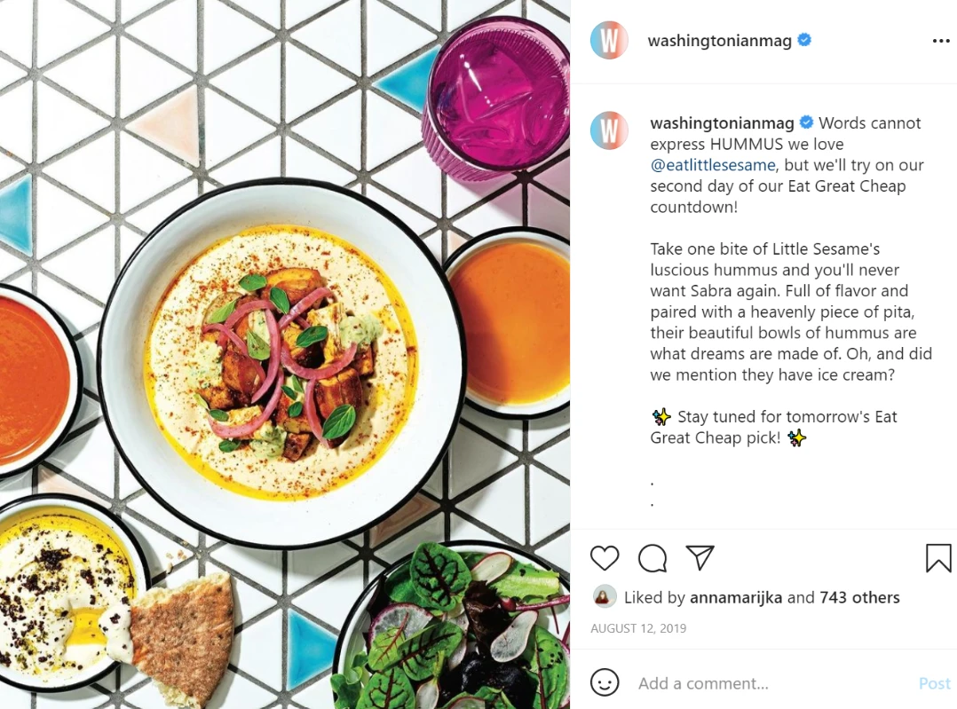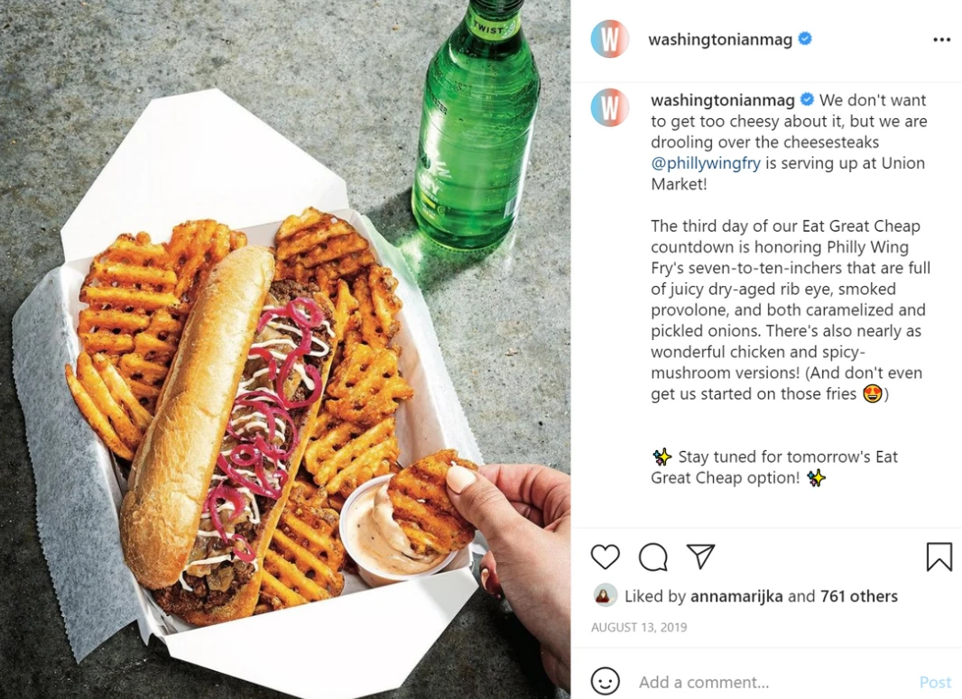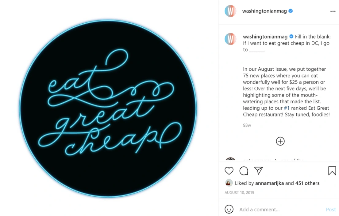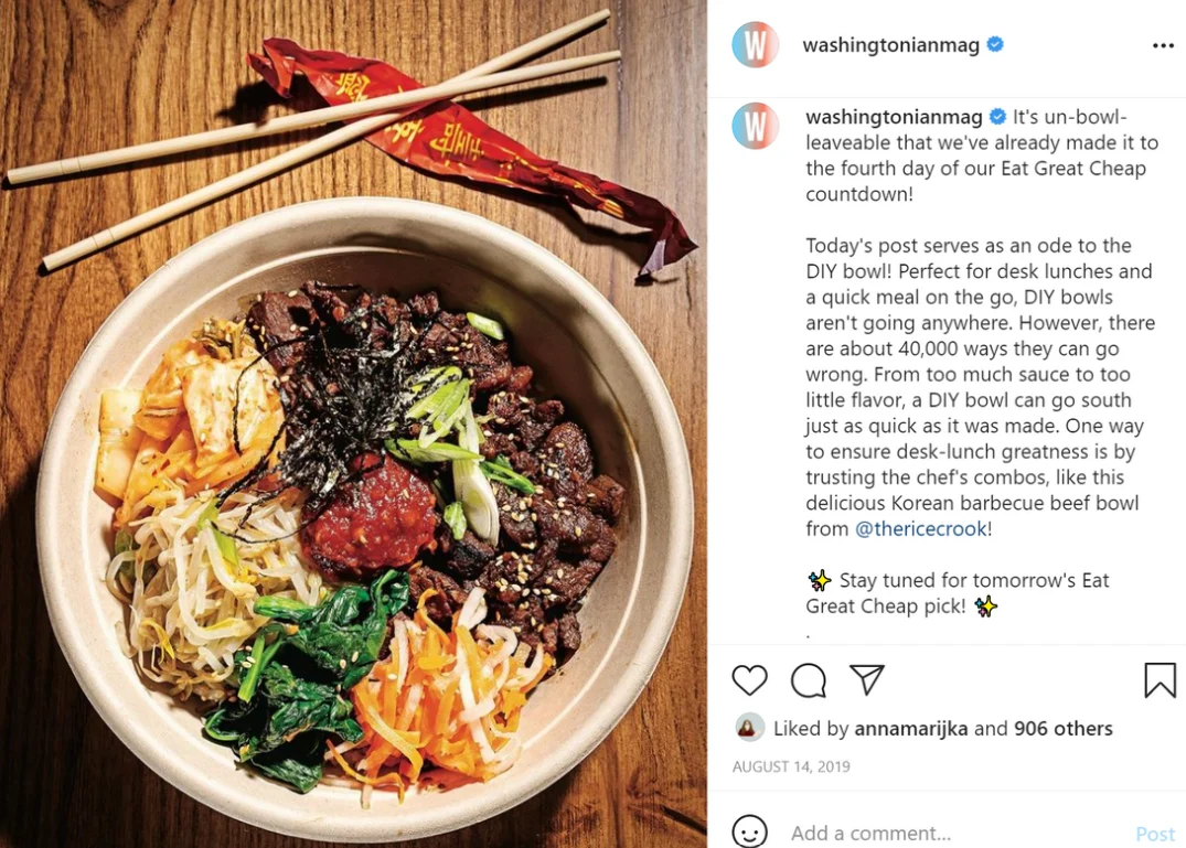 To celebrate Washingtonian’s 2019 Eat Great Cheap list, I launched a five-day Instagram countdown spotlighting 15 top affordable D.C. restaurants. Rather than follow the ranked list, I featured the most eye-catching dishes to maximize engagement, saving the #1 spot for the final reveal. Captions were playful and interactive, sparking conversation and encouraging guesses. The campaign averaged 800 likes and 35 comments per post and became a go-to resource for discovering great local eats.