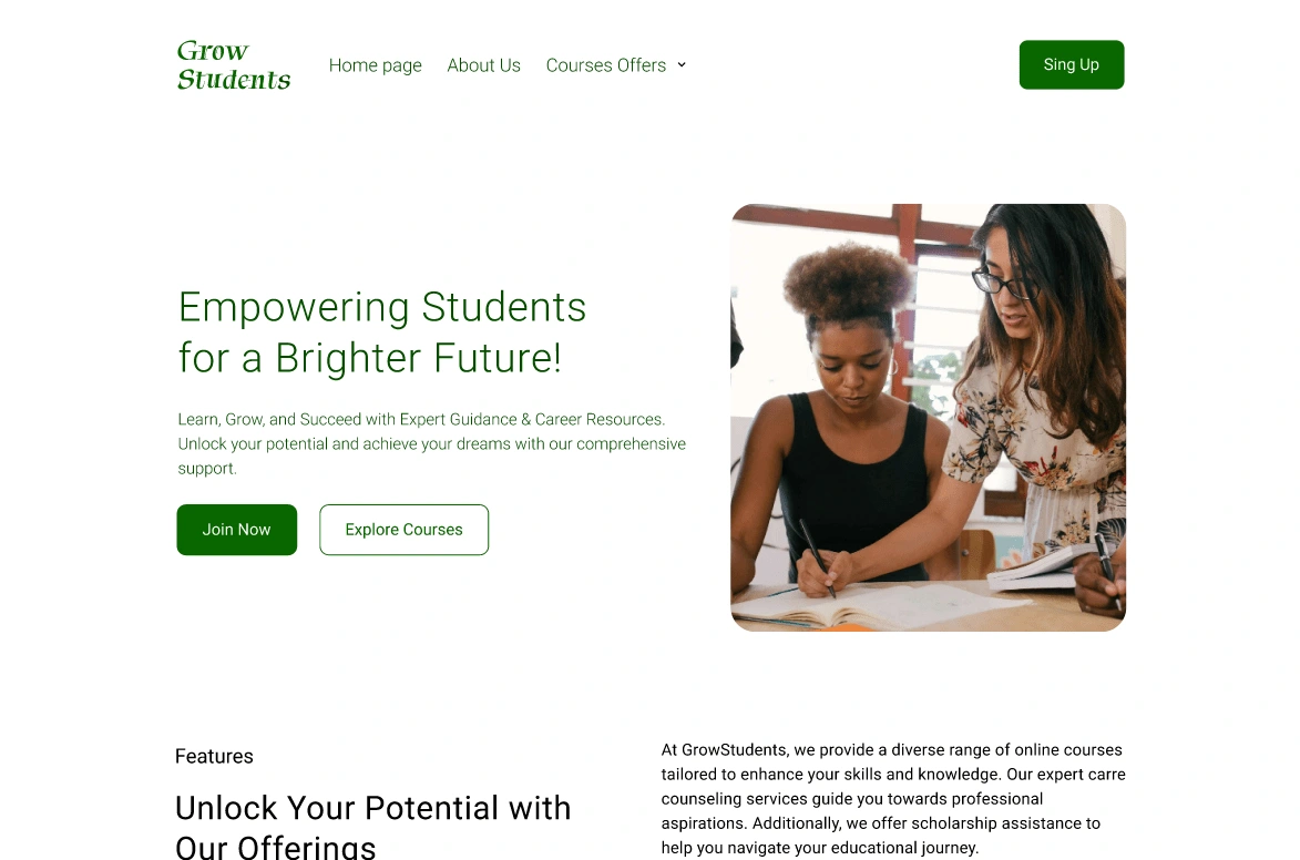 Grow Students is an educational platform designed to empower students with access to online courses, resources, and mentorship. The goal was to create a clean, intuitive, and engaging user experience for students from different backgrounds.