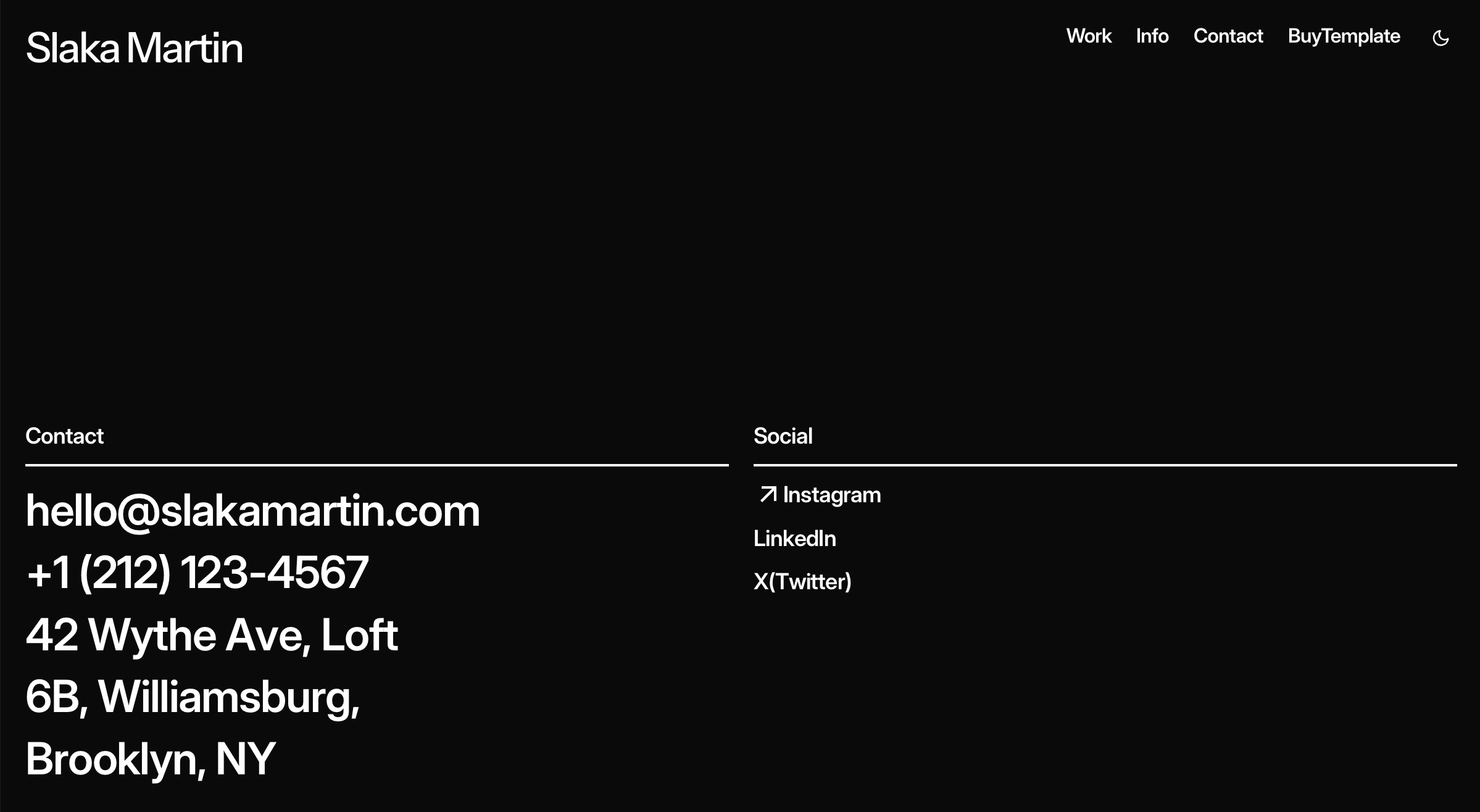Slaka Martin is a Framer portfolio template designed with a horizontal scroll layout, featuring smooth animations and interactive details.