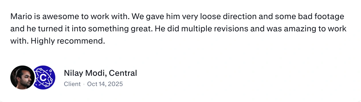 Mario is awesome to work with. We gave him very loose direction and some bad footage and he turned it into something great. He did multiple revisions and was amazing to work with. Highly recommend.