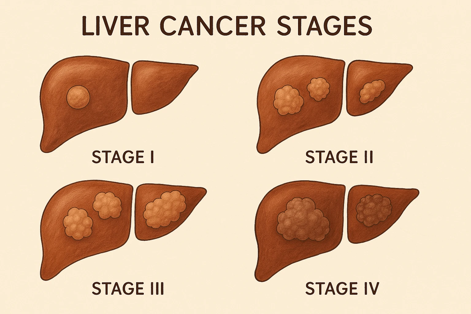 Liver cancer progresses from localized tumors in the early stages to more extensive involvement, including spread to lymph nodes and other organs. Early-stage liver cancer may present with minimal or no symptoms, while advanced stages often involve jaundice, weight loss, abdominal pain, and fluid accumulation. The speed of progression varies depending on tumor biology and underlying liver health. In some cases, liver cancer can progress rapidly, especially in patients with pre-existing liver disease.
