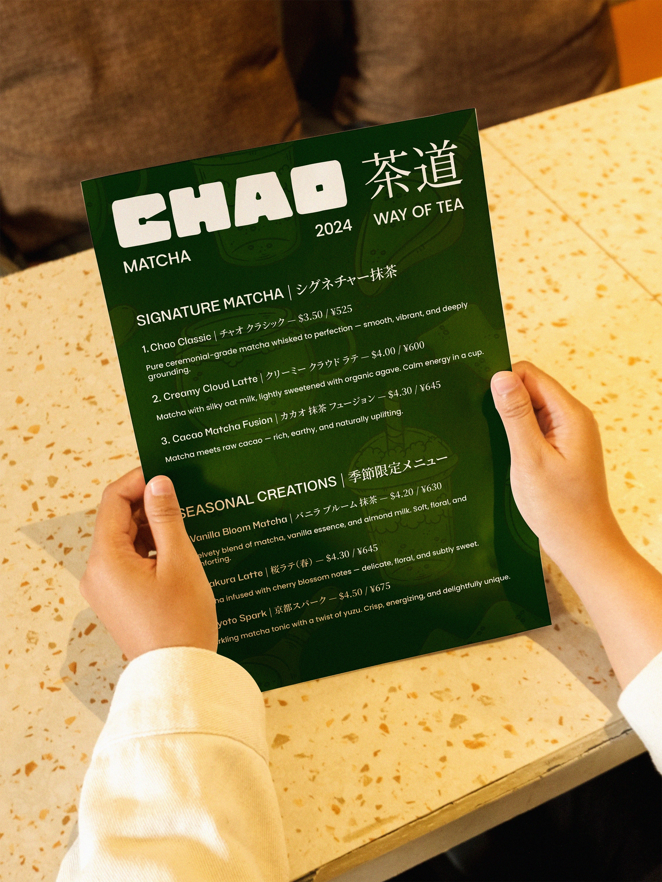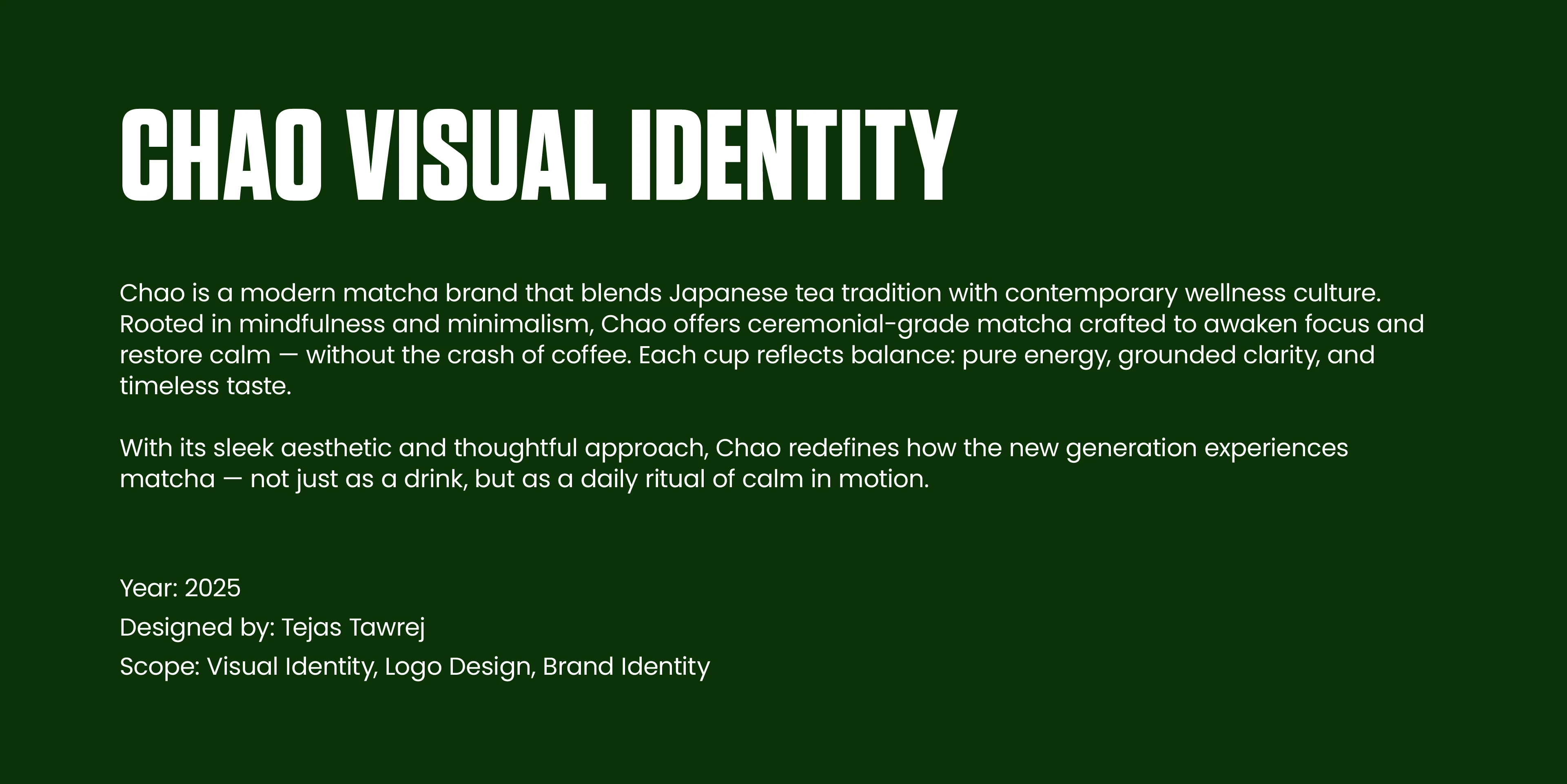 Chao is a contemporary matcha brand that brings Japanese tea traditions into modern living. Rooted in mindfulness and balance, Chao promotes calm energy and focus through its ceremonial-grade matcha products. To reflect this philosophy, I designed a complete visual identity system that embodies Chao’s essence, minimal, grounded, and serene. The new identity balances Japanese-inspired harmony with a clean modern aesthetic, creating a brand presence that feels pure, mindful, and unmistakably calm.