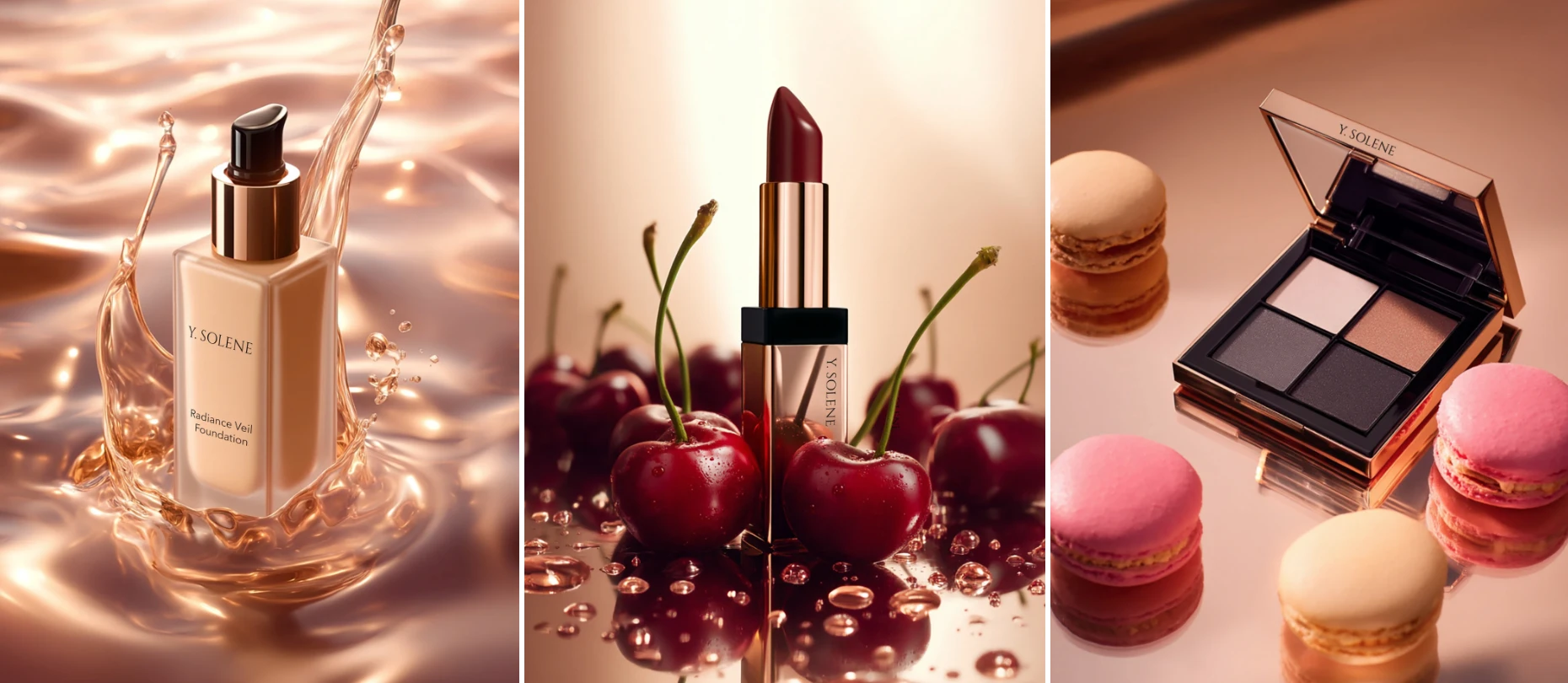 I imagined Y. Solene as a glamorous, rose-gold–tinted makeup brand and built a full set of images around that idea.