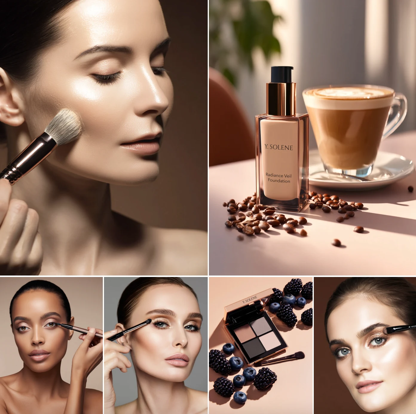 Luxury beauty visuals for Y. Solene — AI Brand Photography campaign mixing glam portraits, playful flat-lays, and polished product shots.