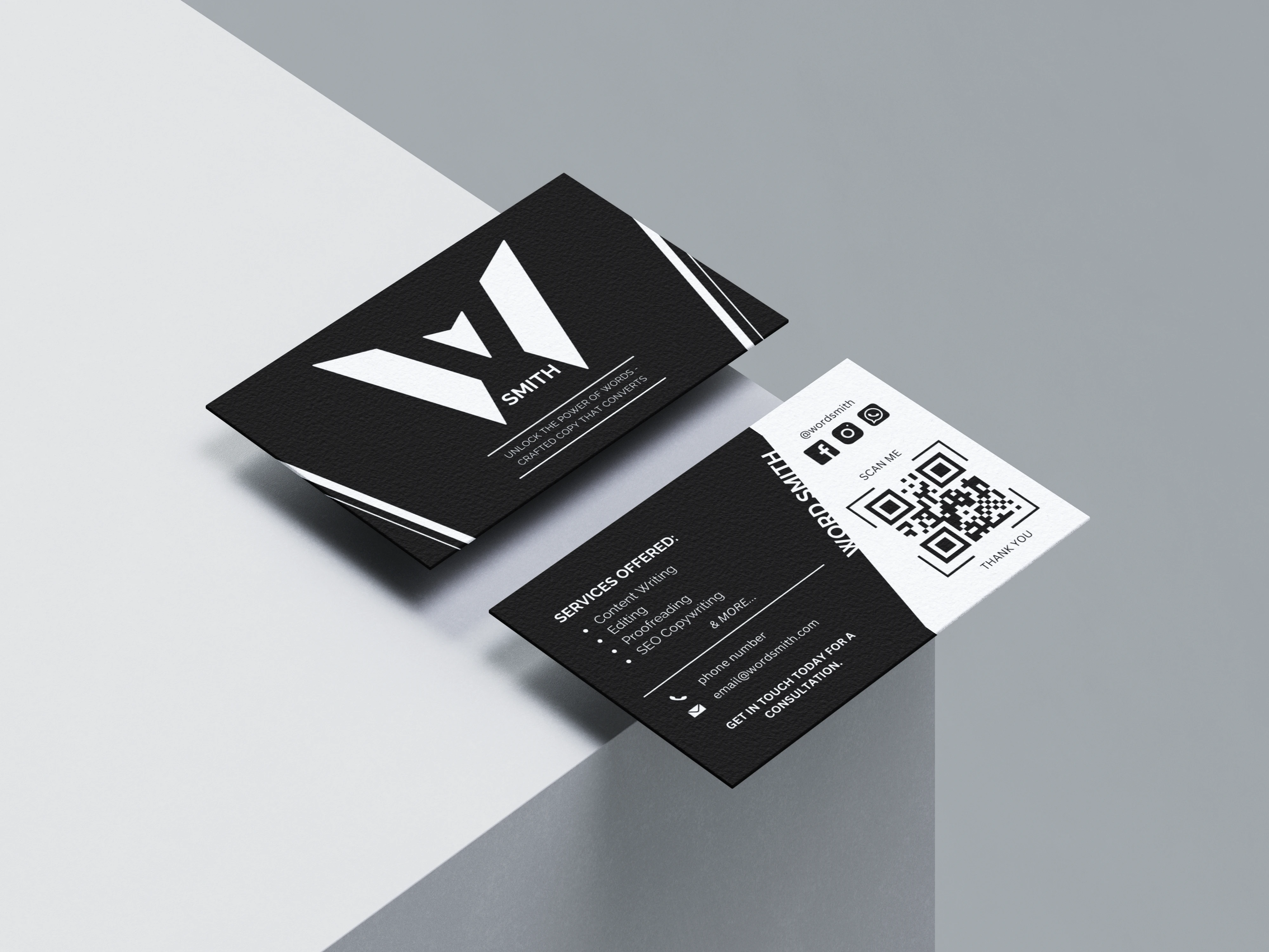A professional set of business cards for a copywriting firm, showcasing a sleek and modern aesthetic.