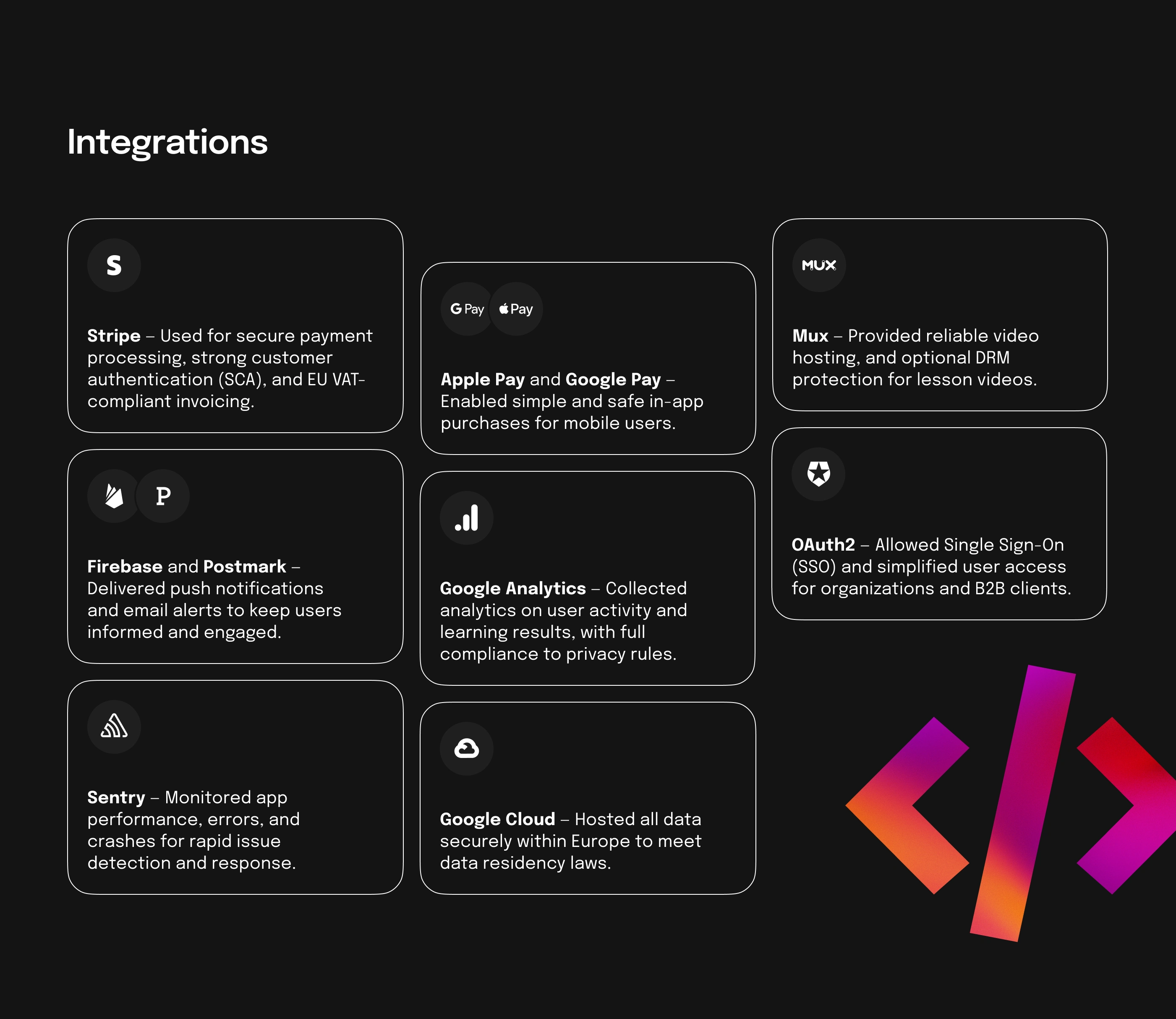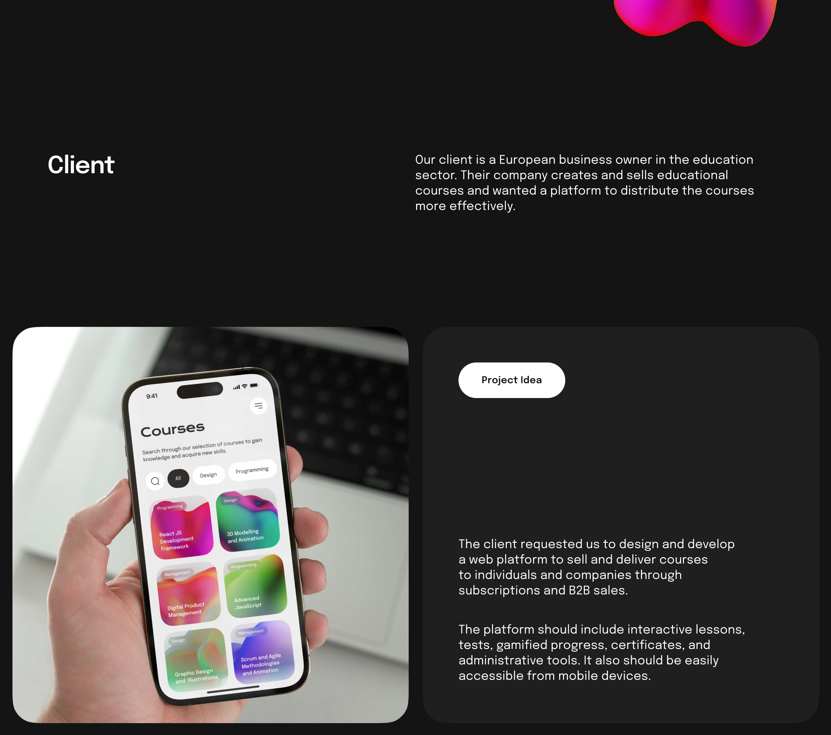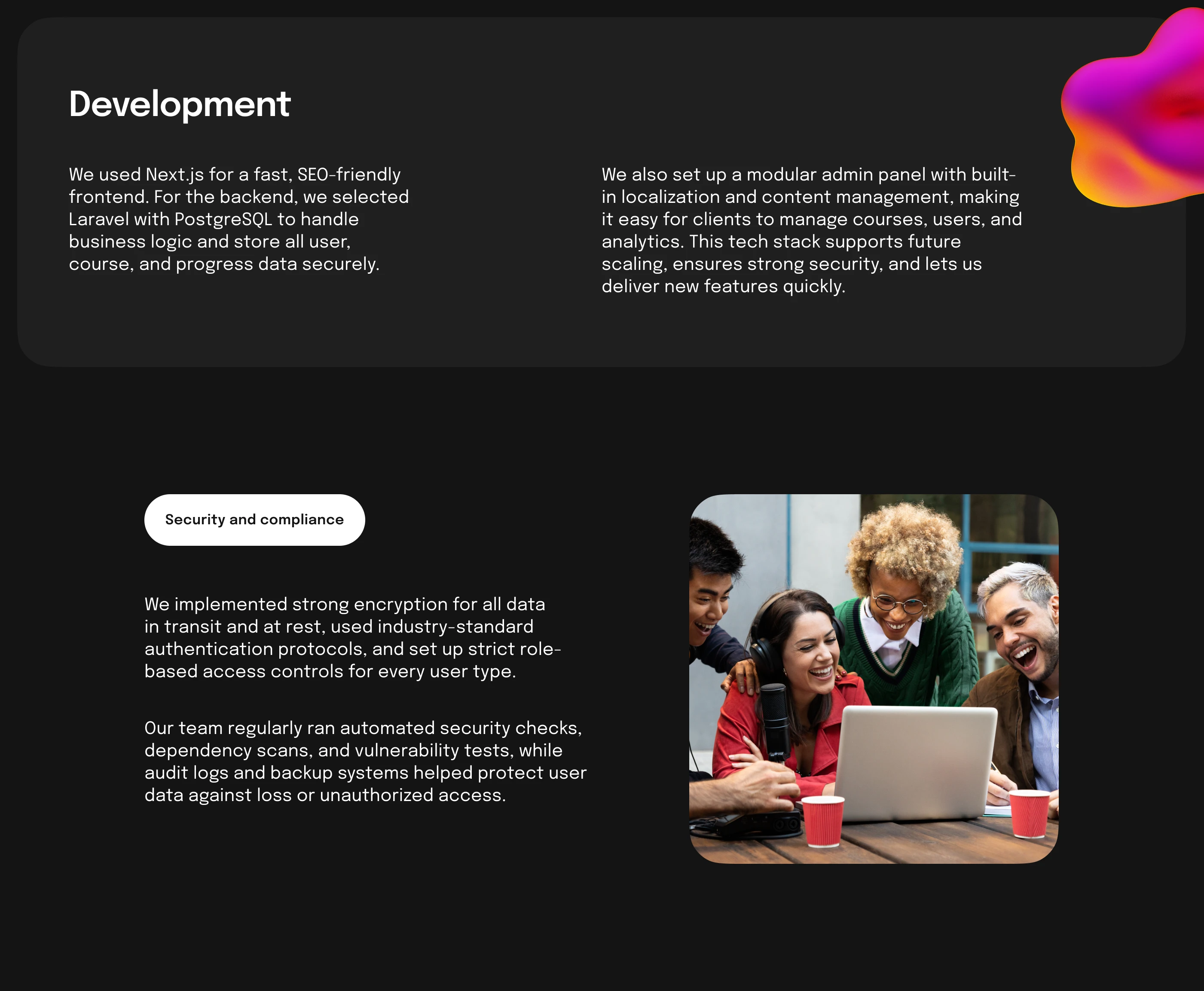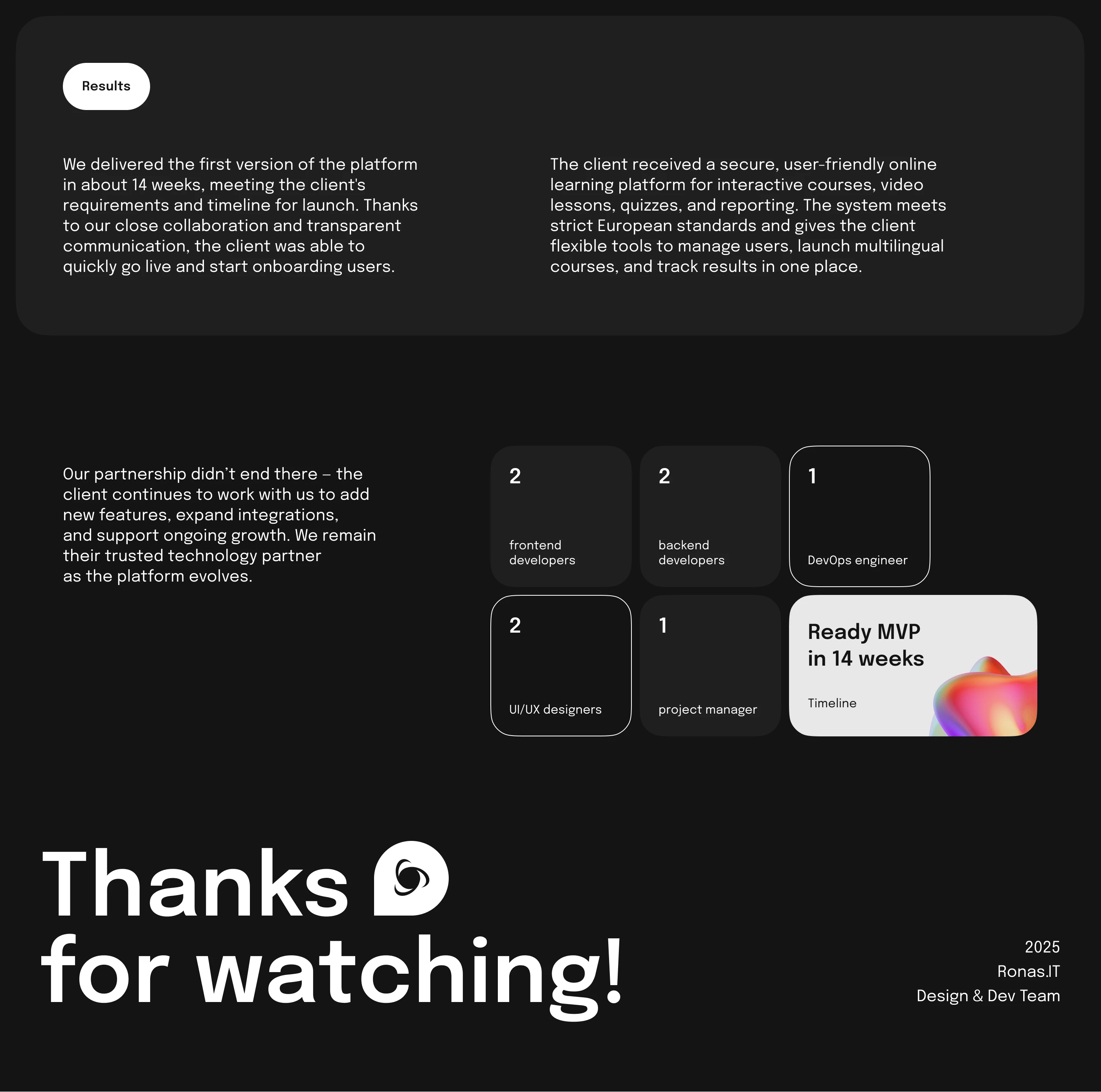 Looking for expert EdTech web development or a European online learning platform that supports B2B sales? Ronas IT specializes in building secure, accessible, and scalable educational web apps. Our expertise covers full UI/UX design, robust web platform development with Next.js and Laravel, and integrating features like gamification, video lessons, and comprehensive admin tools. We ensure full GDPR compliance and WCAG 2.2 AA accessibility for the European market. Partner with us to create your next-generation online education platform for individuals or B2B sales, and transform how you deliver digital learning.