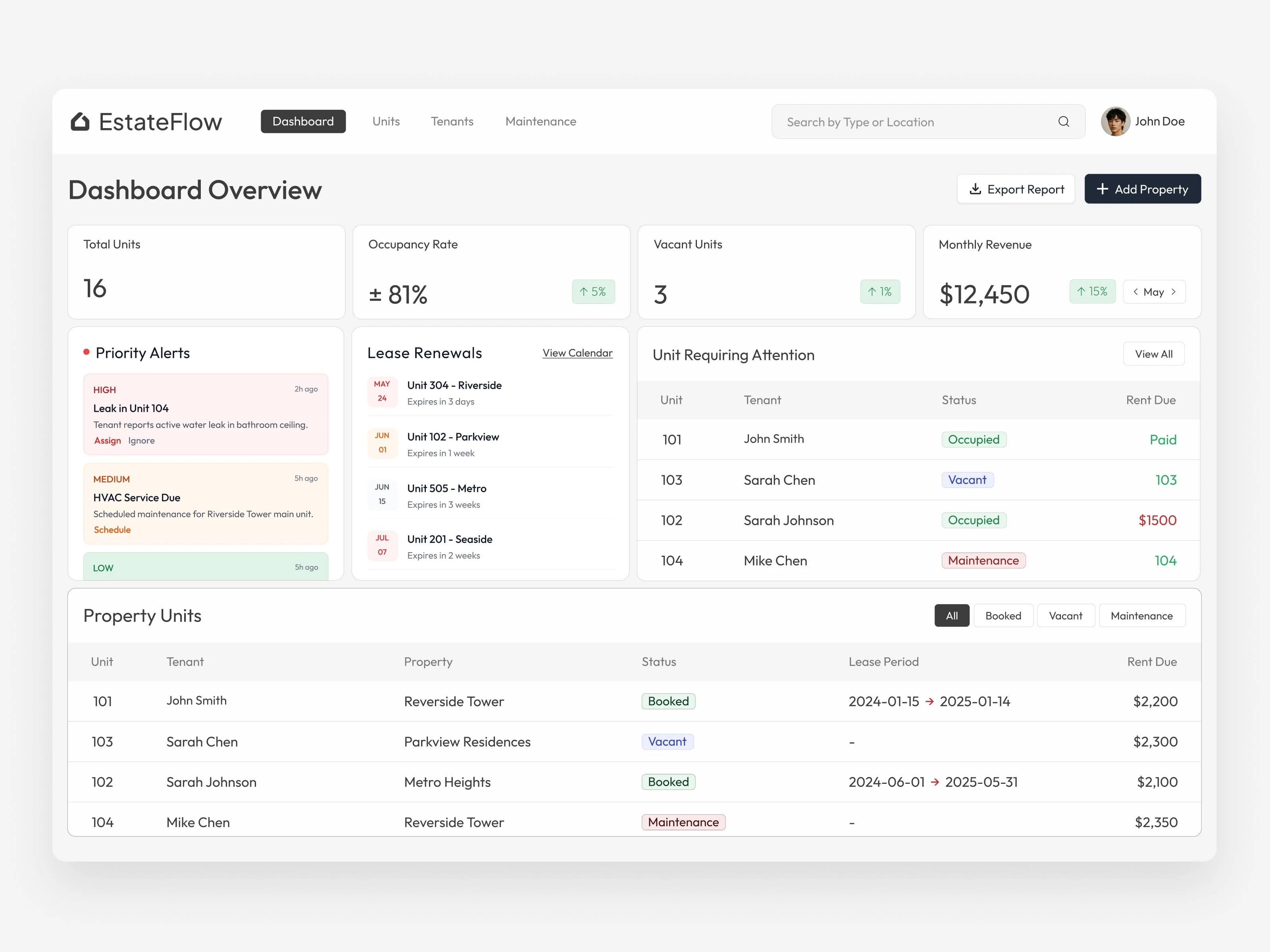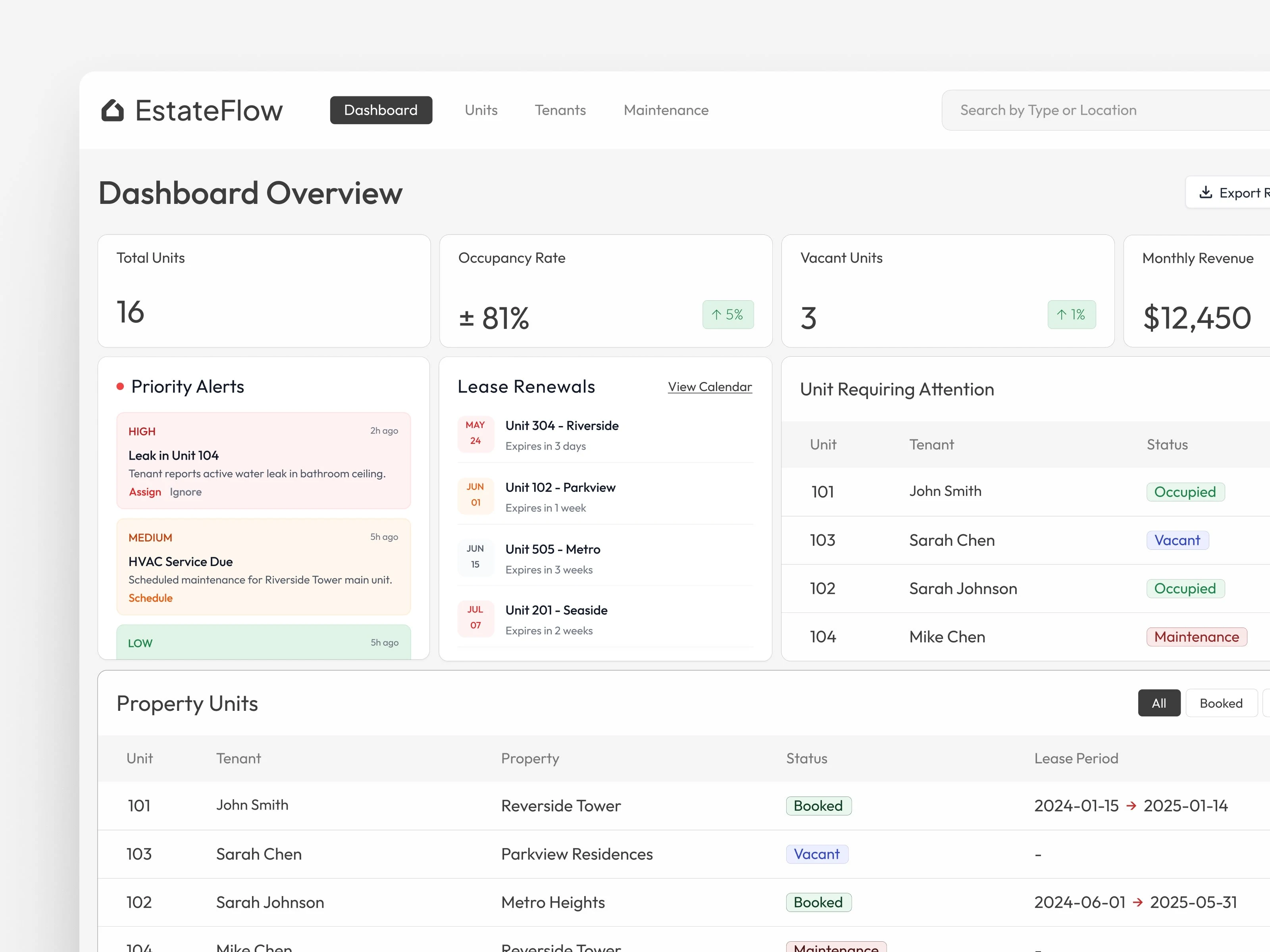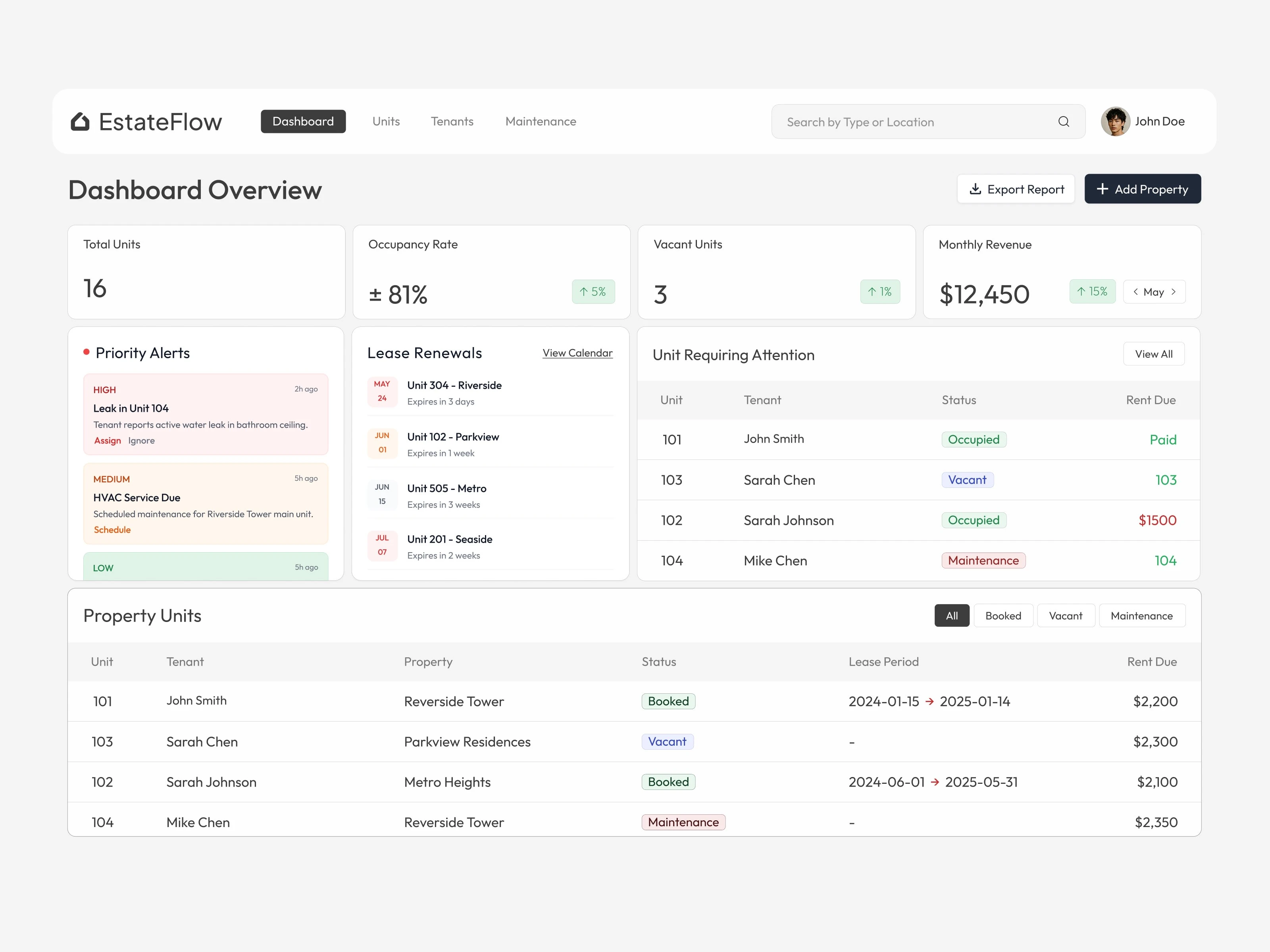 Main Dashboard: a real time overview of occupancy rates, revenue performance, pending payments, and maintenance status for quick decision making